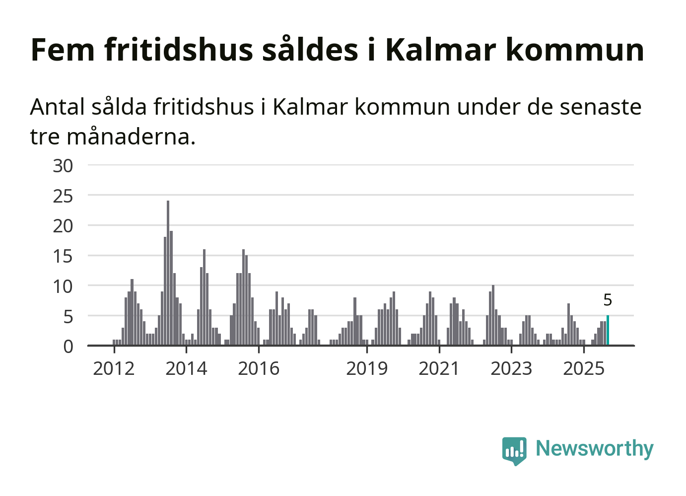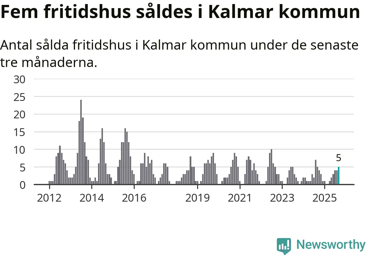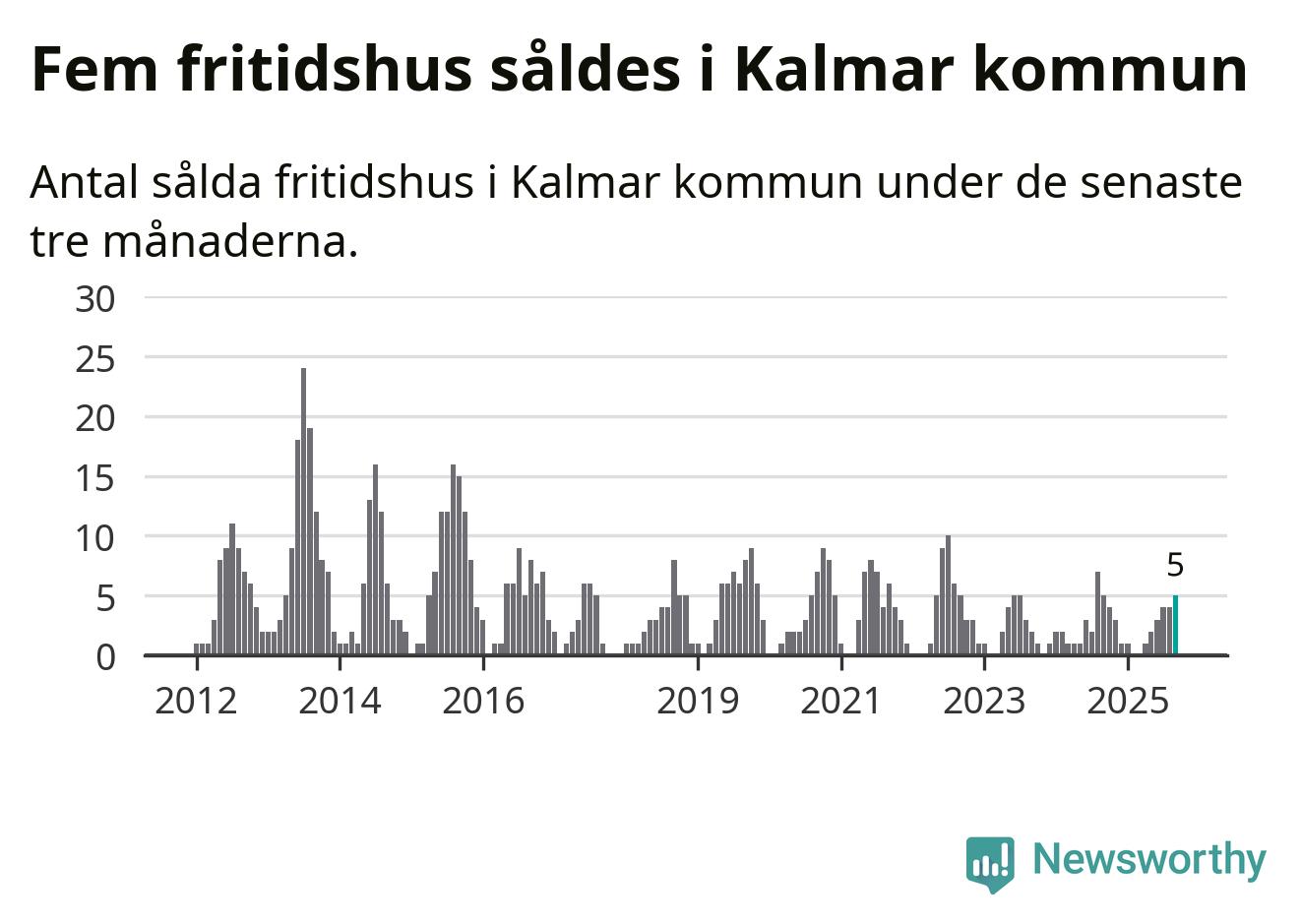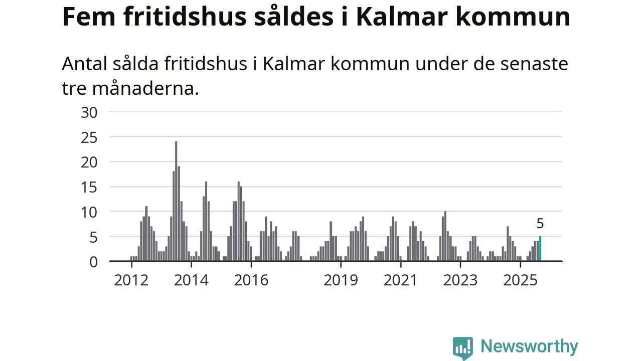 Mellan juli och september gjordes sammanlagt fem affärer med fritidshus i Kalmar kommun. Det är lika många affärer som vid motsvarande tid i fjol.