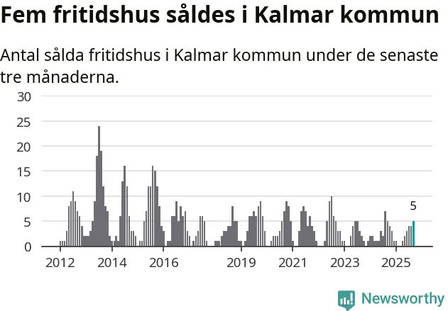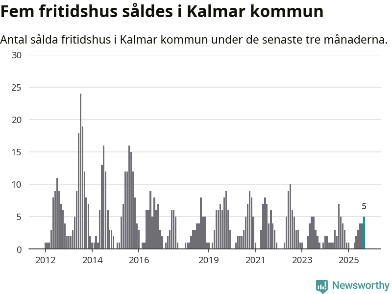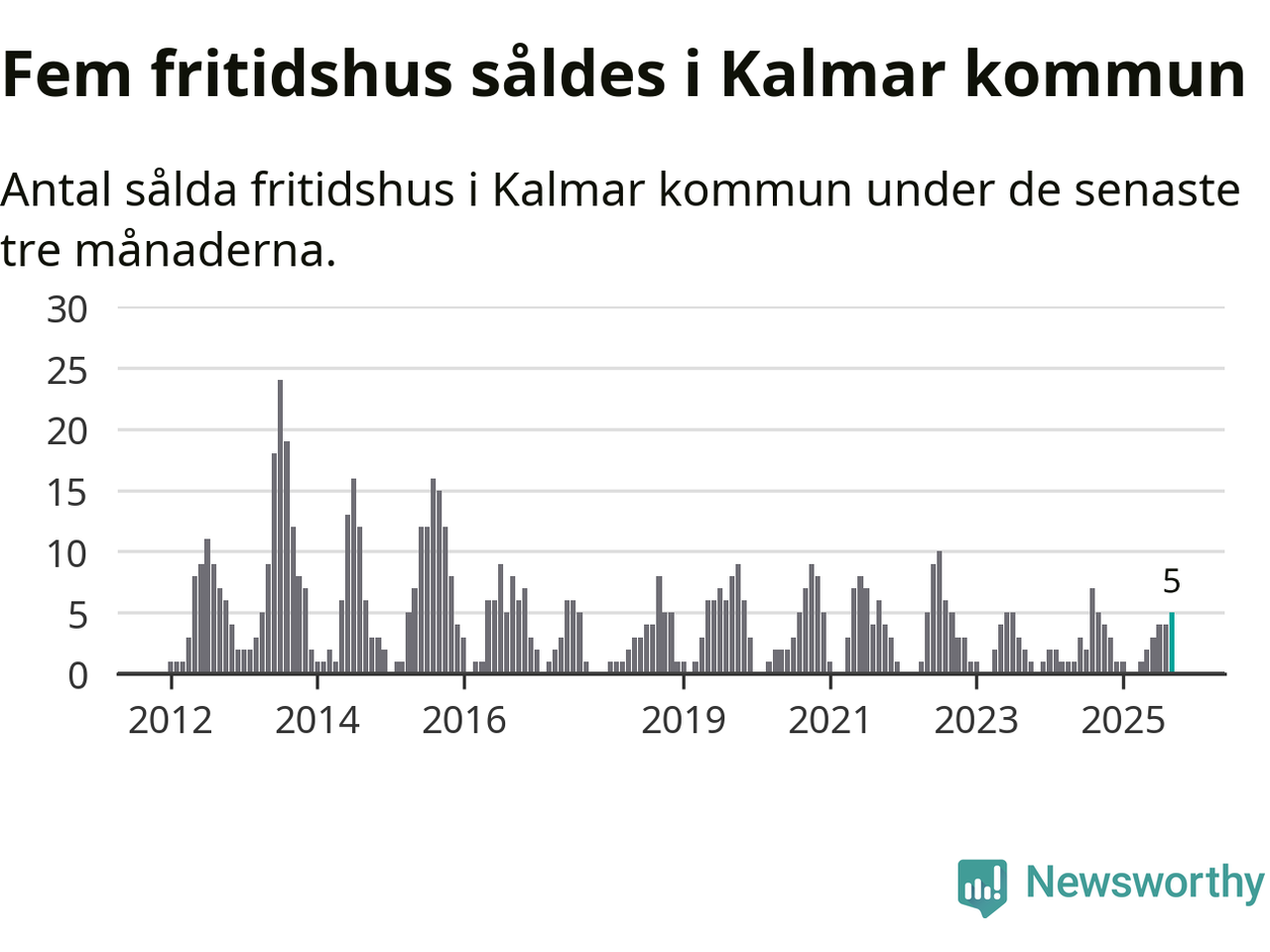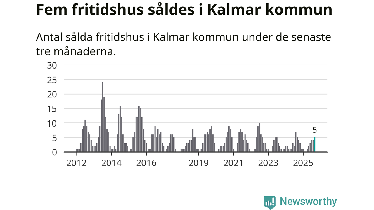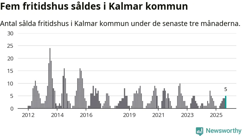 Mellan juli och september gjordes sammanlagt fem affärer med fritidshus i Kalmar kommun. Det är lika många affärer som vid motsvarande tid i fjol.