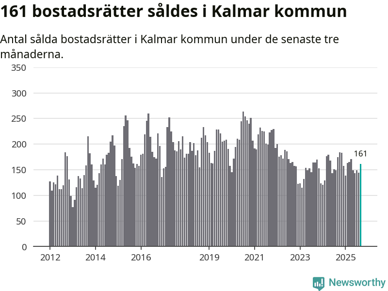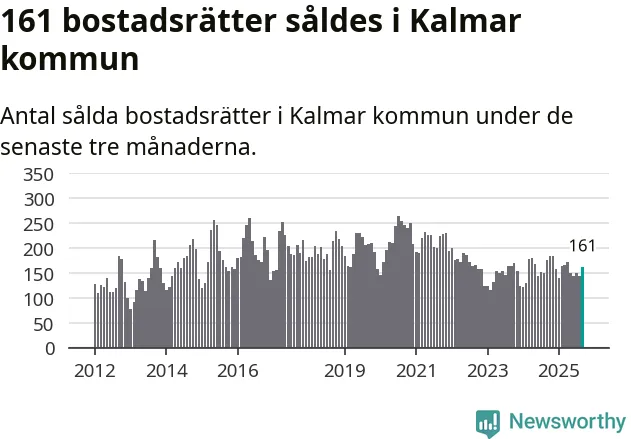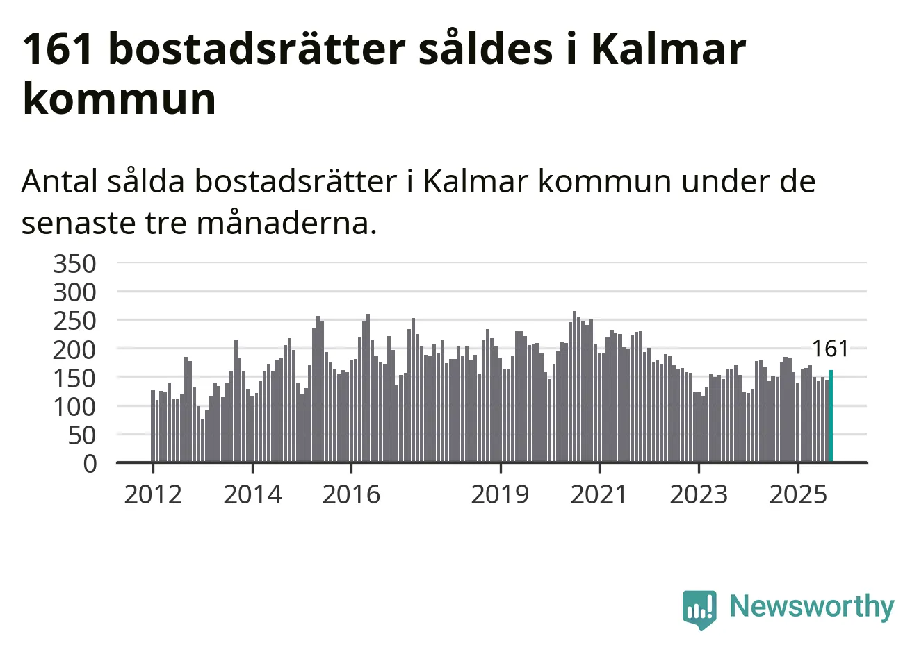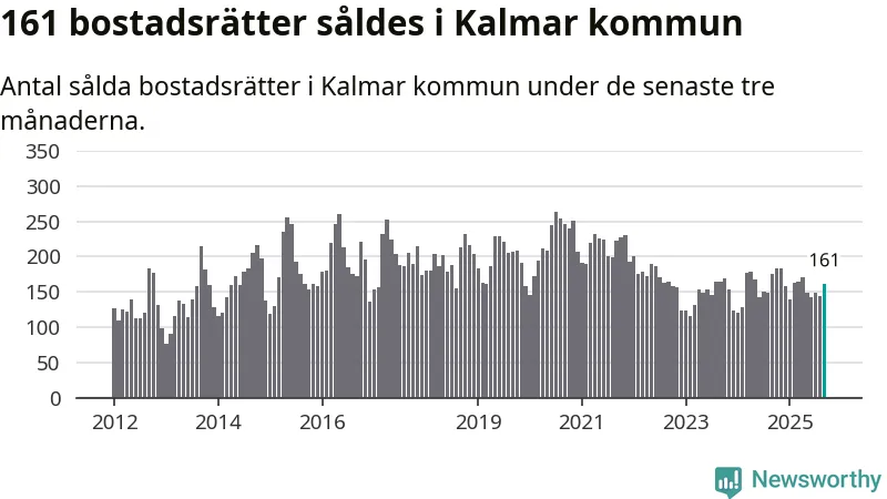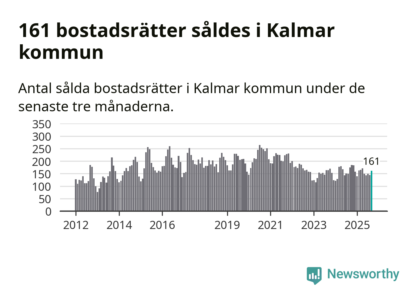 Sammanlagt såldes 161 bostadsrätter i Kalmar kommun mellan juli och september till ett genomsnittligt pris på 1,5 miljoner kronor. I fjol gjordes 175 affärer vid den här tiden på året.