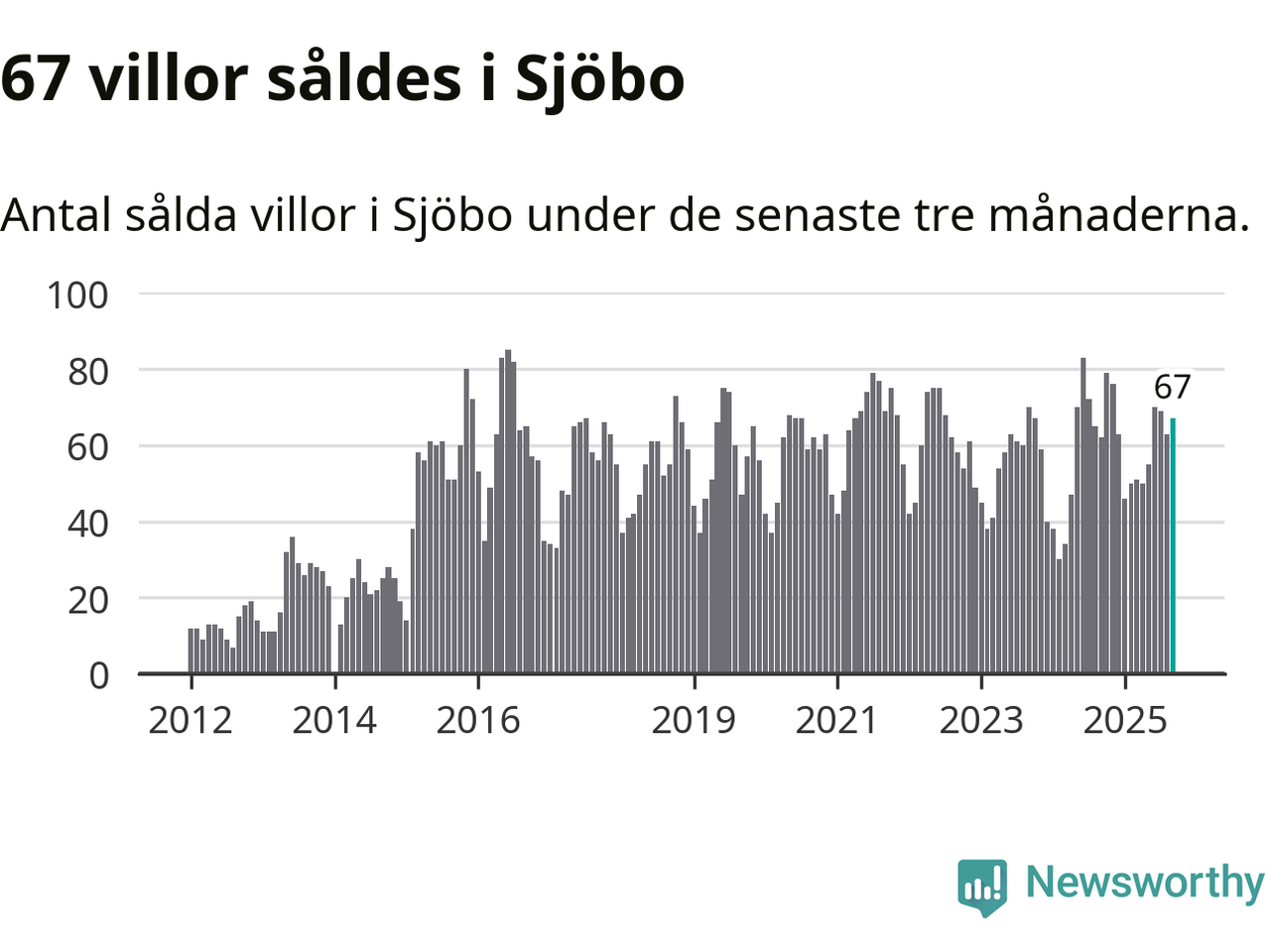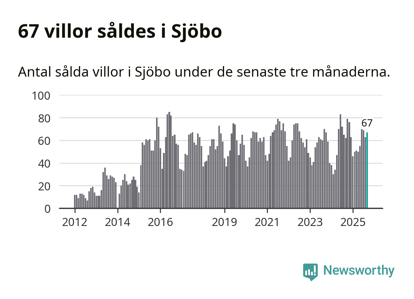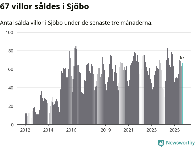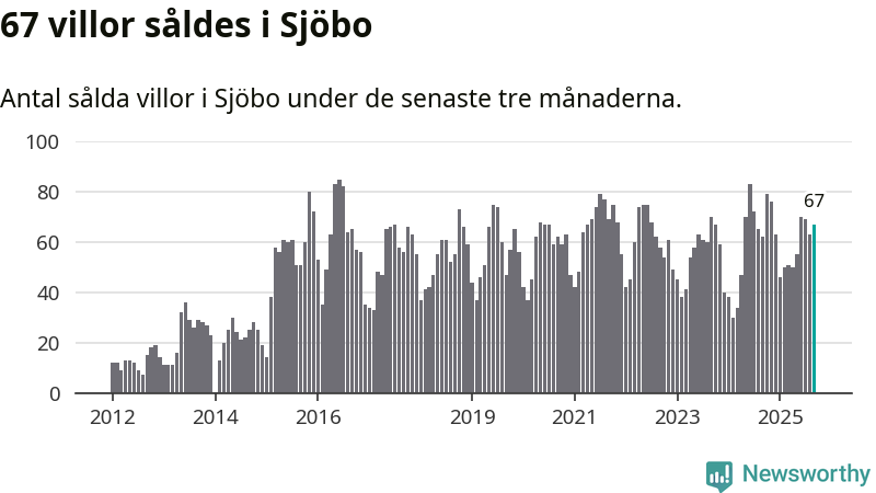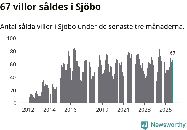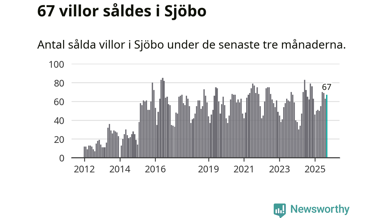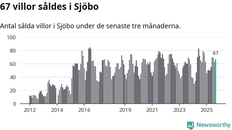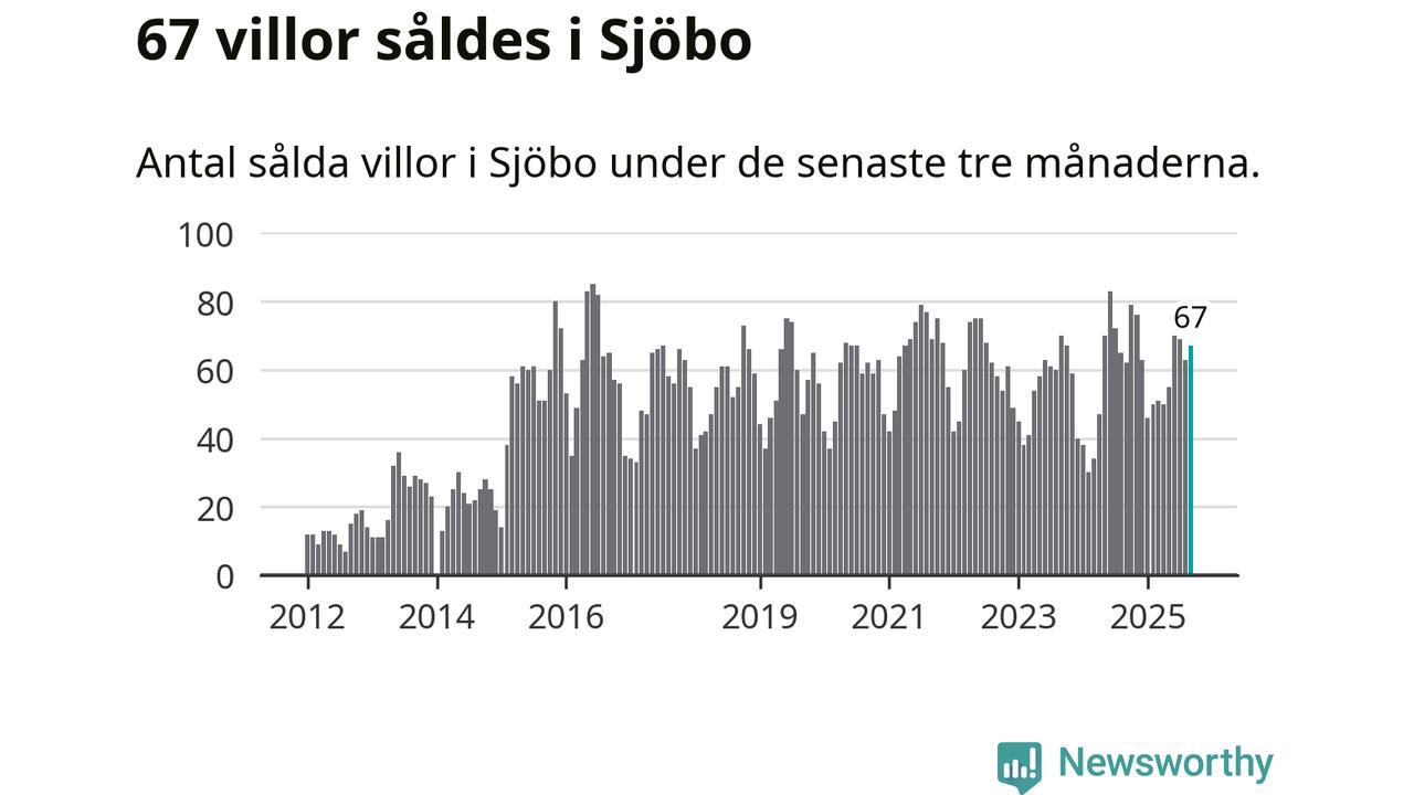 Sammanlagt såldes 67 villor i Sjöbo kommun mellan juli och september till ett genomsnittligt pris på 2,2 miljoner kronor. I fjol gjordes 62 affärer vid den här tiden på året.