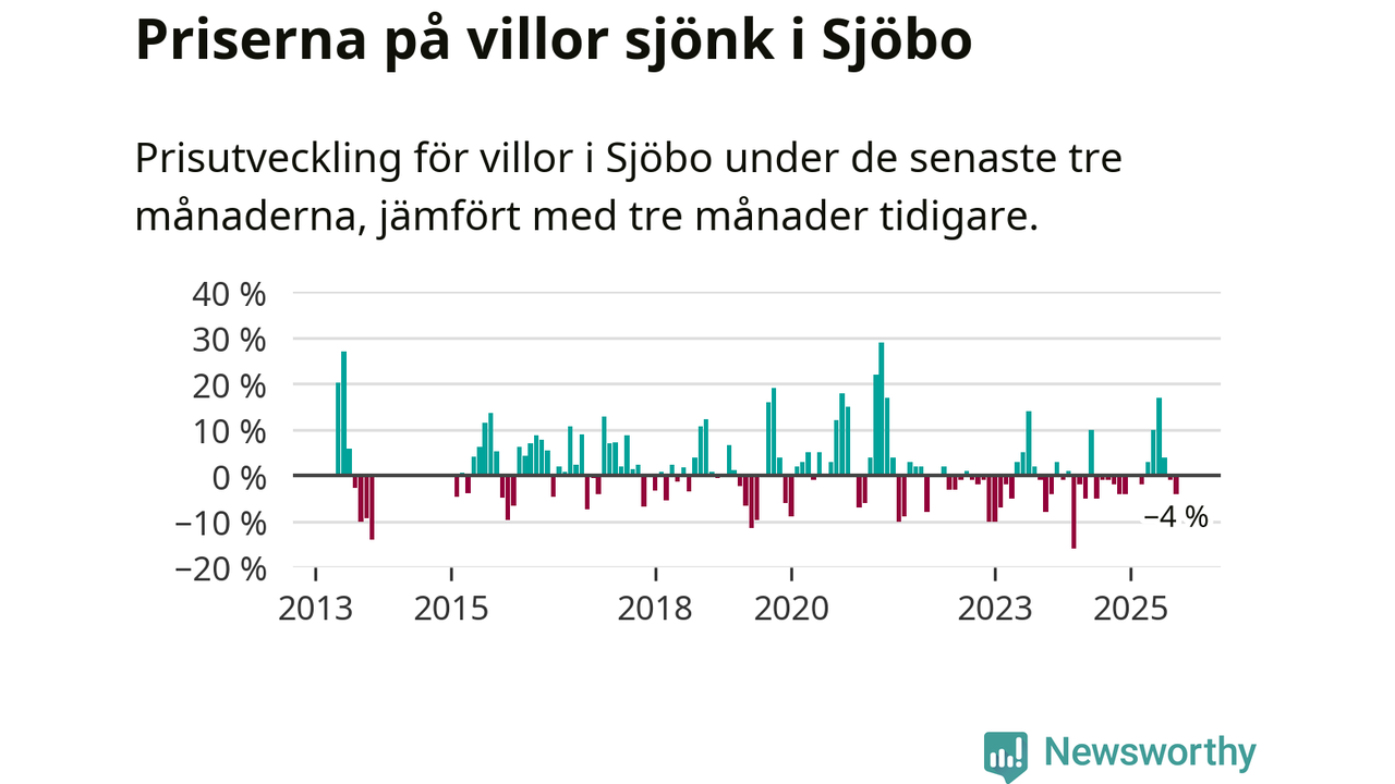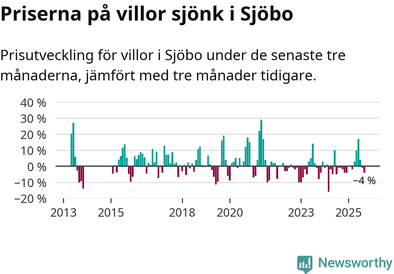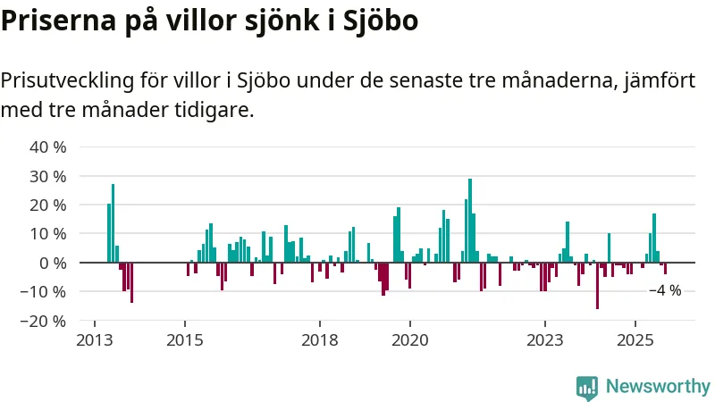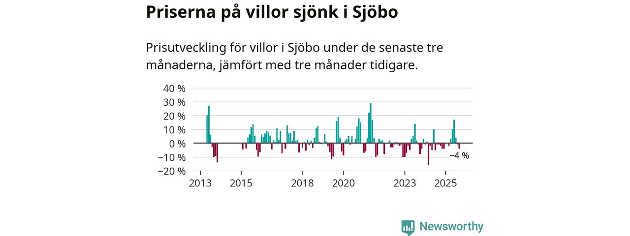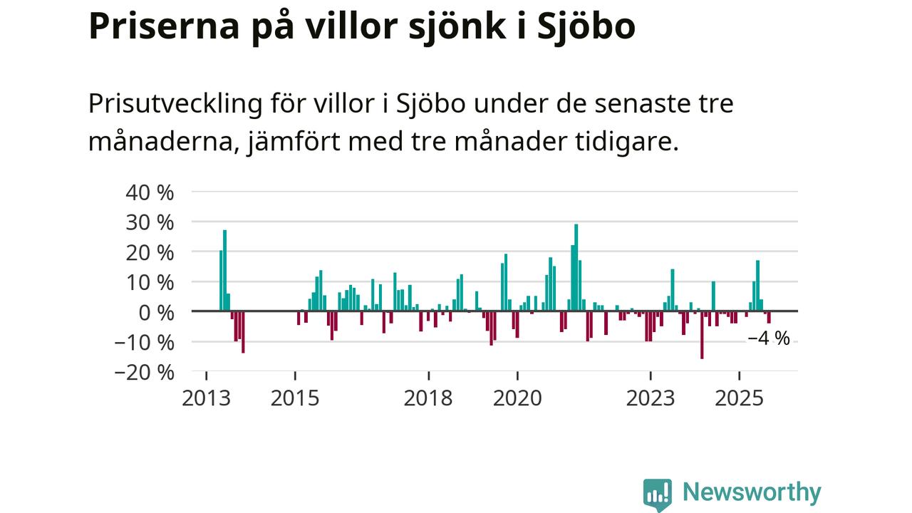 Villapriserna har gått ner i Sjöbo kommun. Medelpriset på försäljningarna under de senaste tre månaderna visar på en nedgång med 4 procent.