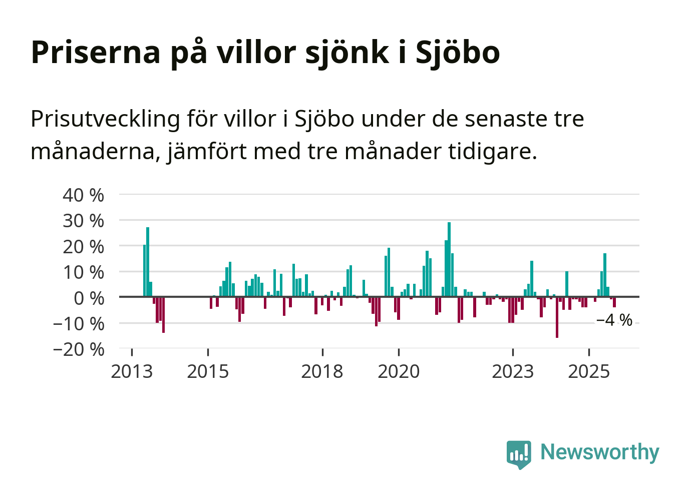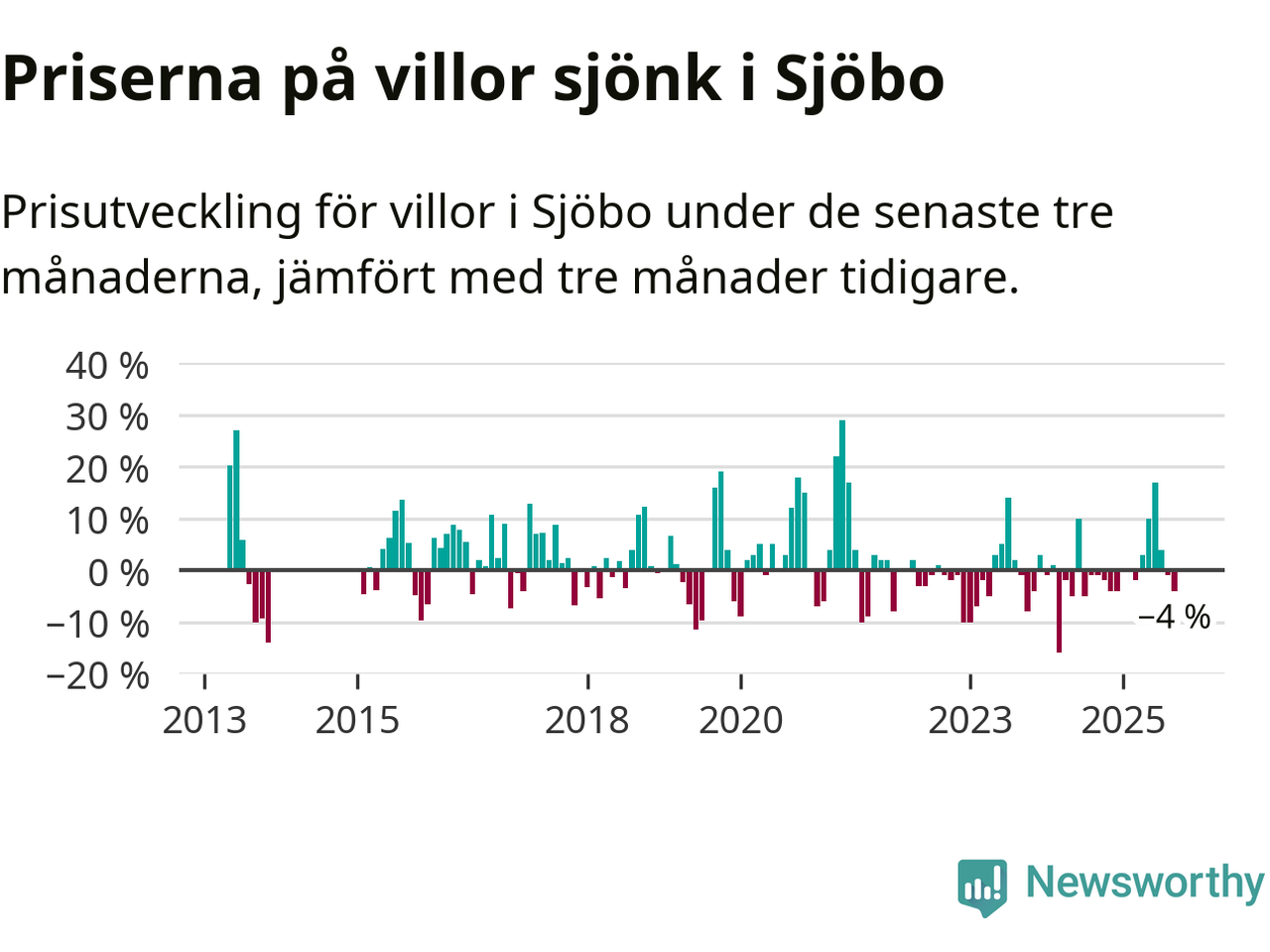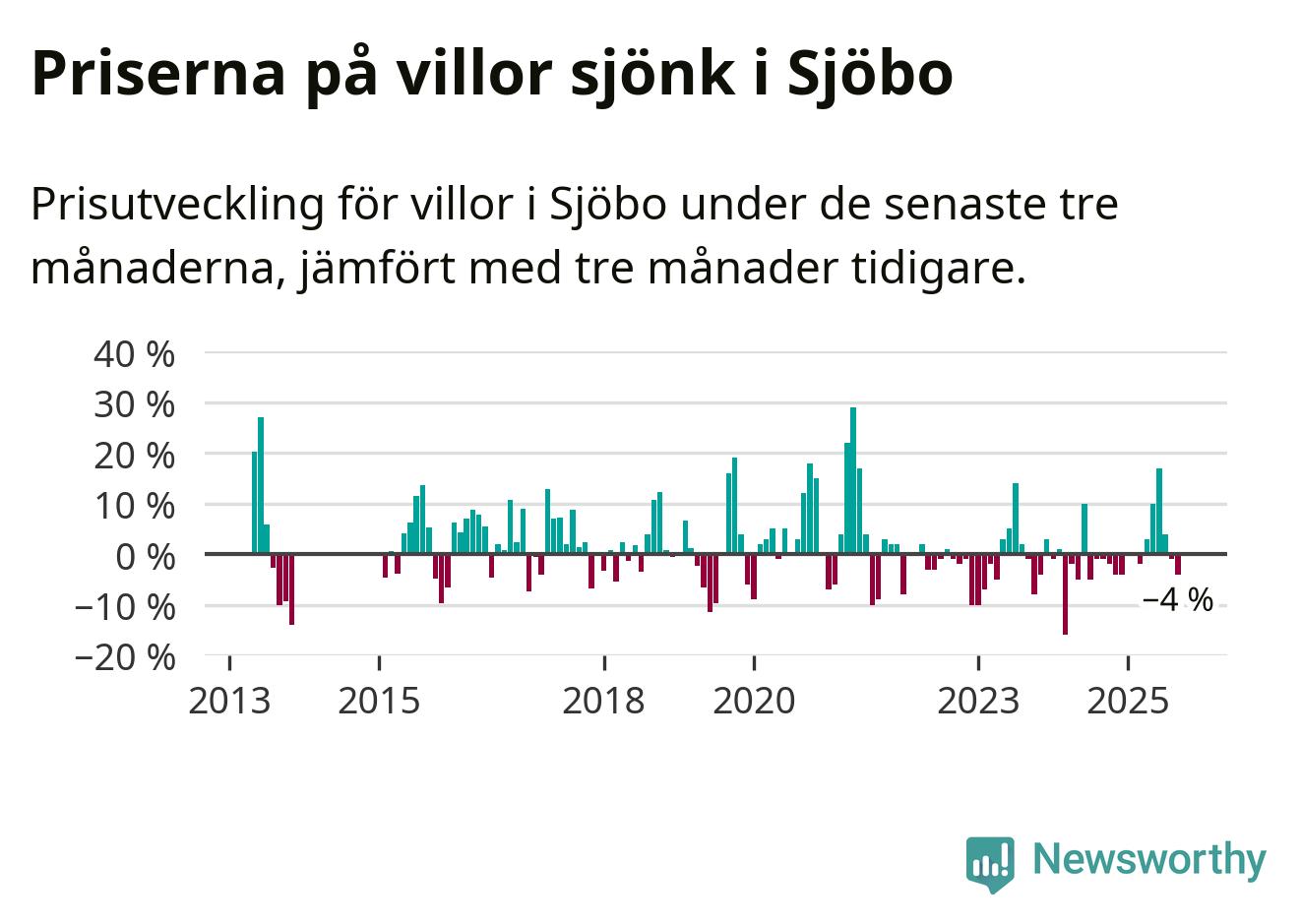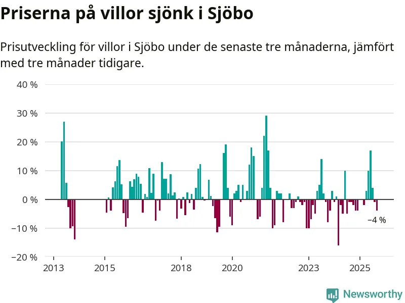 Villapriserna har gått ner i Sjöbo kommun. Medelpriset på försäljningarna under de senaste tre månaderna visar på en nedgång med 4 procent.