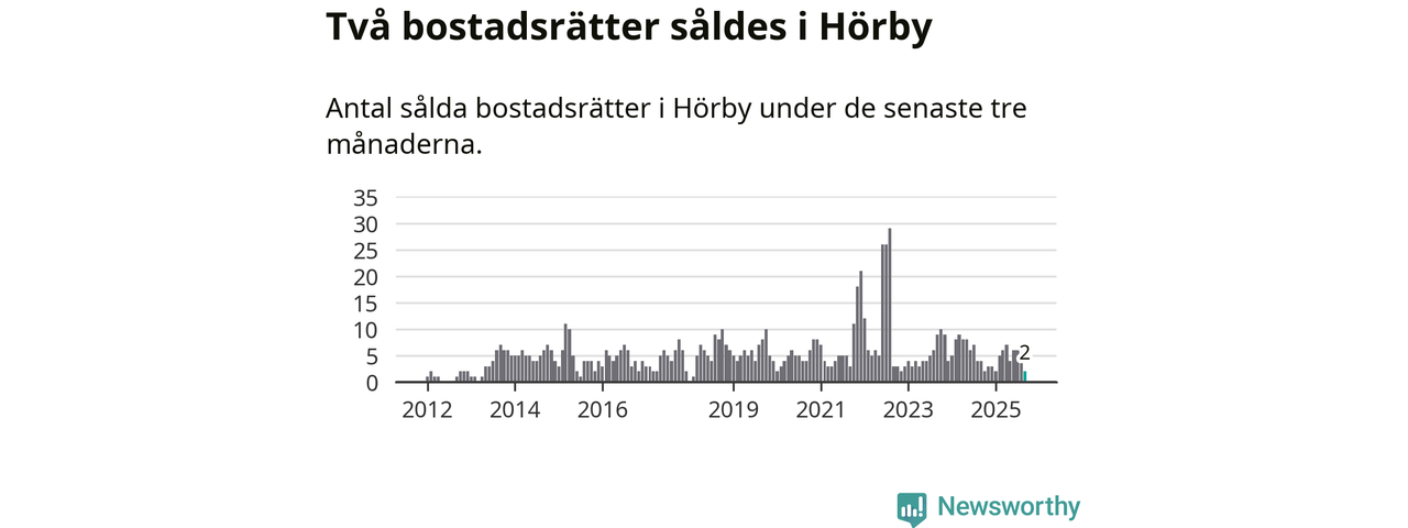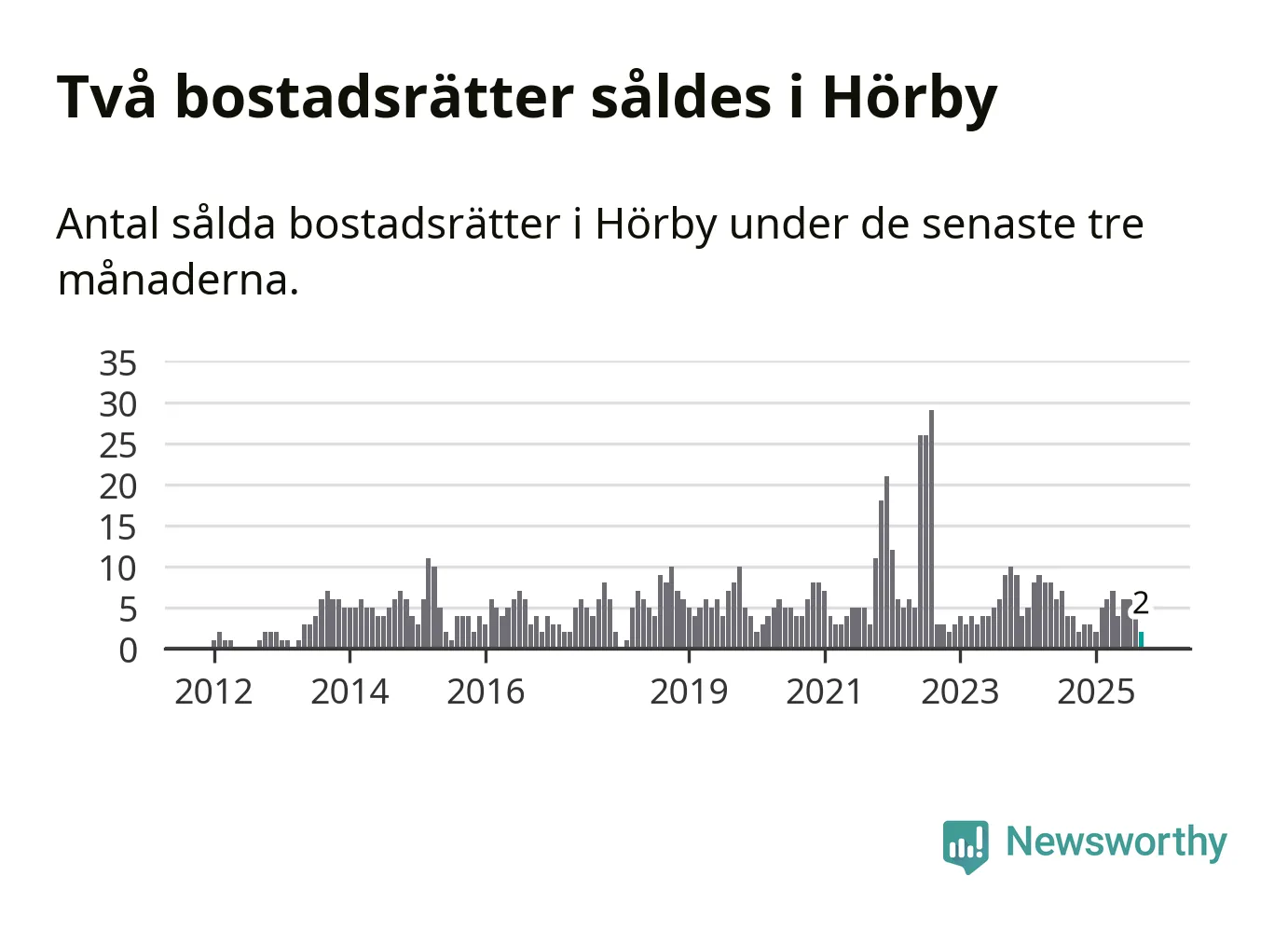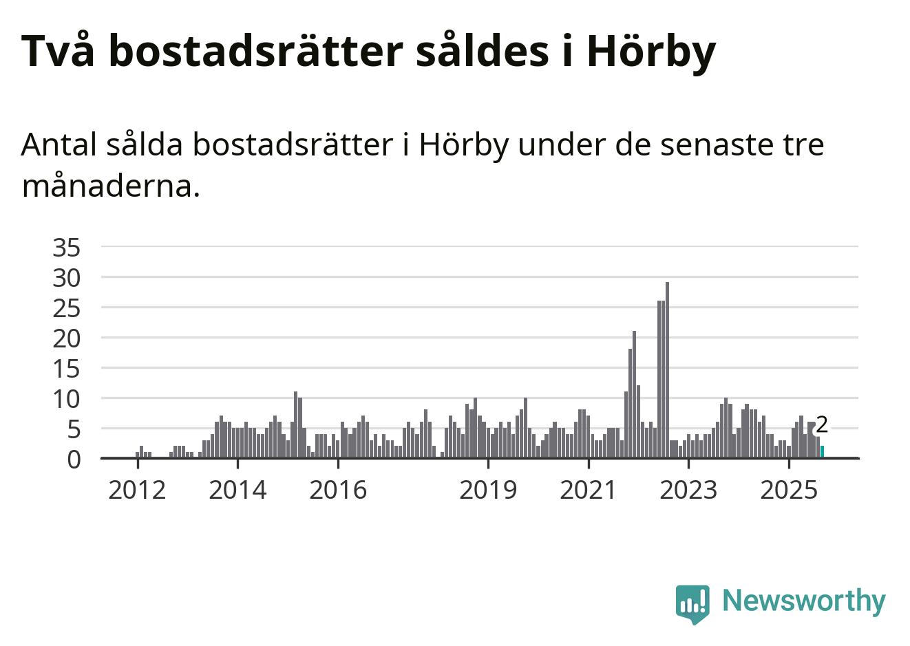 Mellan juli och september gjordes sammanlagt två affärer med bostadsrätter i Hörby kommun. Det kan jämföras med fyra vid motsvarande tid i fjol.