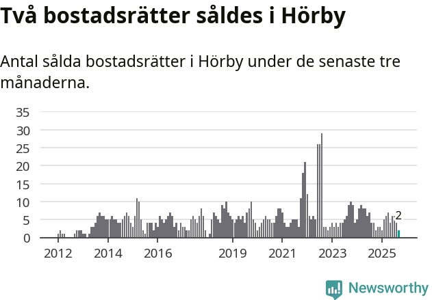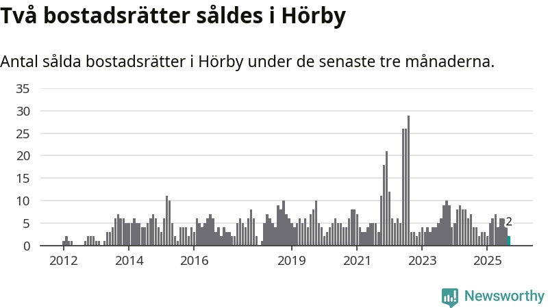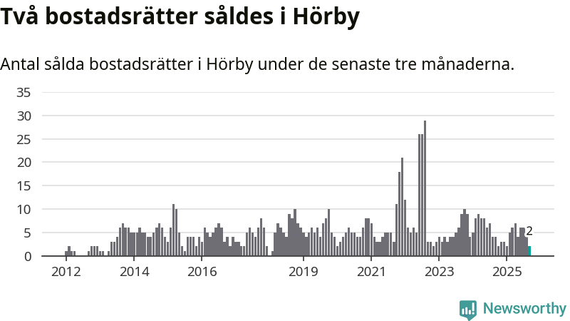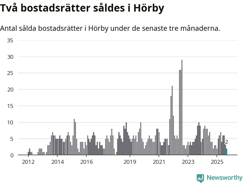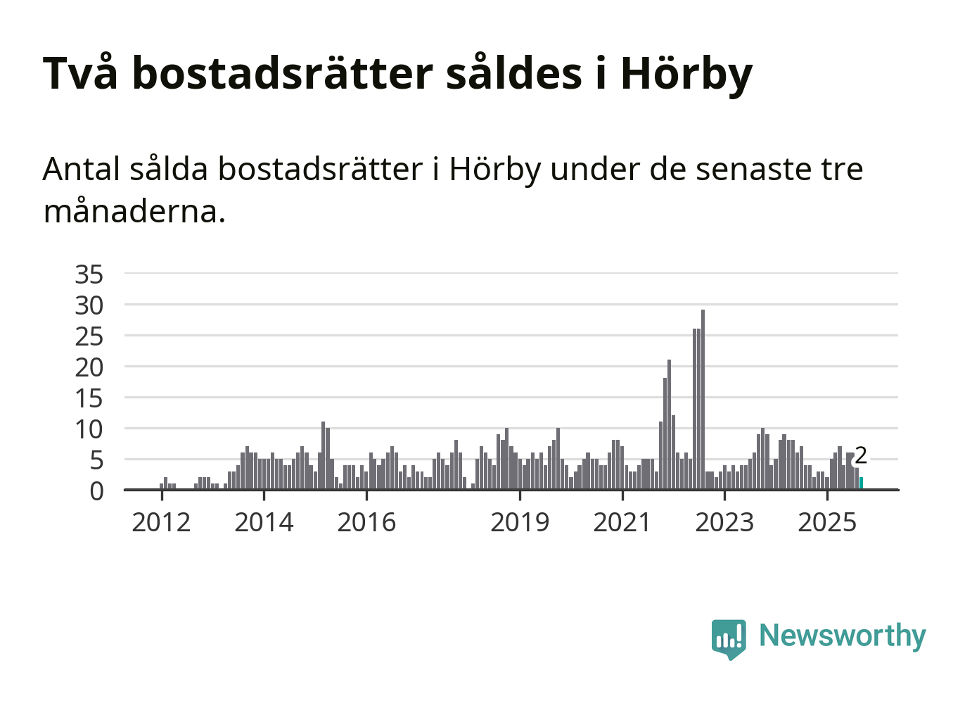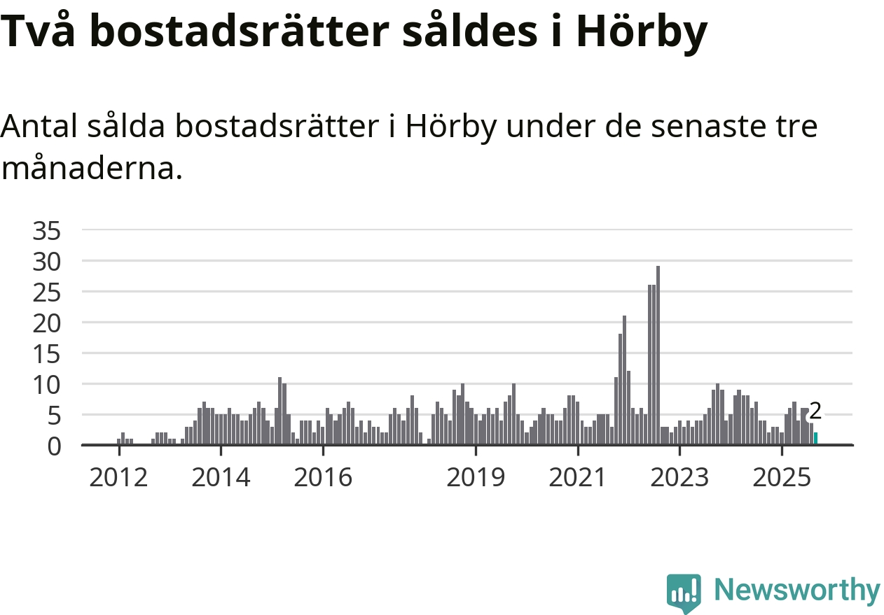 Mellan juli och september gjordes sammanlagt två affärer med bostadsrätter i Hörby kommun. Det kan jämföras med fyra vid motsvarande tid i fjol.