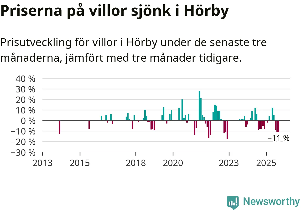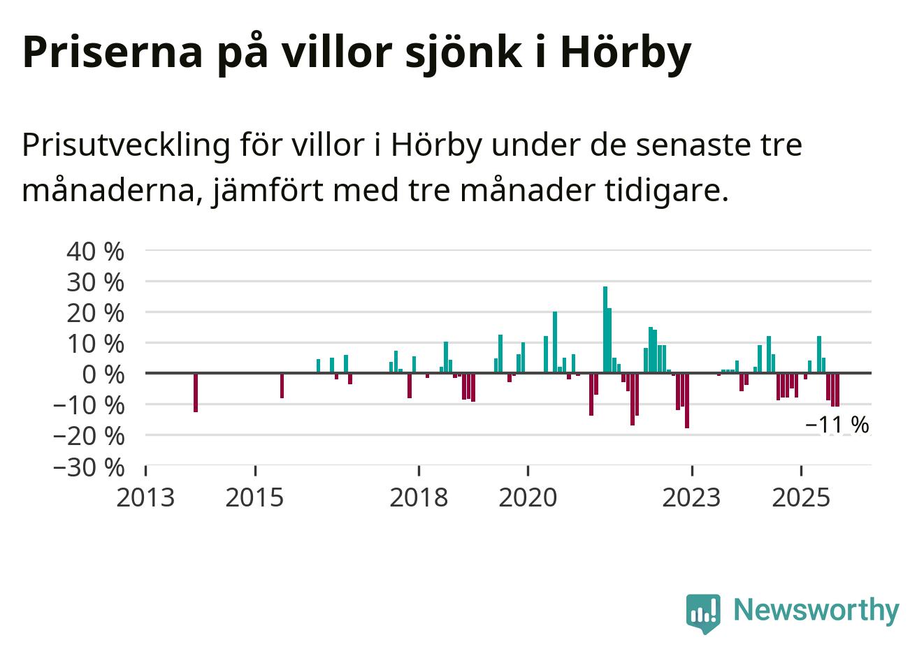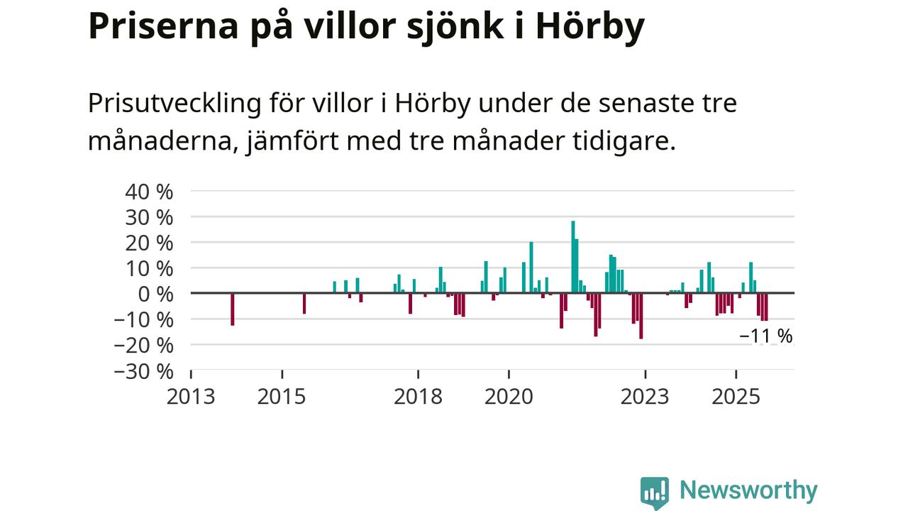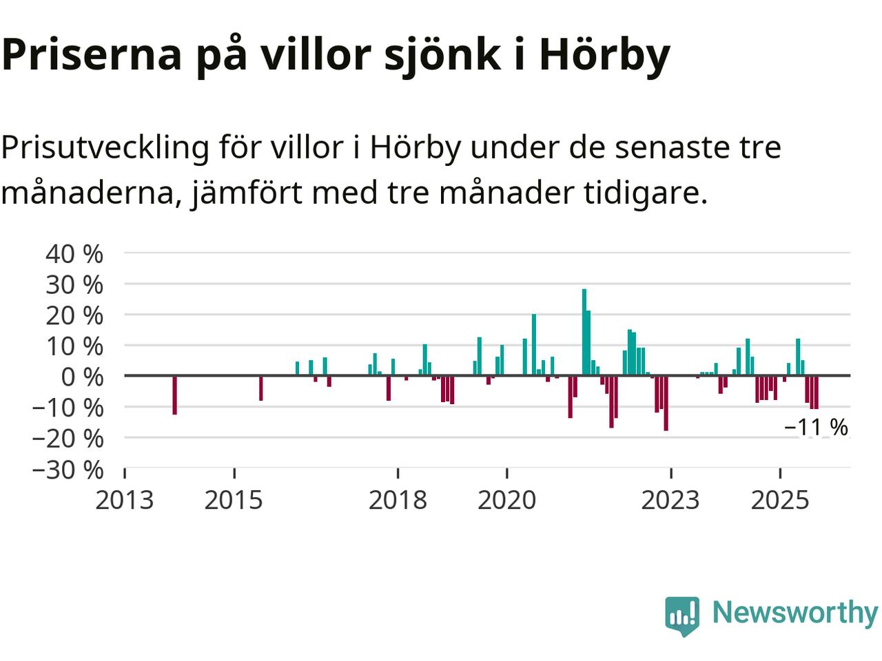 Statistiken visar även på en stor prisnedgång i Hörby kommun. Medelpriset på försäljningarna av villor i kommunen var 11 procent lägre än för tre månader sedan. I hela Skåne däremot ökar villapriserna. I hela länet noterades en prisuppgång på 1 procent.
