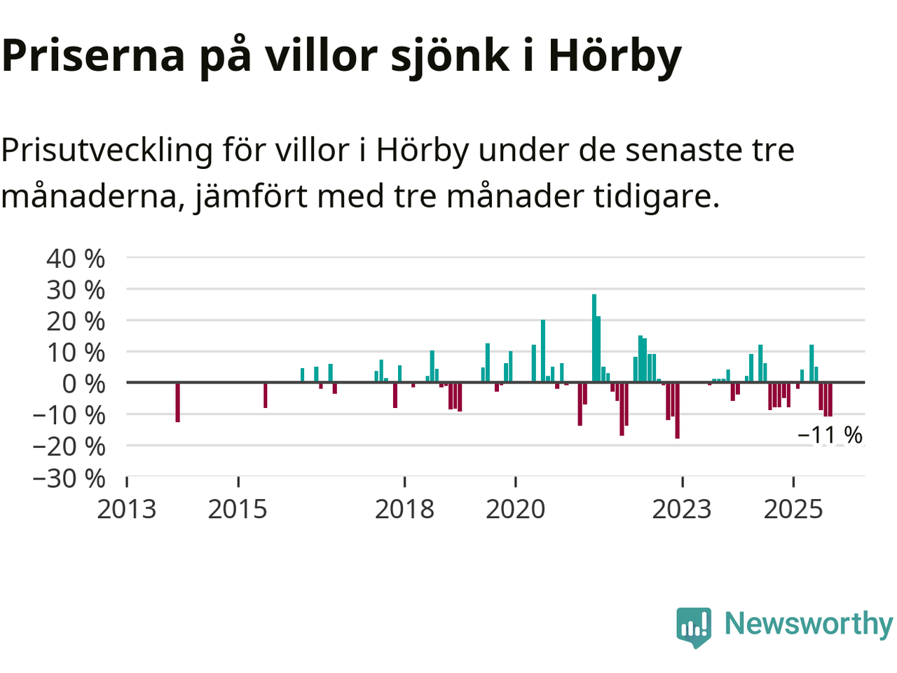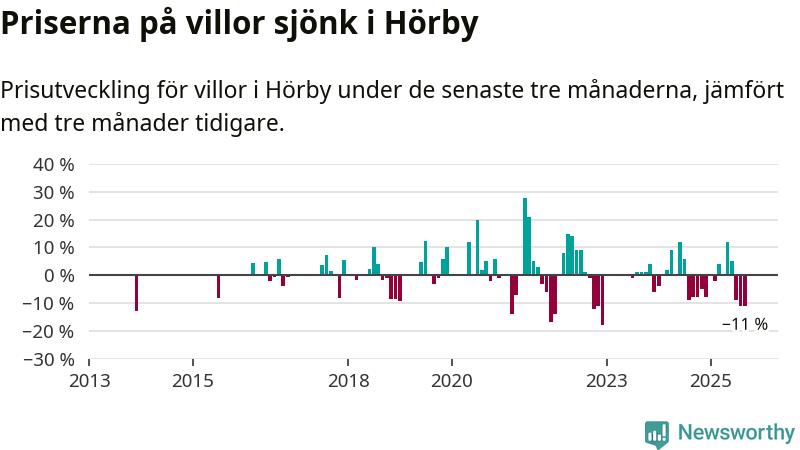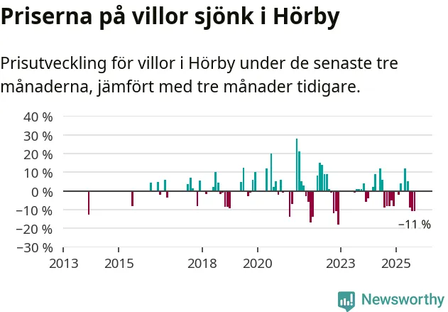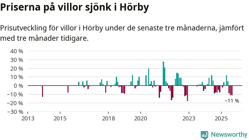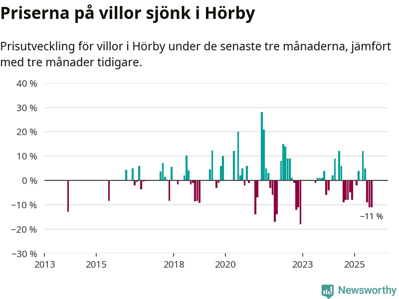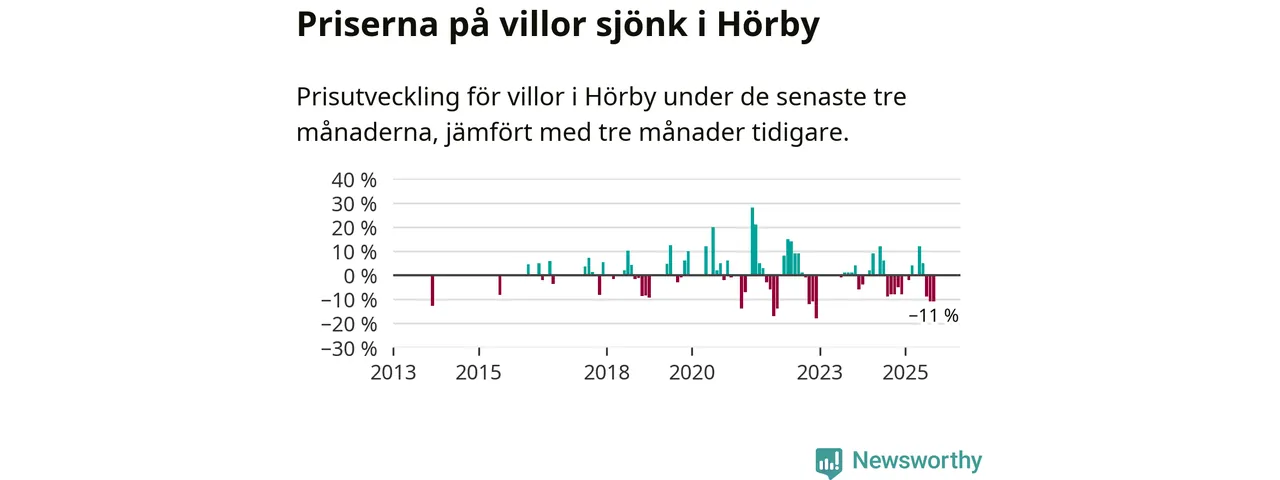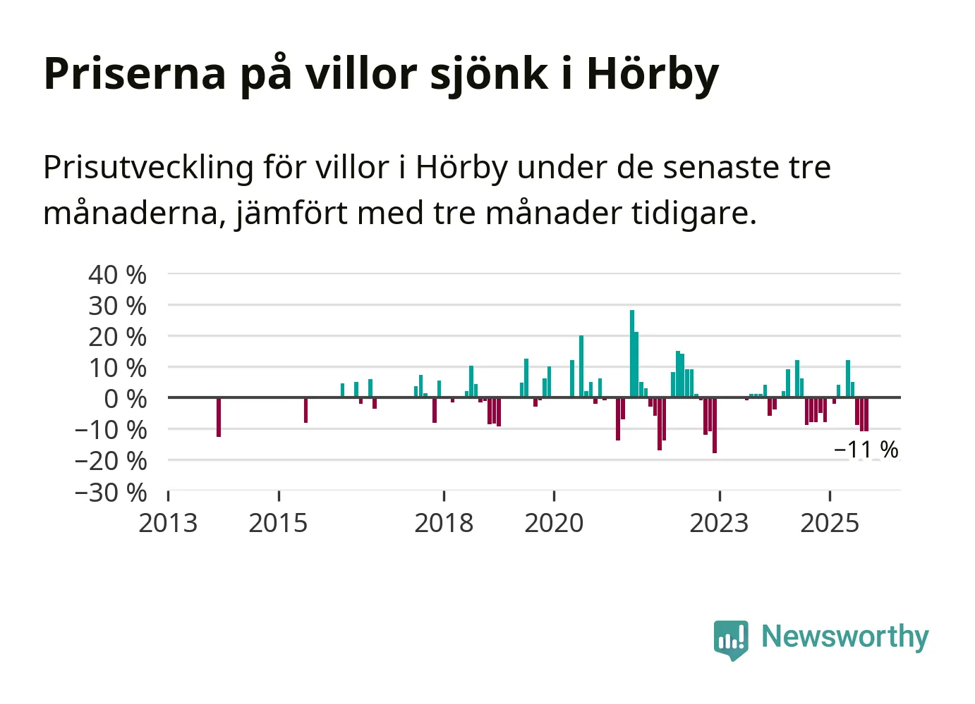 Statistiken visar även på en stor prisnedgång i Hörby kommun. Medelpriset på försäljningarna av villor i kommunen var 11 procent lägre än för tre månader sedan. I hela Skåne däremot ökar villapriserna. I hela länet noterades en prisuppgång på 1 procent.