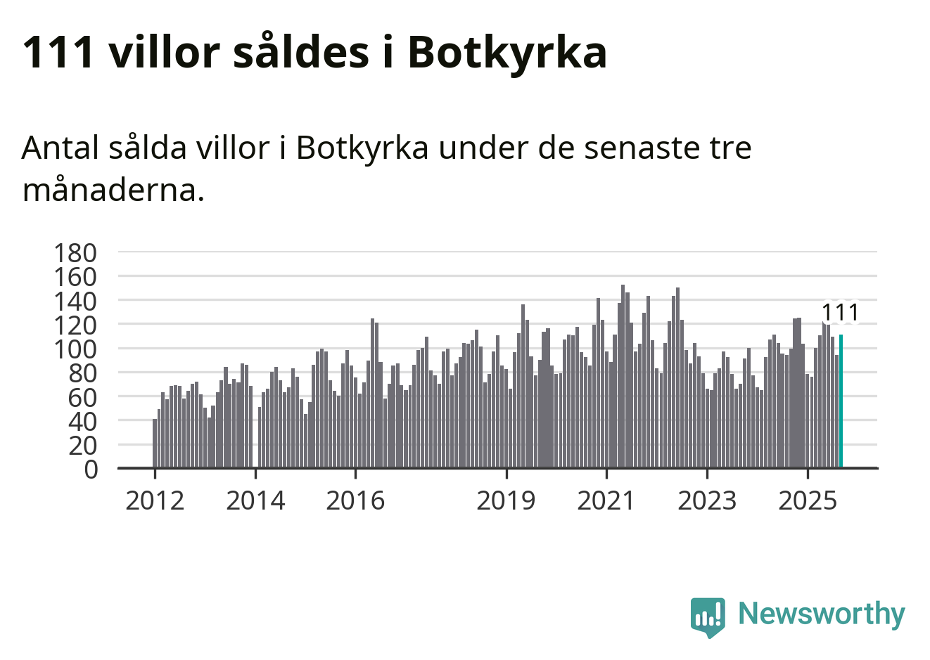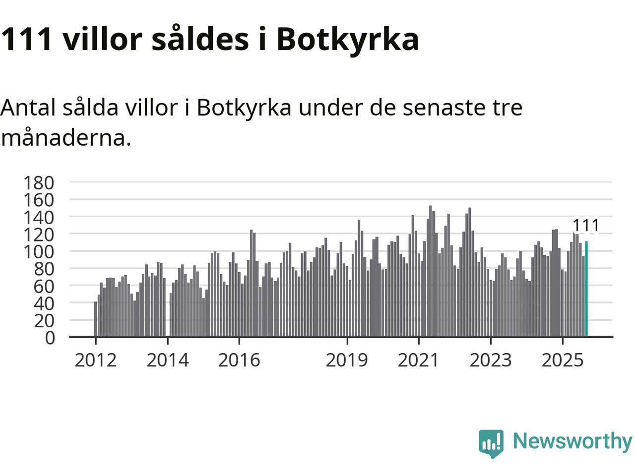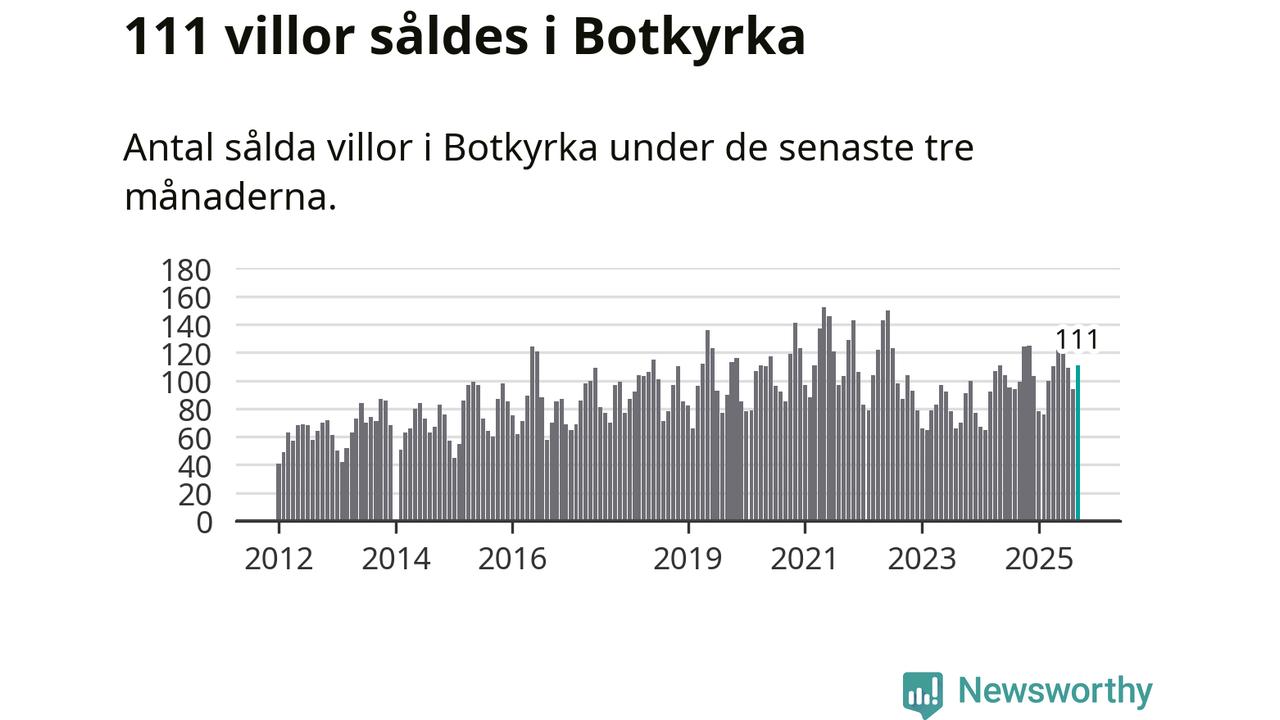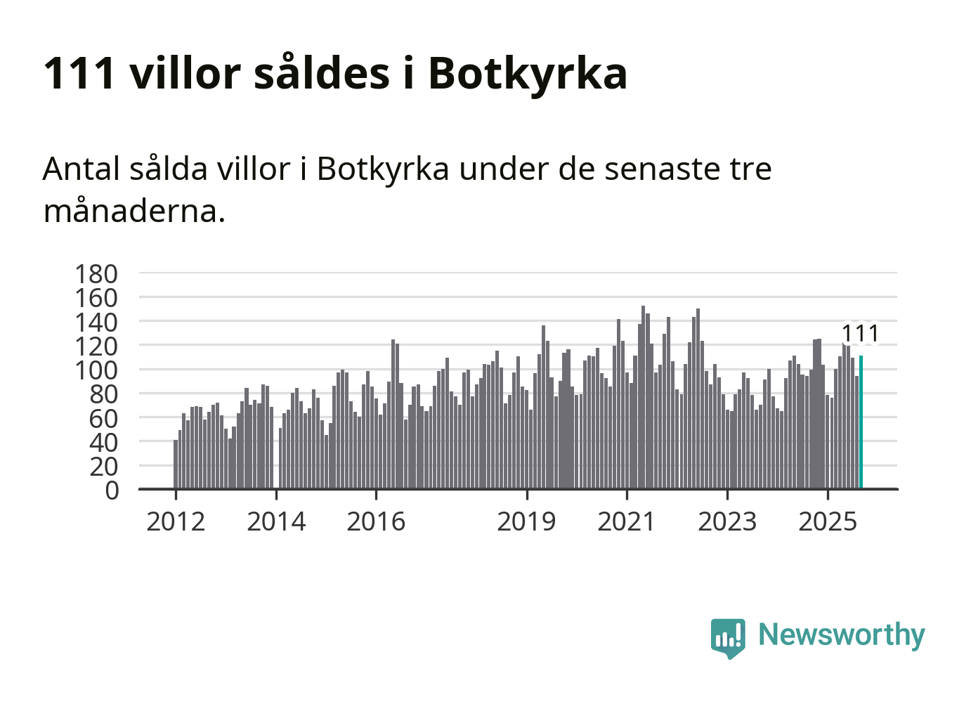 Sammanlagt såldes 111 villor i Botkyrka kommun mellan juli och september till ett genomsnittligt pris på 4,7 miljoner kronor. I fjol gjordes 99 affärer vid den här tiden på året.