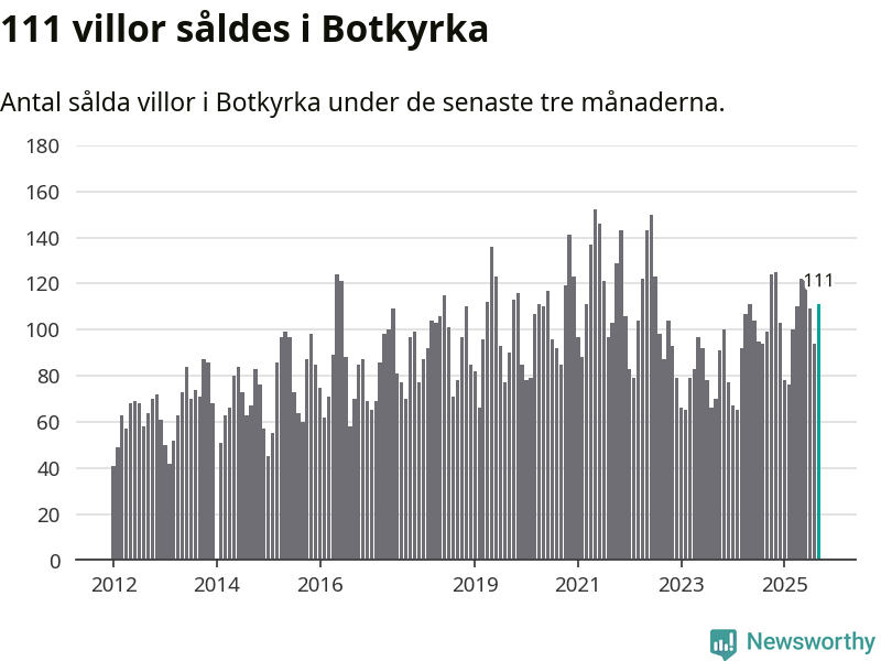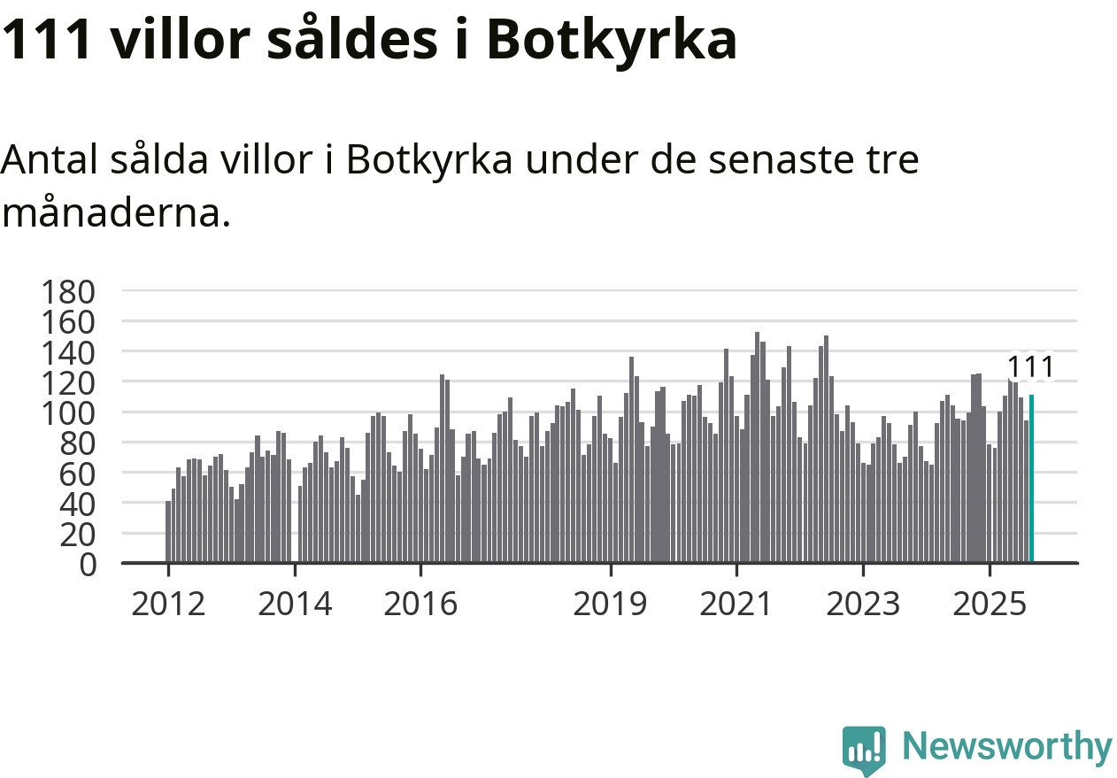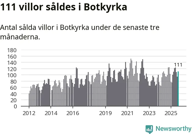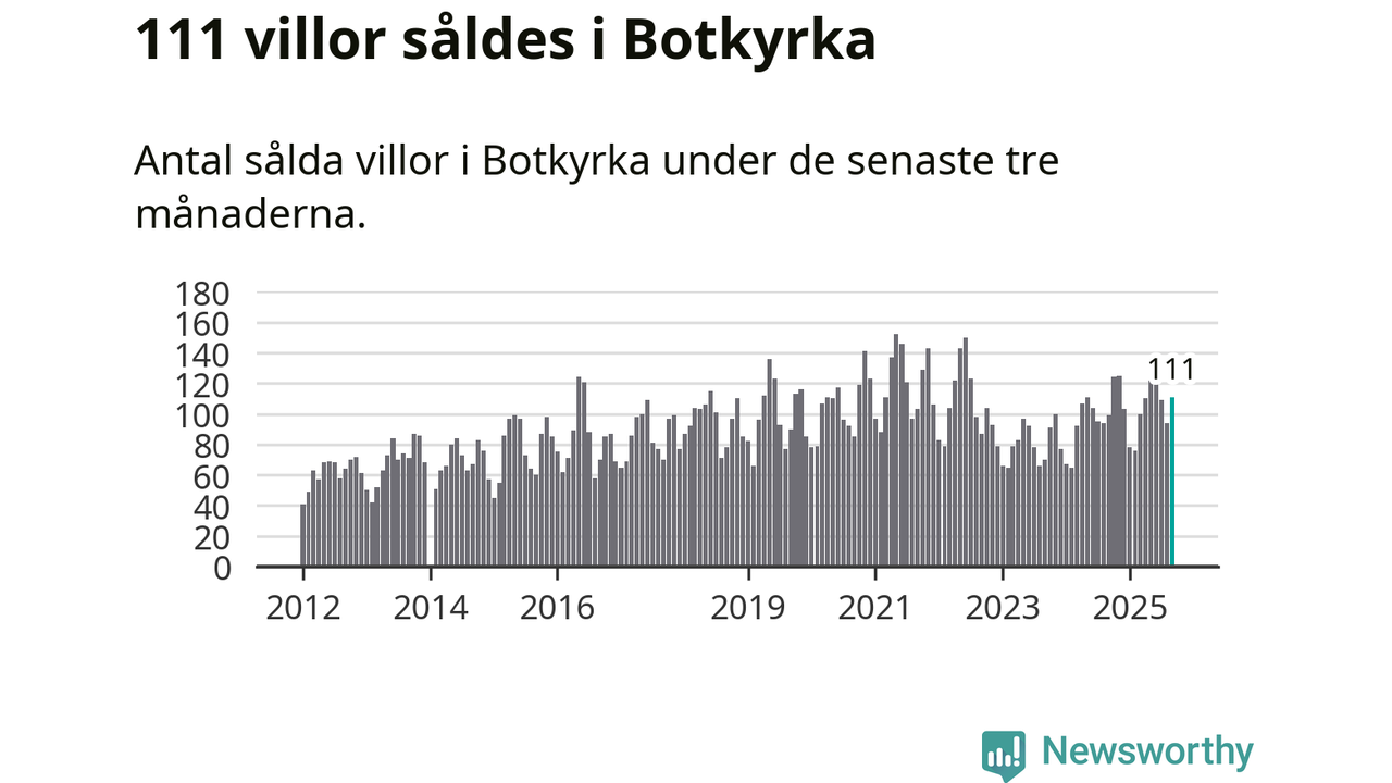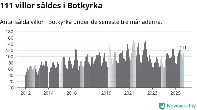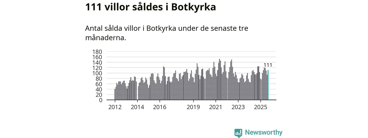 Sammanlagt såldes 111 villor i Botkyrka kommun mellan juli och september till ett genomsnittligt pris på 4,7 miljoner kronor. I fjol gjordes 99 affärer vid den här tiden på året.