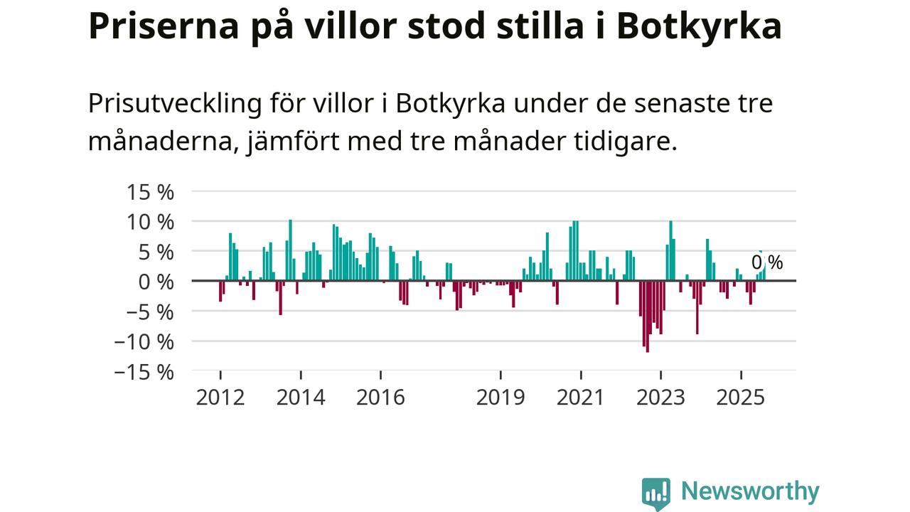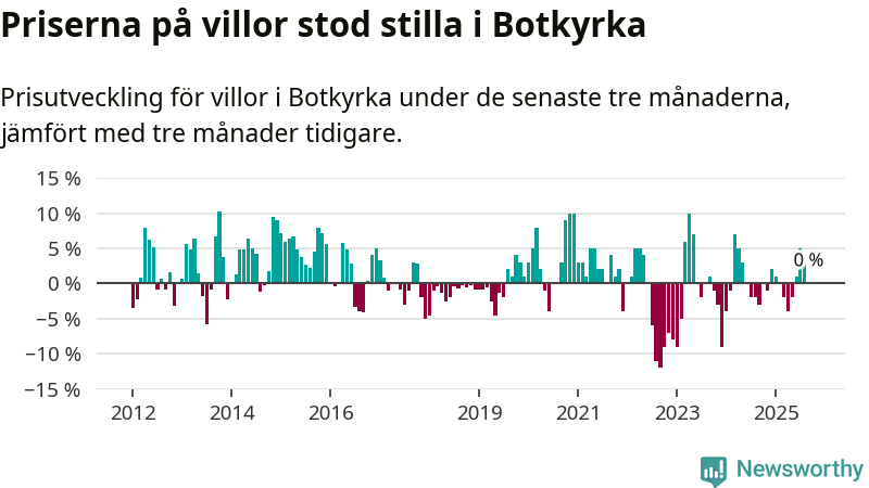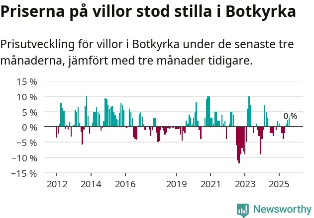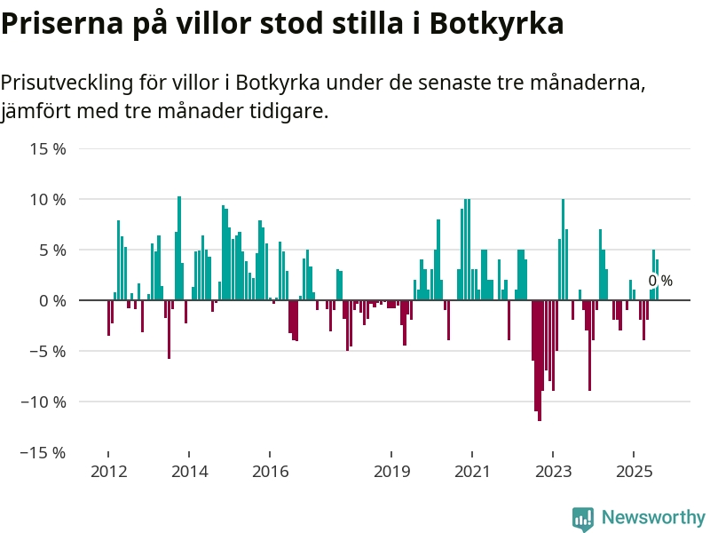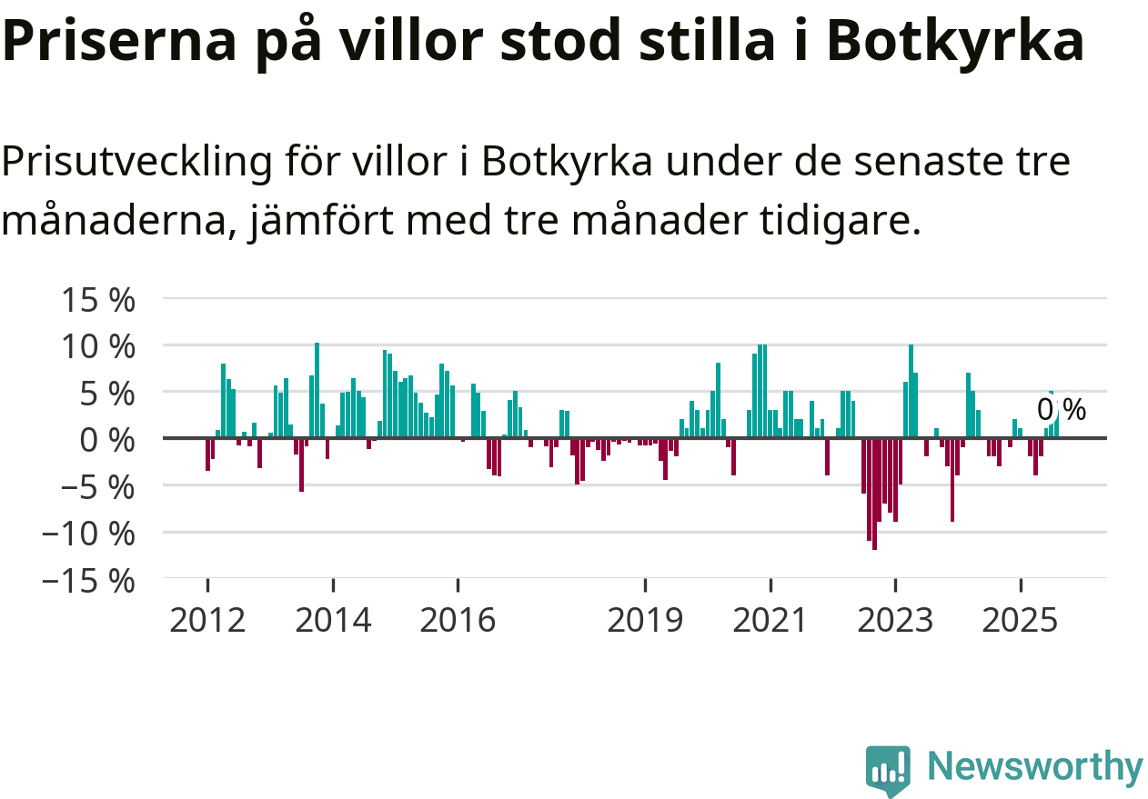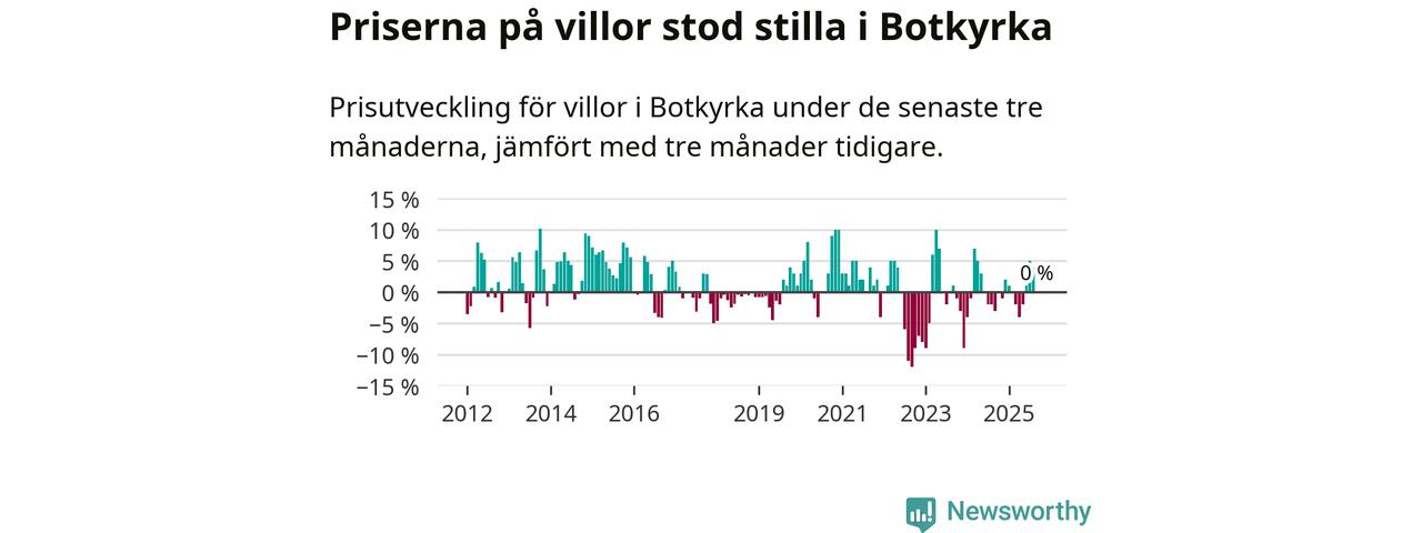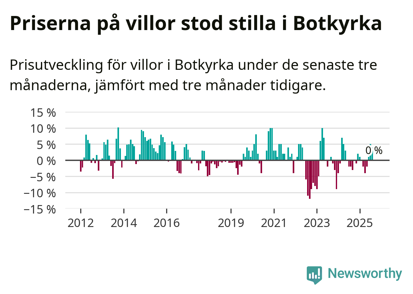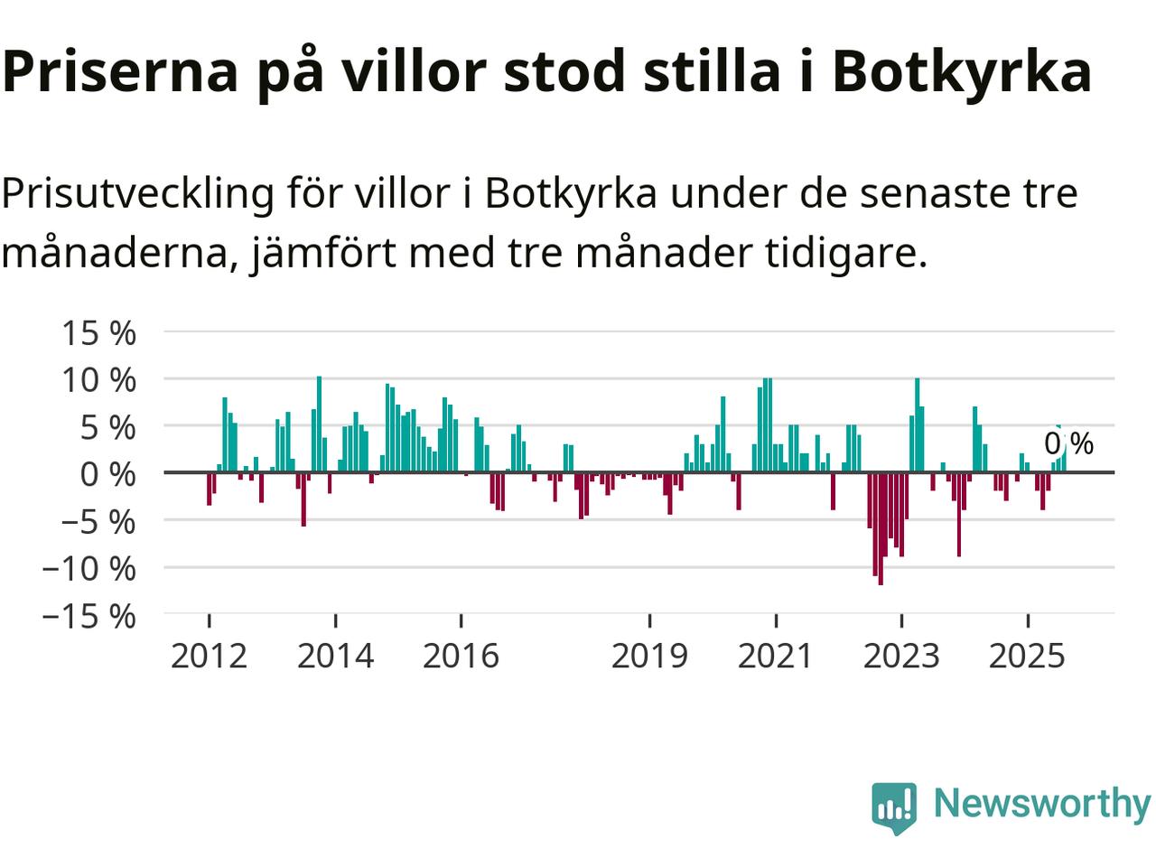 Villapriserna står i stort sett stilla i Botkyrka kommun. Medelpriset på de på försäljningarna under de senaste tre månaderna låg på samma nivå som för tre månader sedan.