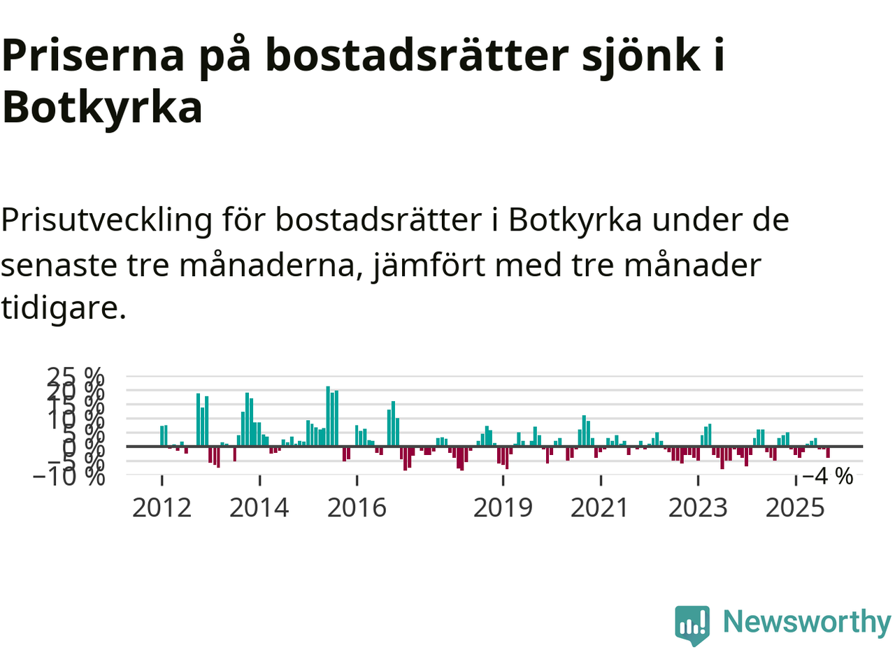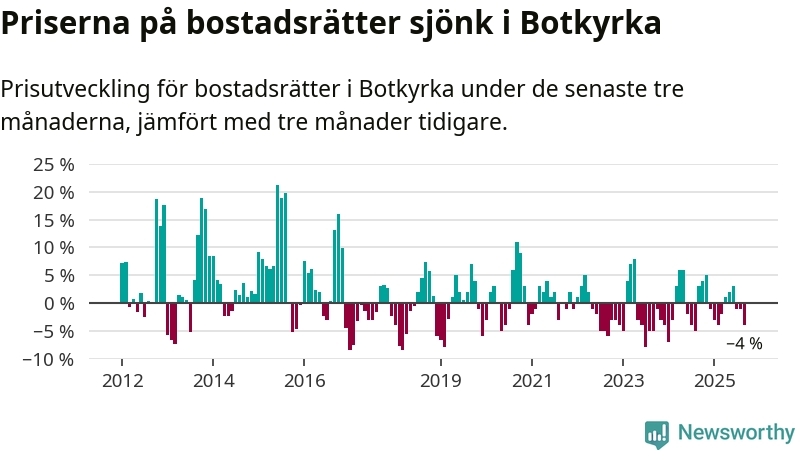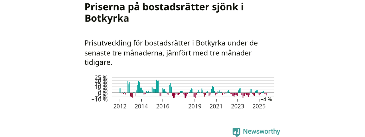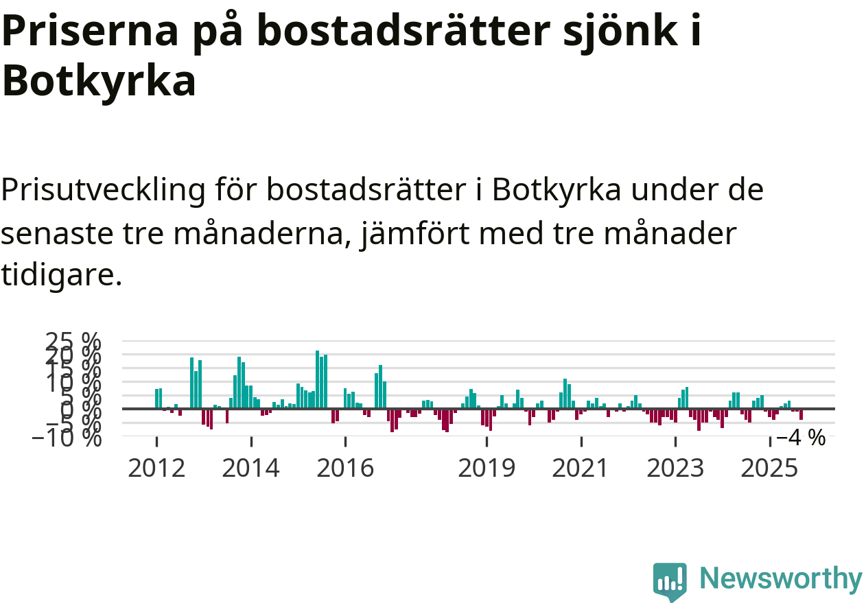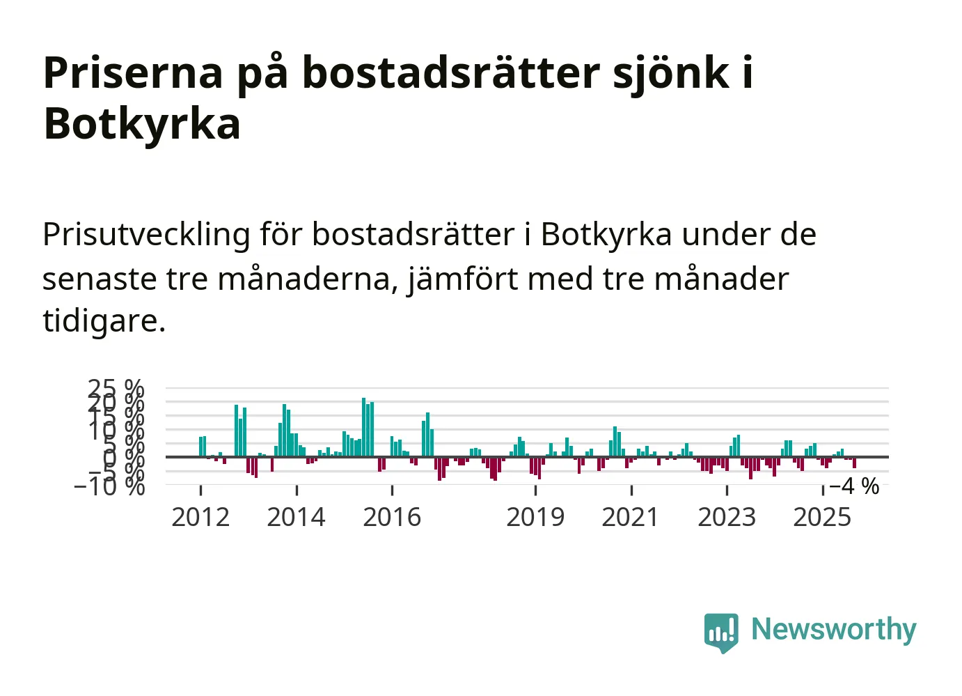 Statistiken visar även på en kännbar prisnedgång i Botkyrka kommun. Medelpriset på försäljningarna av bostadsrätter i kommunen var 4 procent lägre än för tre månader sedan. Även i hela Stockholms län sjunker priserna på bostadsrätter. I hela länet noterades en prisnedgång på 2 procent.