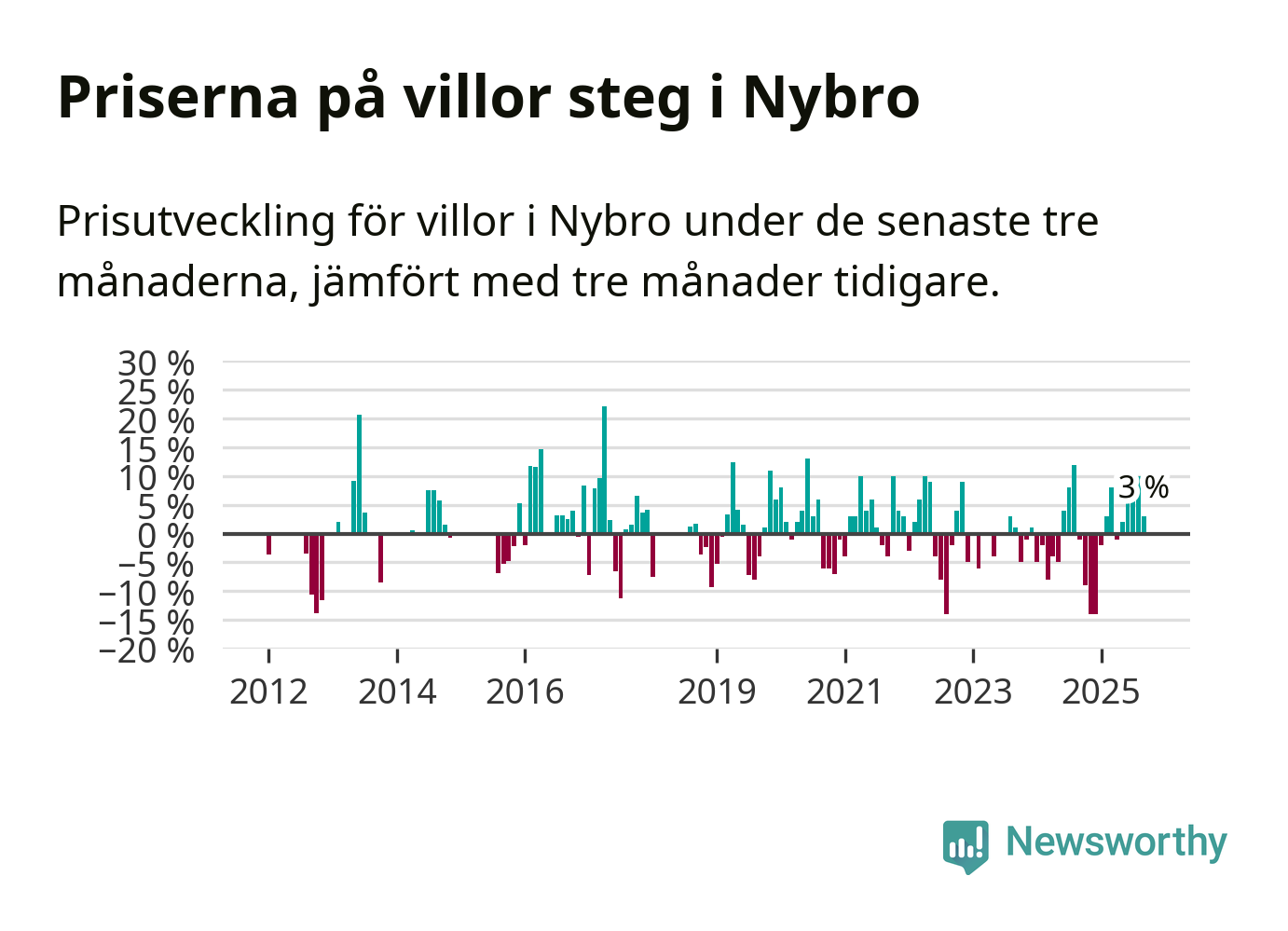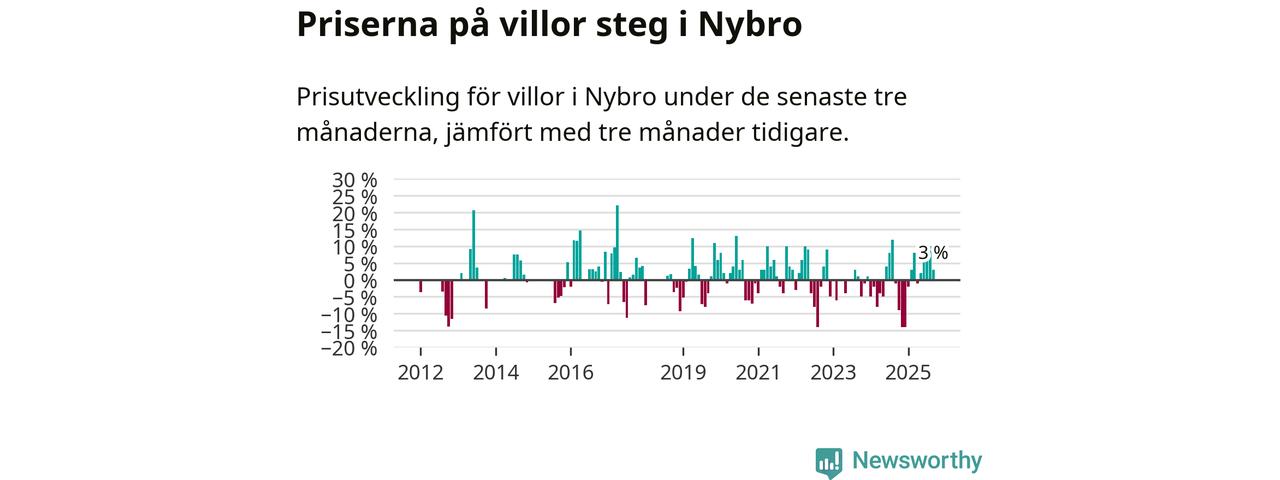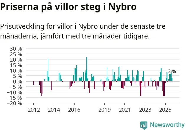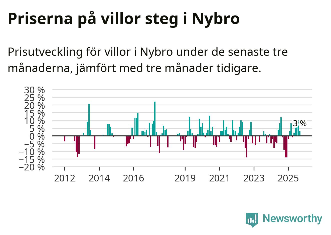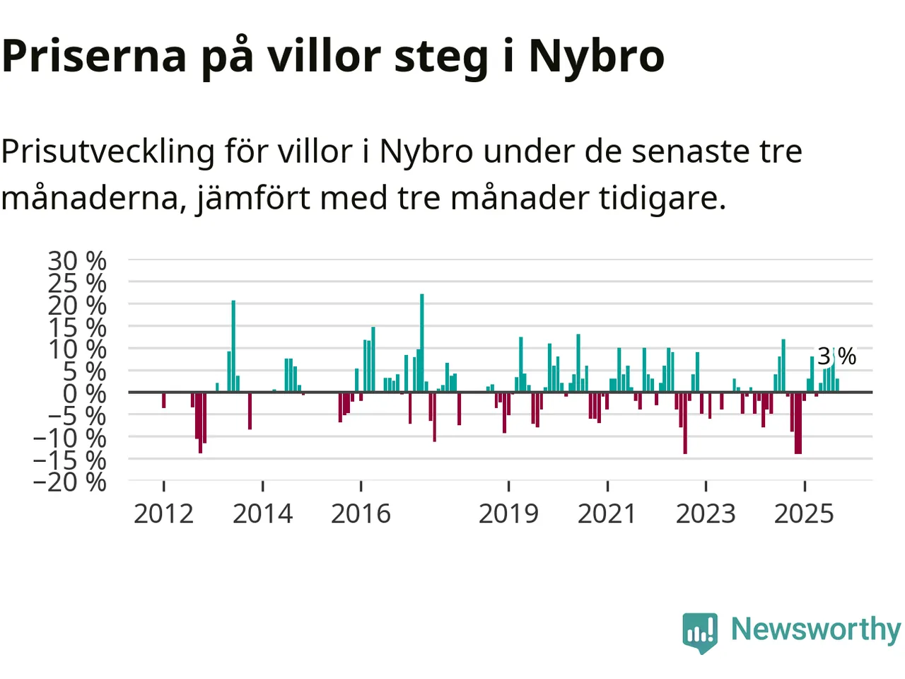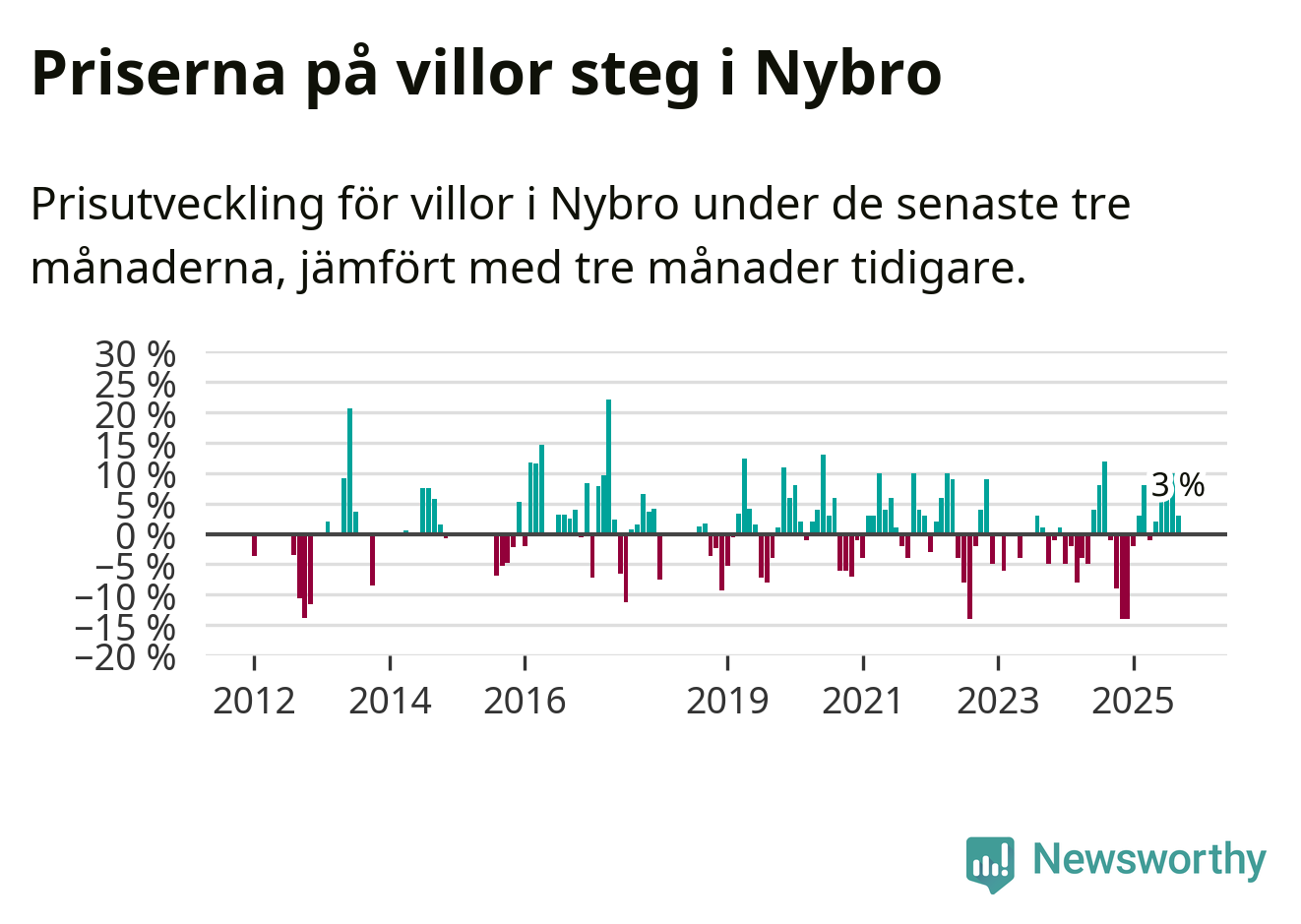 Villapriserna har gått upp i Nybro kommun. Medelpriset på försäljningarna under de senaste tre månaderna visar på en uppgång med 3 procent.