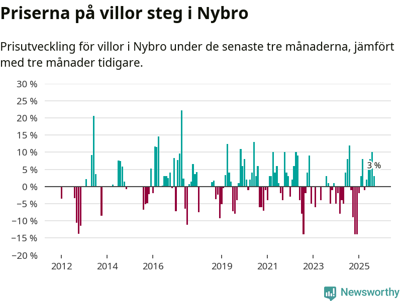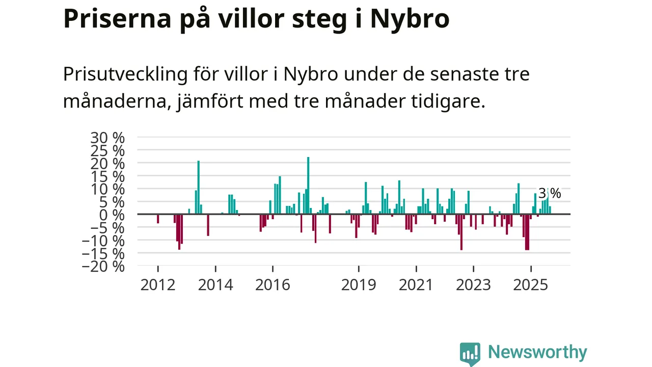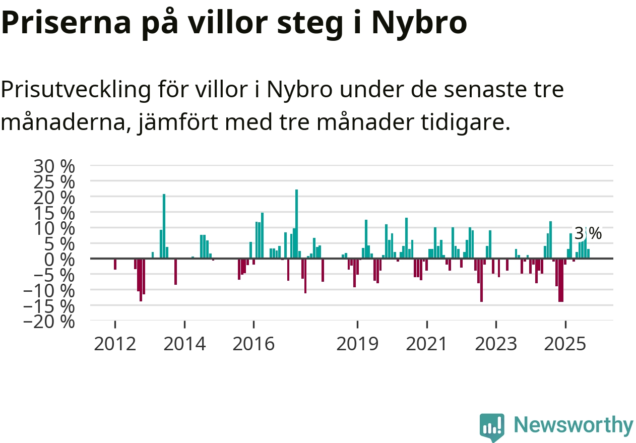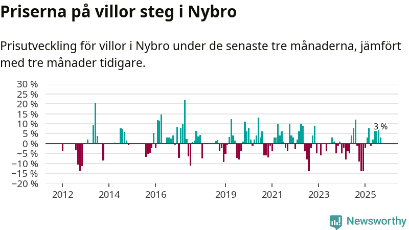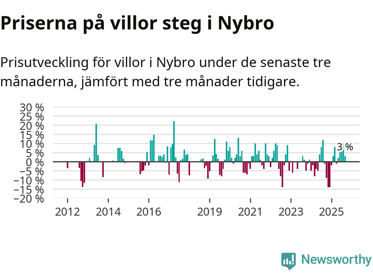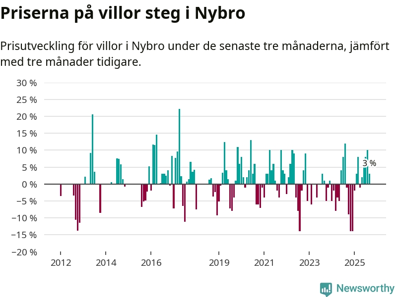 Villapriserna har gått upp i Nybro kommun. Medelpriset på försäljningarna under de senaste tre månaderna visar på en uppgång med 3 procent.