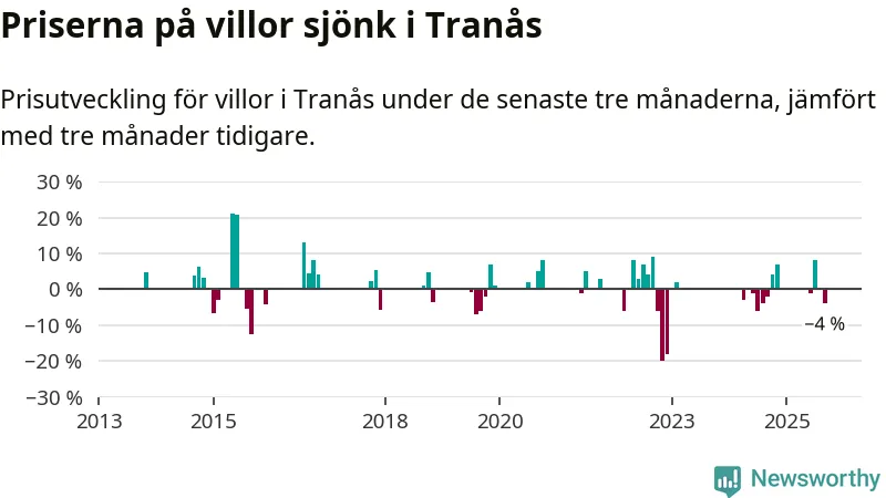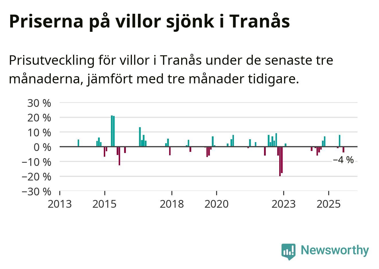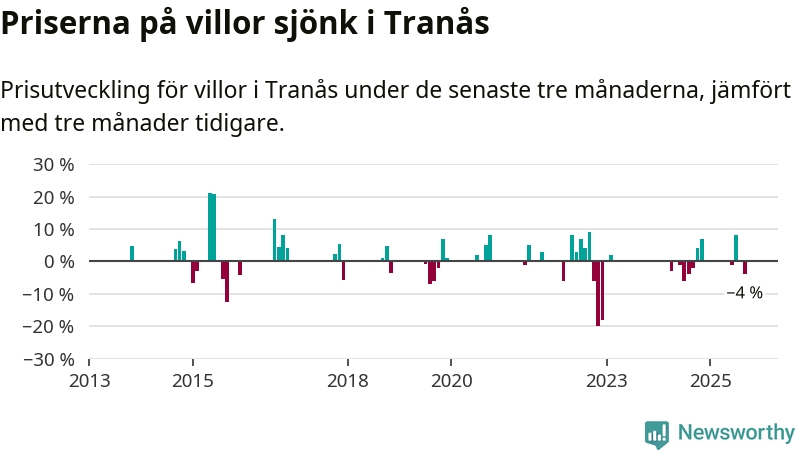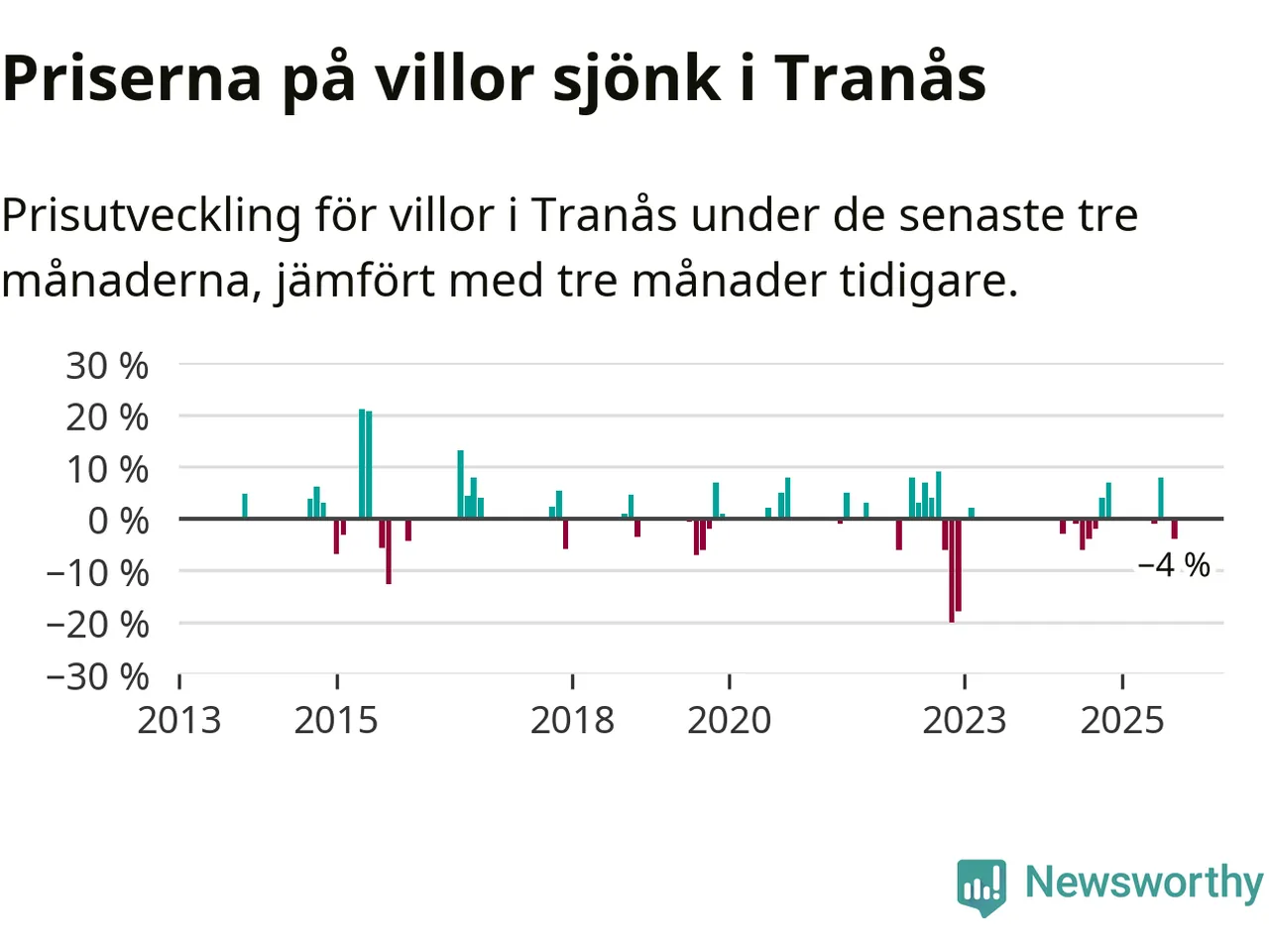 Statistiken visar även på en kännbar prisnedgång i Tranås kommun. Medelpriset på försäljningarna av villor i kommunen var 4 procent lägre än för tre månader sedan. I hela Jönköpings län däremot ökar villapriserna. I hela länet noterades en prisuppgång på 1 procent.