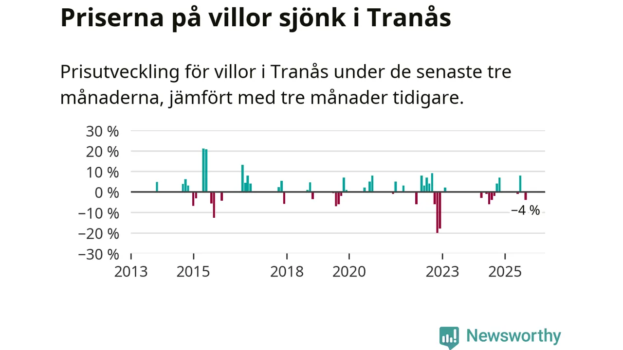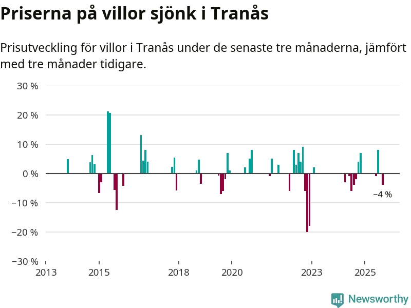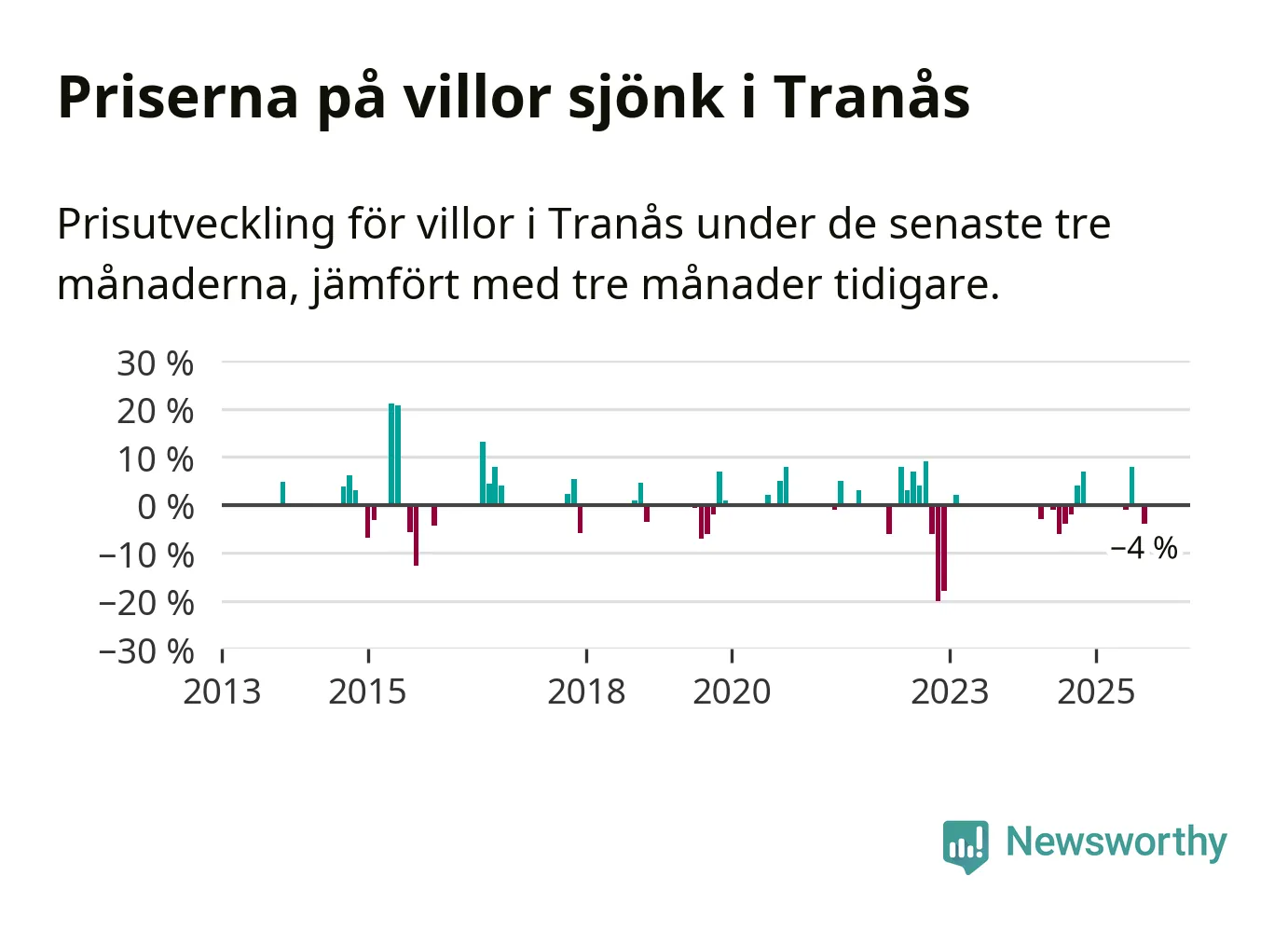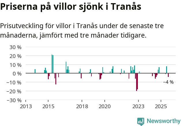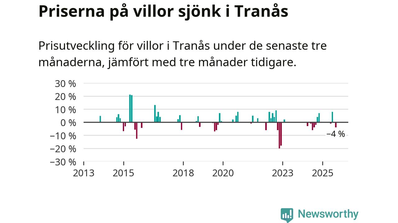 Statistiken visar även på en kännbar prisnedgång i Tranås kommun. Medelpriset på försäljningarna av villor i kommunen var 4 procent lägre än för tre månader sedan. I hela Jönköpings län däremot ökar villapriserna. I hela länet noterades en prisuppgång på 1 procent.
