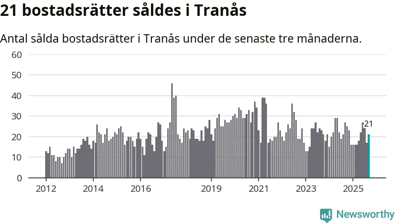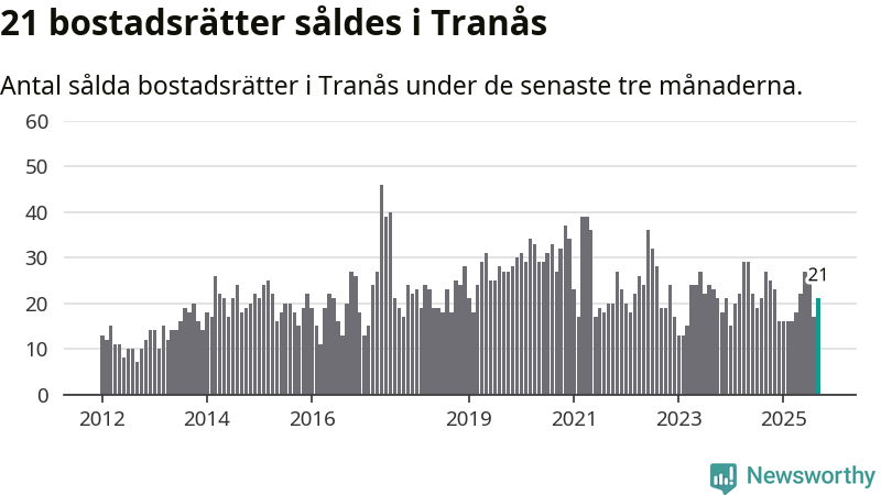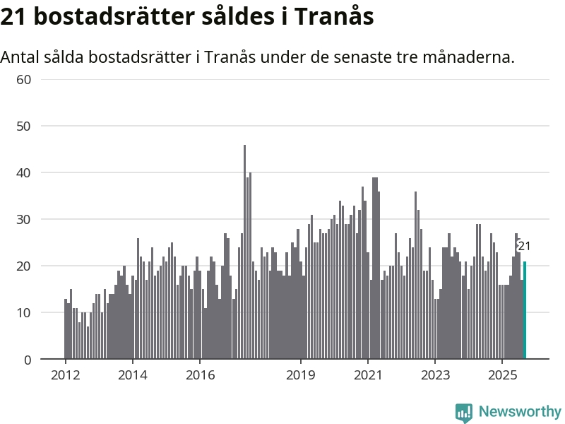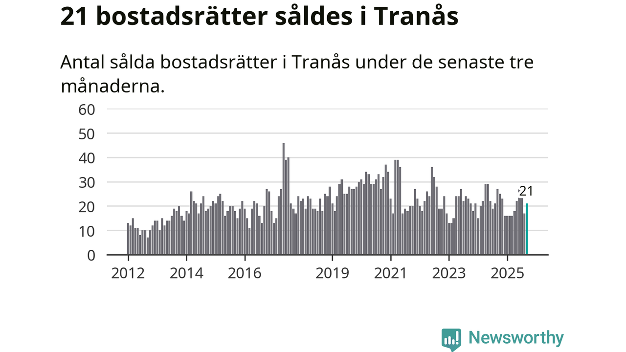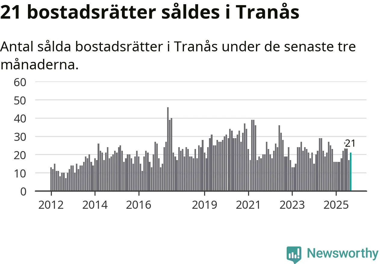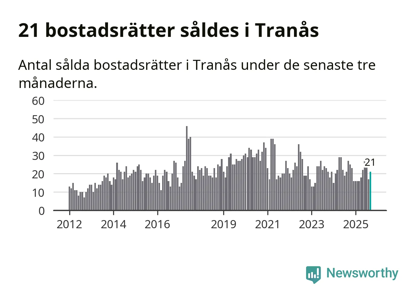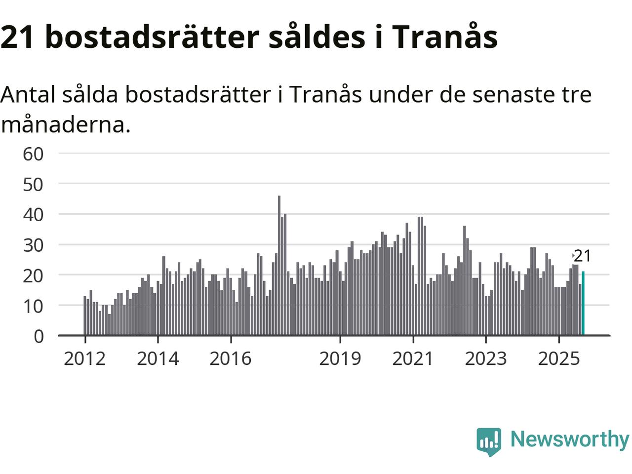 Mellan juli och september gjordes sammanlagt 21 affärer med bostadsrätter i Tranås kommun. Det kan jämföras med 27 vid motsvarande tid i fjol.