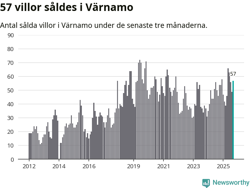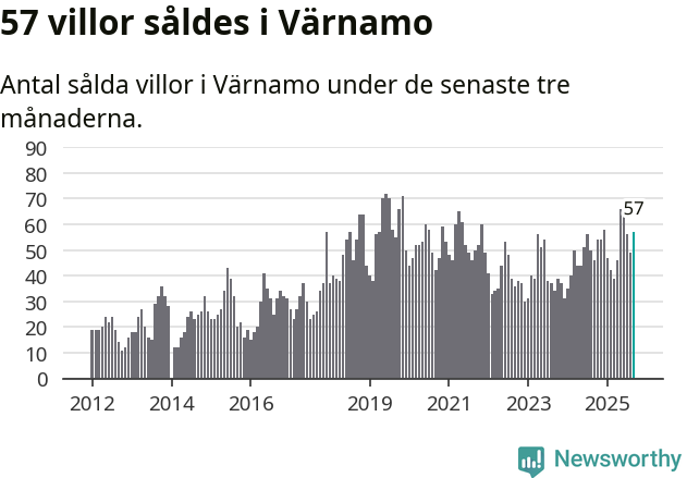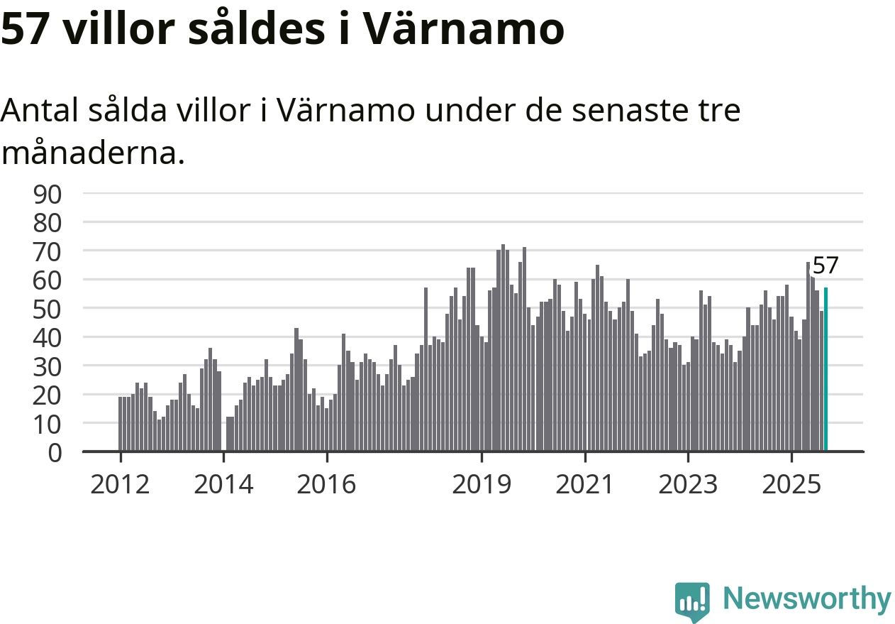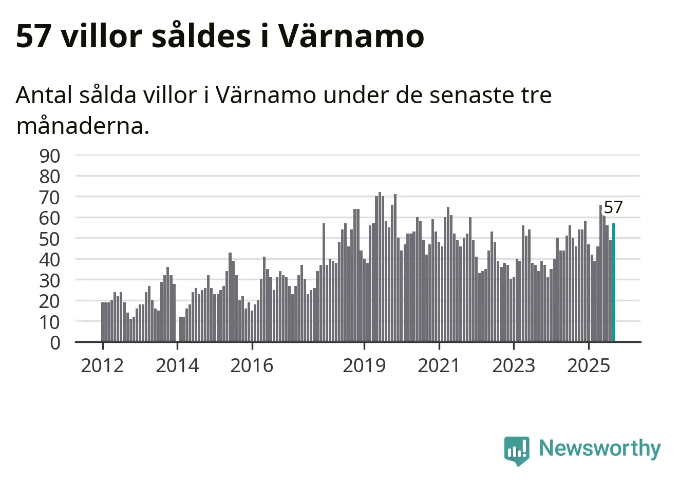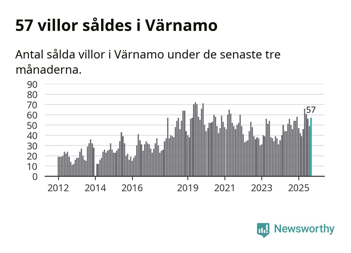 Sammanlagt såldes 57 villor i Värnamo kommun mellan juli och september till ett genomsnittligt pris på 2,6 miljoner kronor. I fjol gjordes 46 affärer vid den här tiden på året.