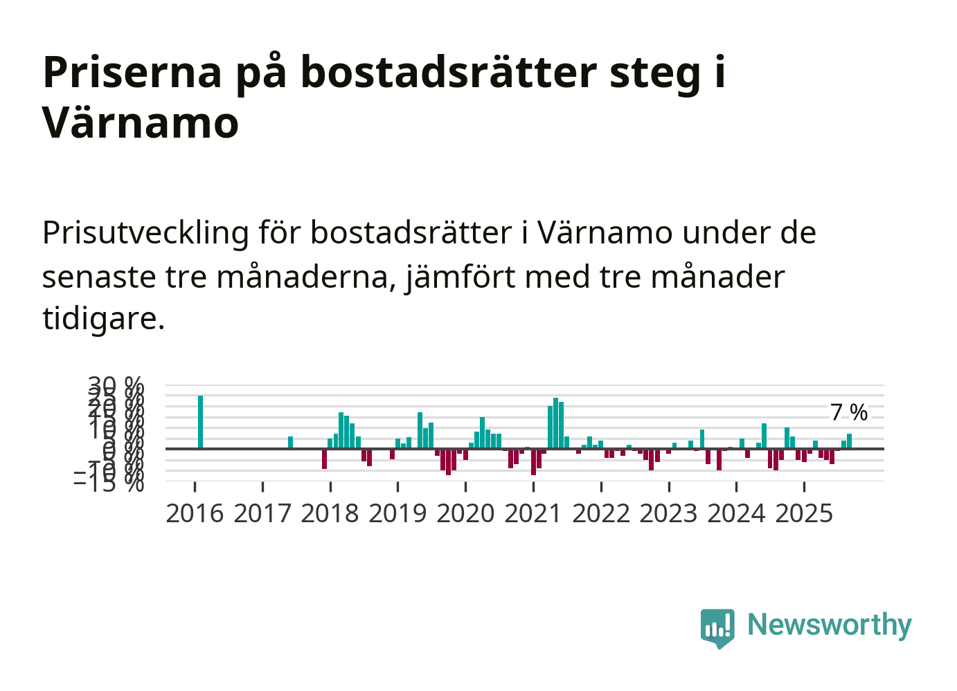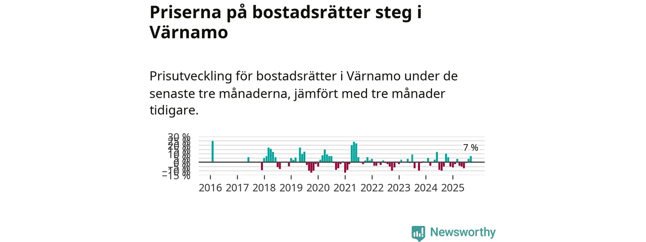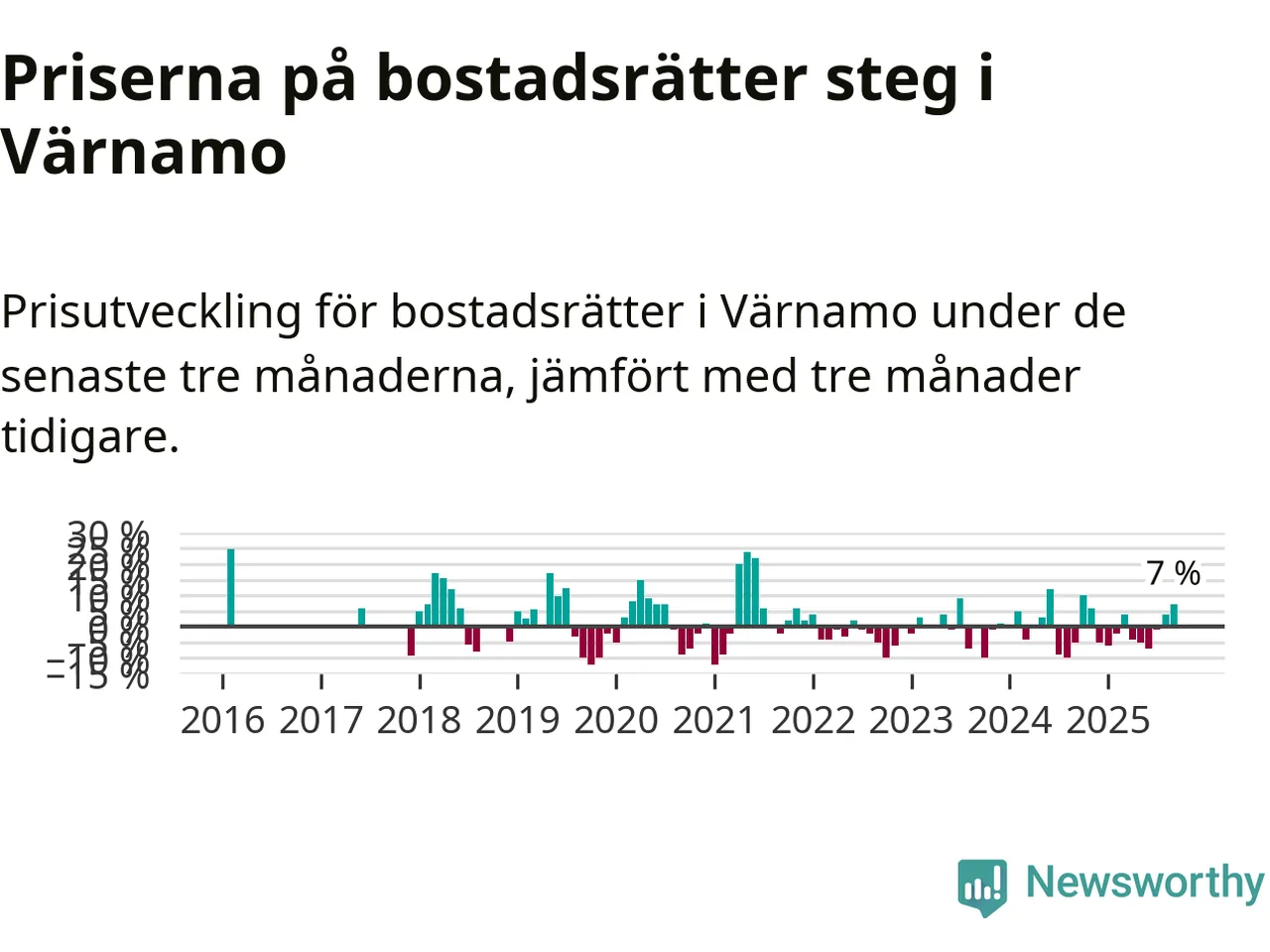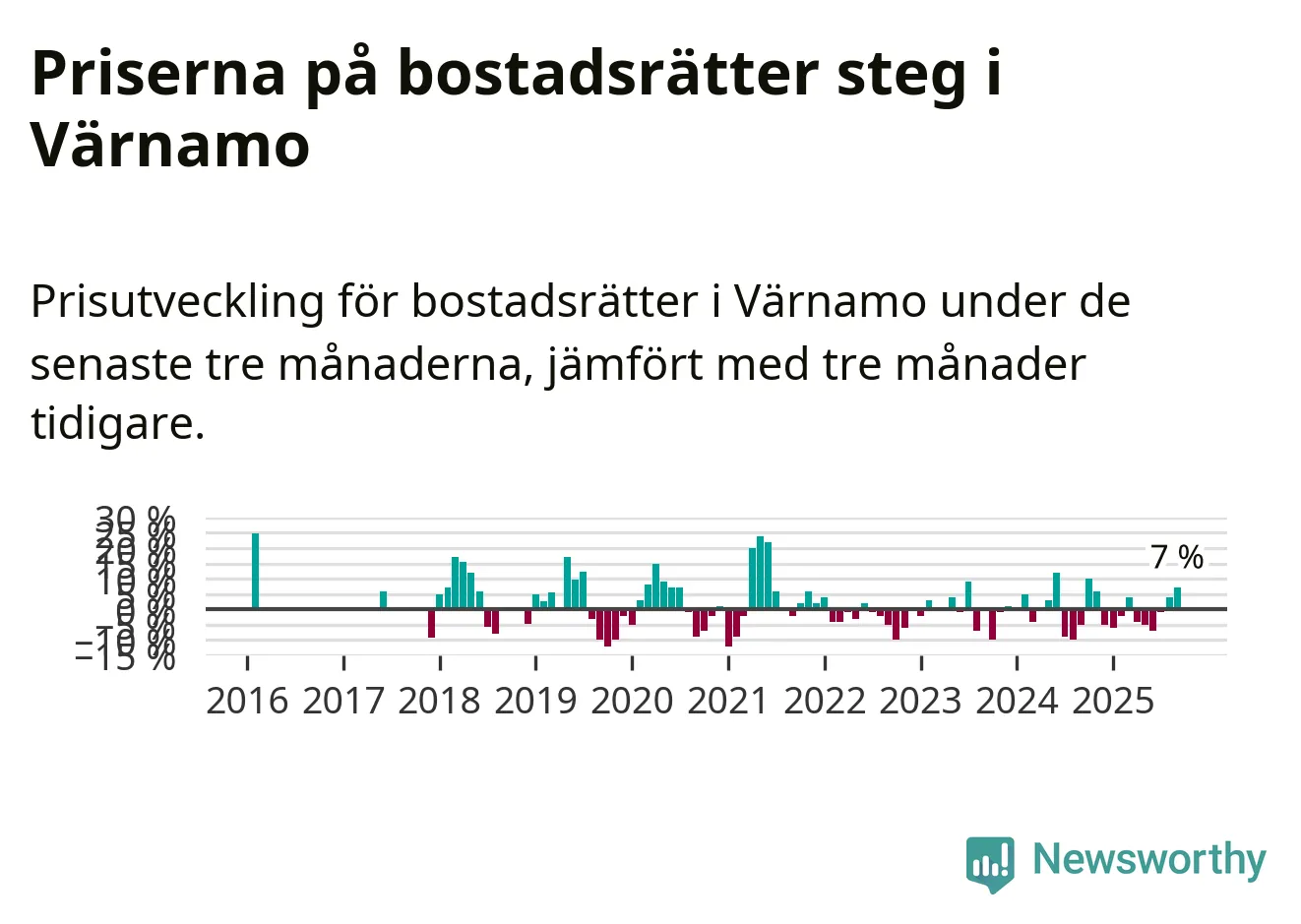 Priserna på bostadsrätter har gått upp i Värnamo kommun. Medelpriset på försäljningarna under de senaste tre månaderna visar på en uppgång med 7 procent.