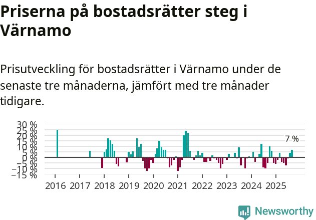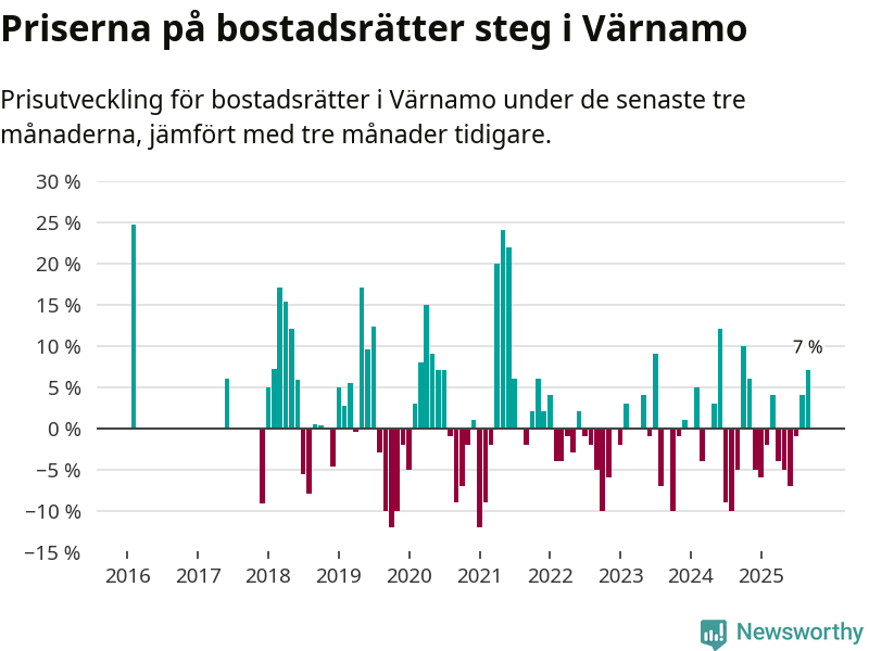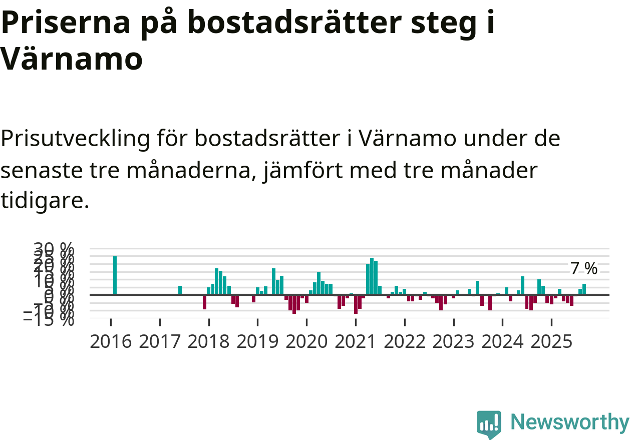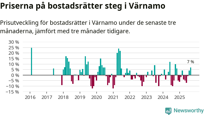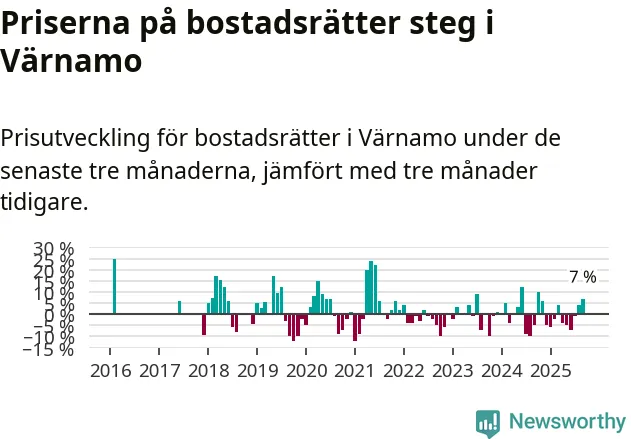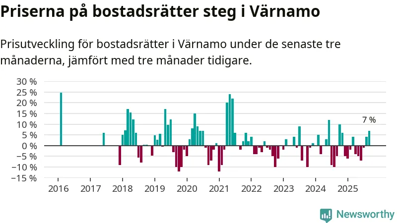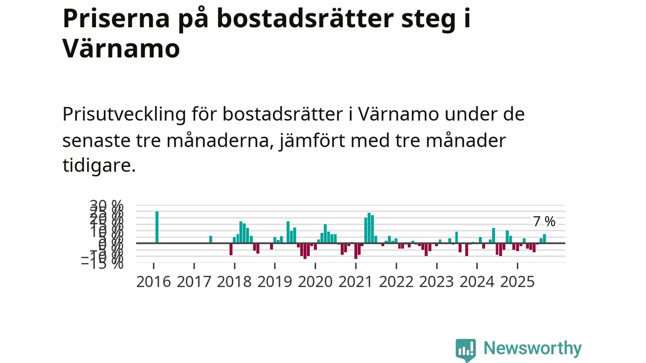 Priserna på bostadsrätter har gått upp i Värnamo kommun. Medelpriset på försäljningarna under de senaste tre månaderna visar på en uppgång med 7 procent.