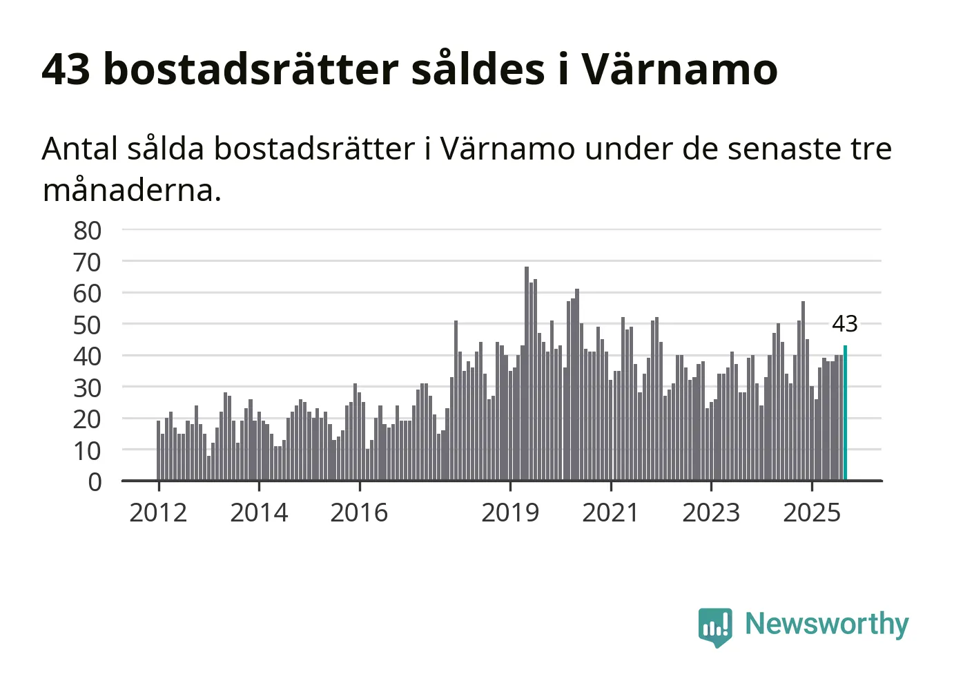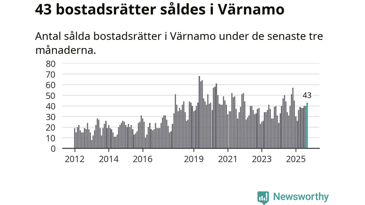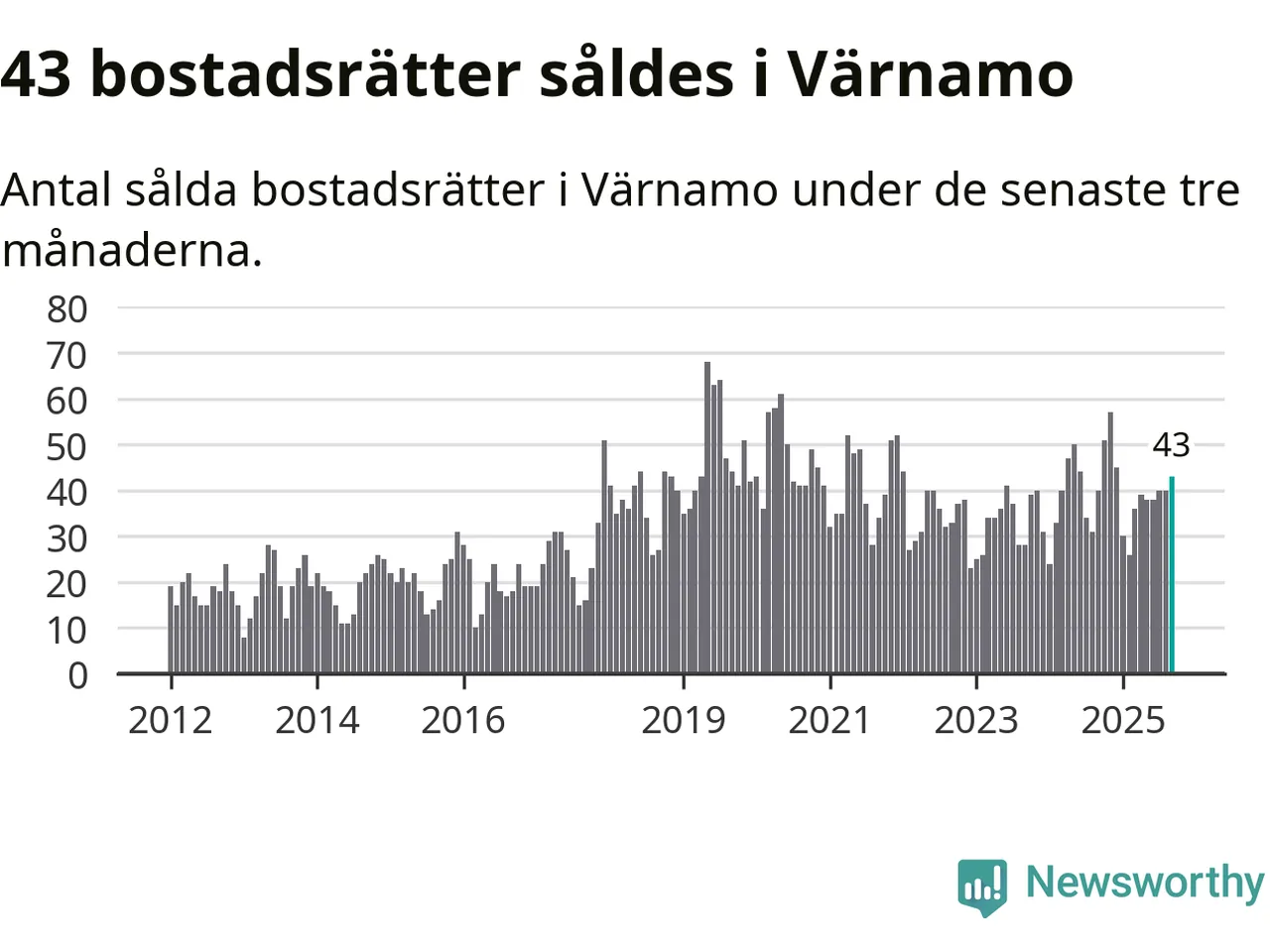 Sammanlagt såldes 43 bostadsrätter i Värnamo kommun mellan juli och september till ett genomsnittligt pris på 1,3 miljoner kronor. I fjol gjordes 40 affärer vid den här tiden på året.