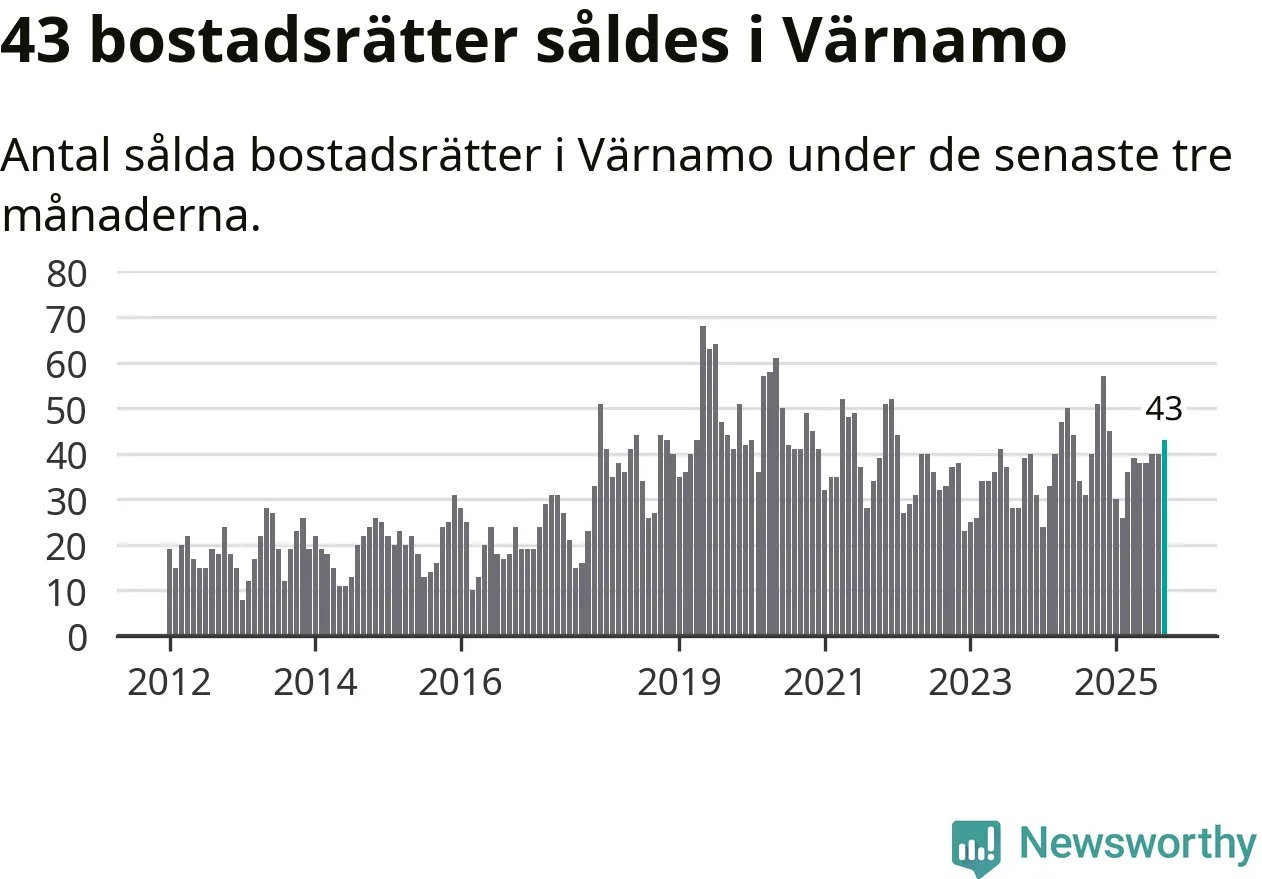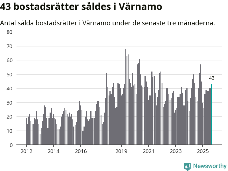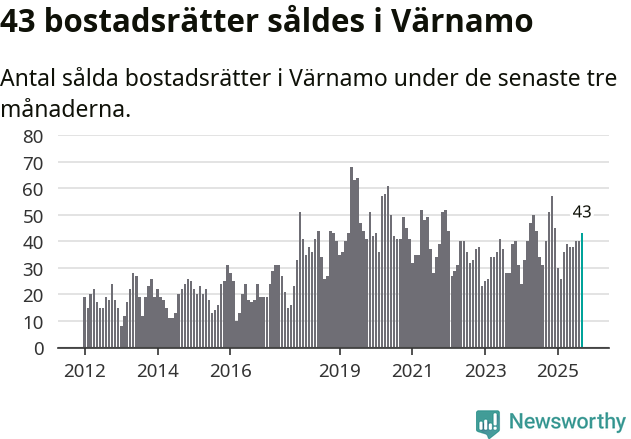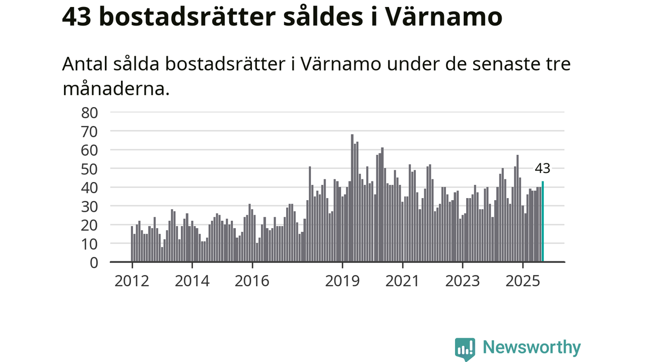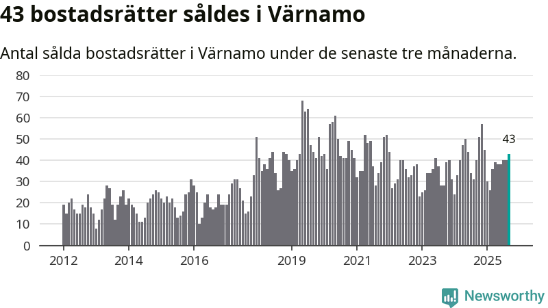 Sammanlagt såldes 43 bostadsrätter i Värnamo kommun mellan juli och september till ett genomsnittligt pris på 1,3 miljoner kronor. I fjol gjordes 40 affärer vid den här tiden på året.