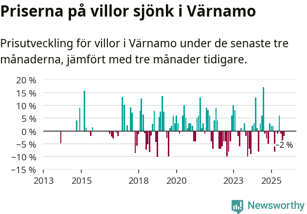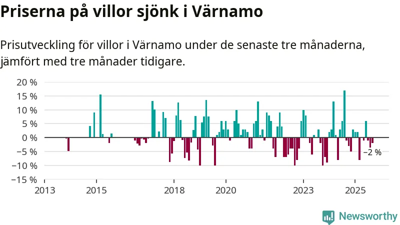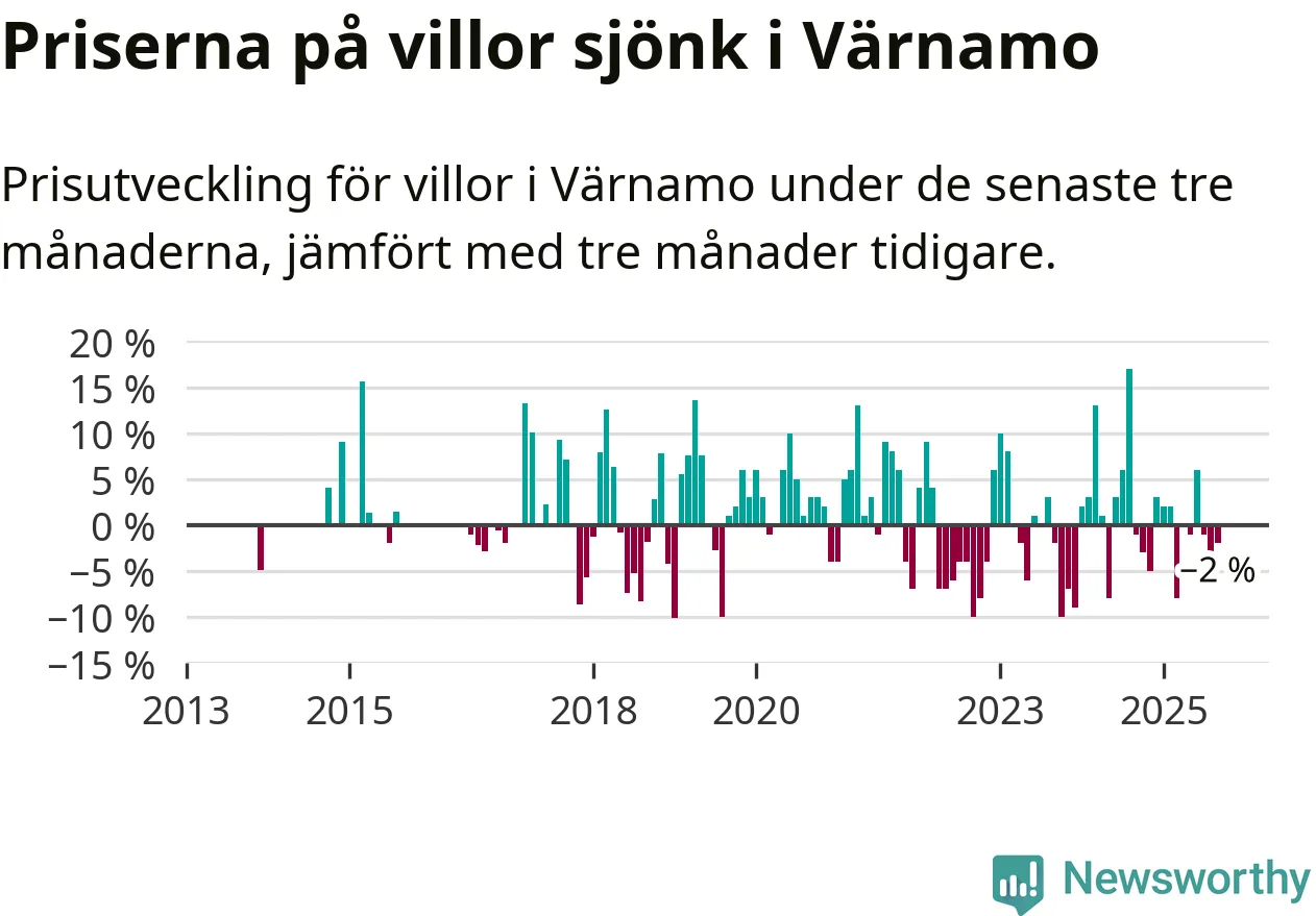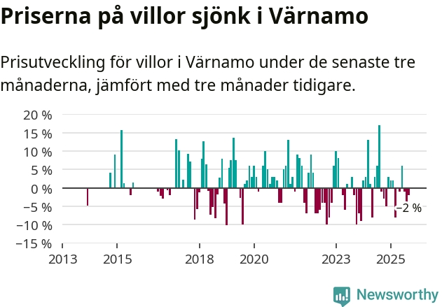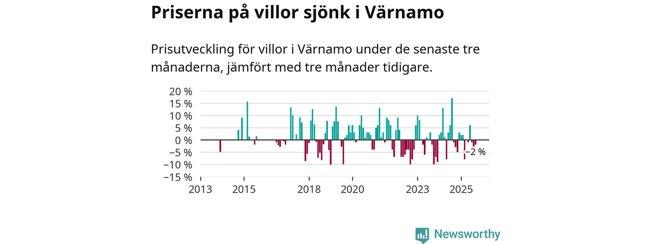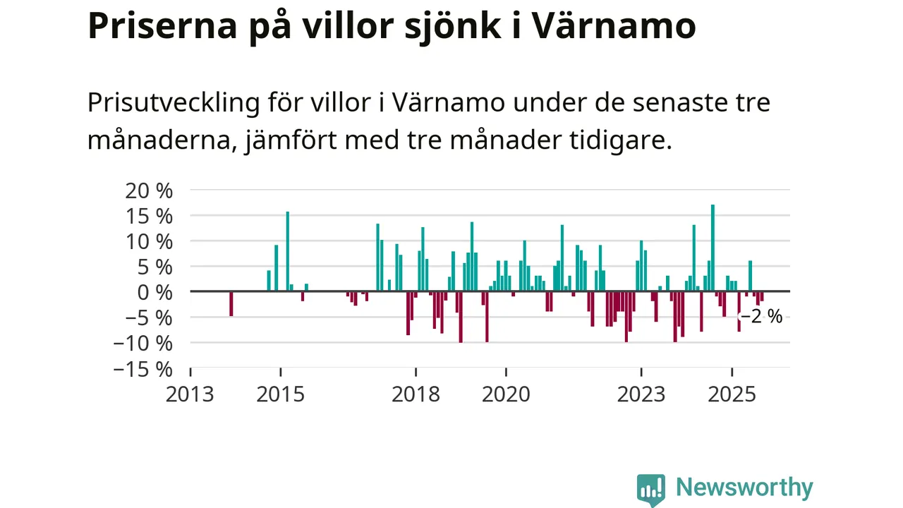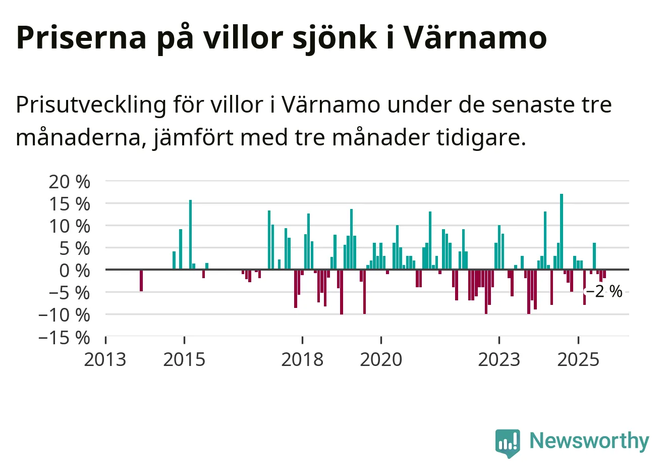 Villapriserna har gått ner i Värnamo kommun. Medelpriset på försäljningarna under de senaste tre månaderna visar på en nedgång med 2 procent.