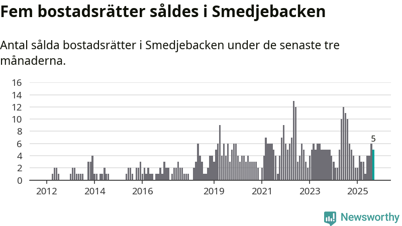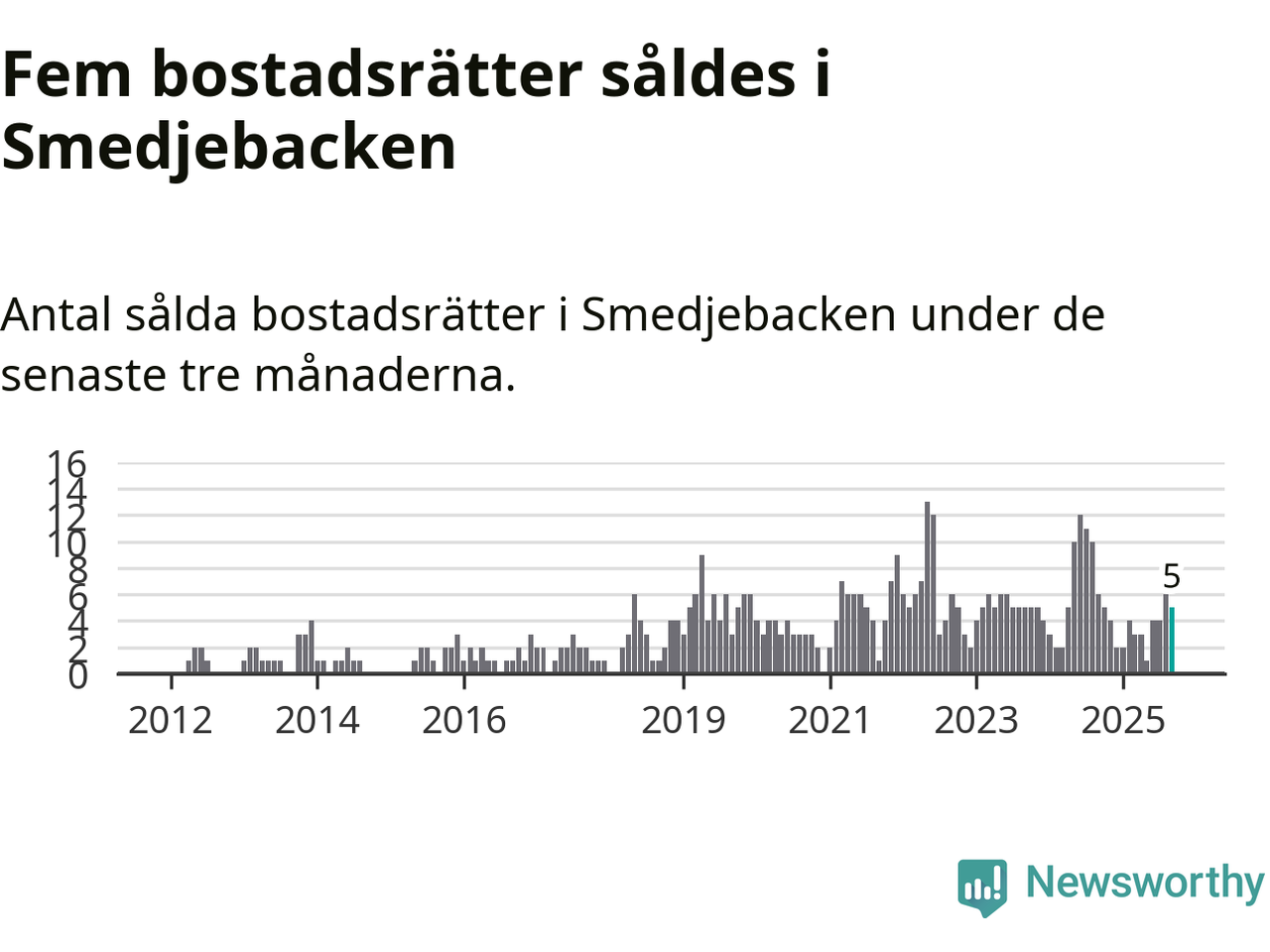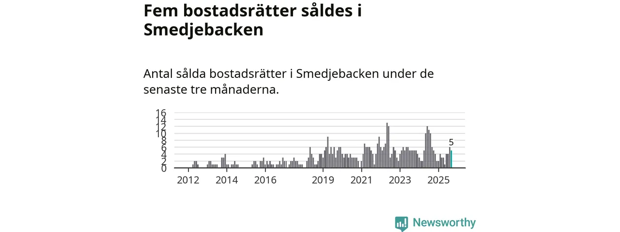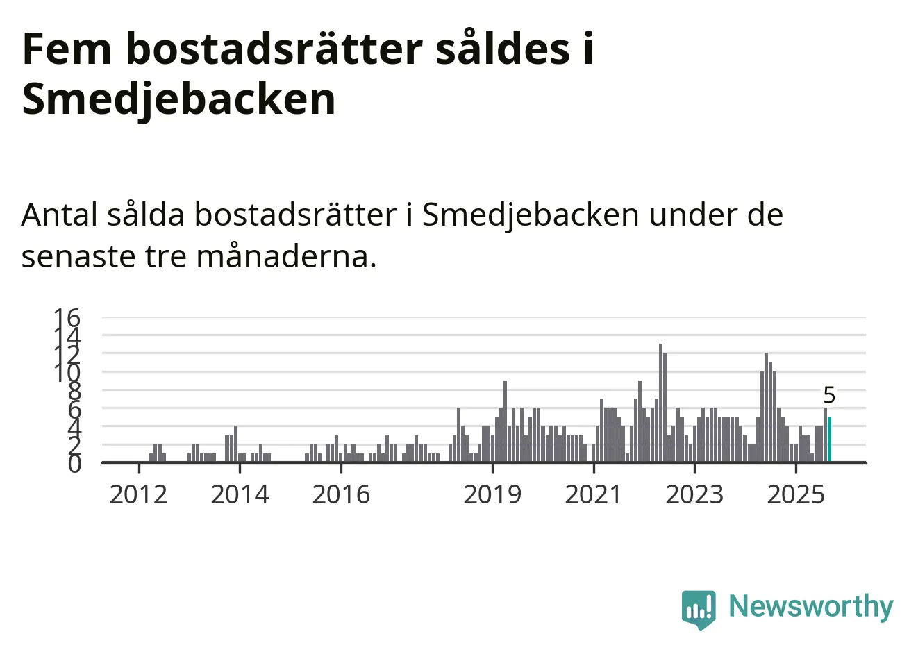 Mellan juli och september gjordes sammanlagt fem affärer med bostadsrätter i Smedjebackens kommun. Det kan jämföras med sex vid motsvarande tid i fjol.