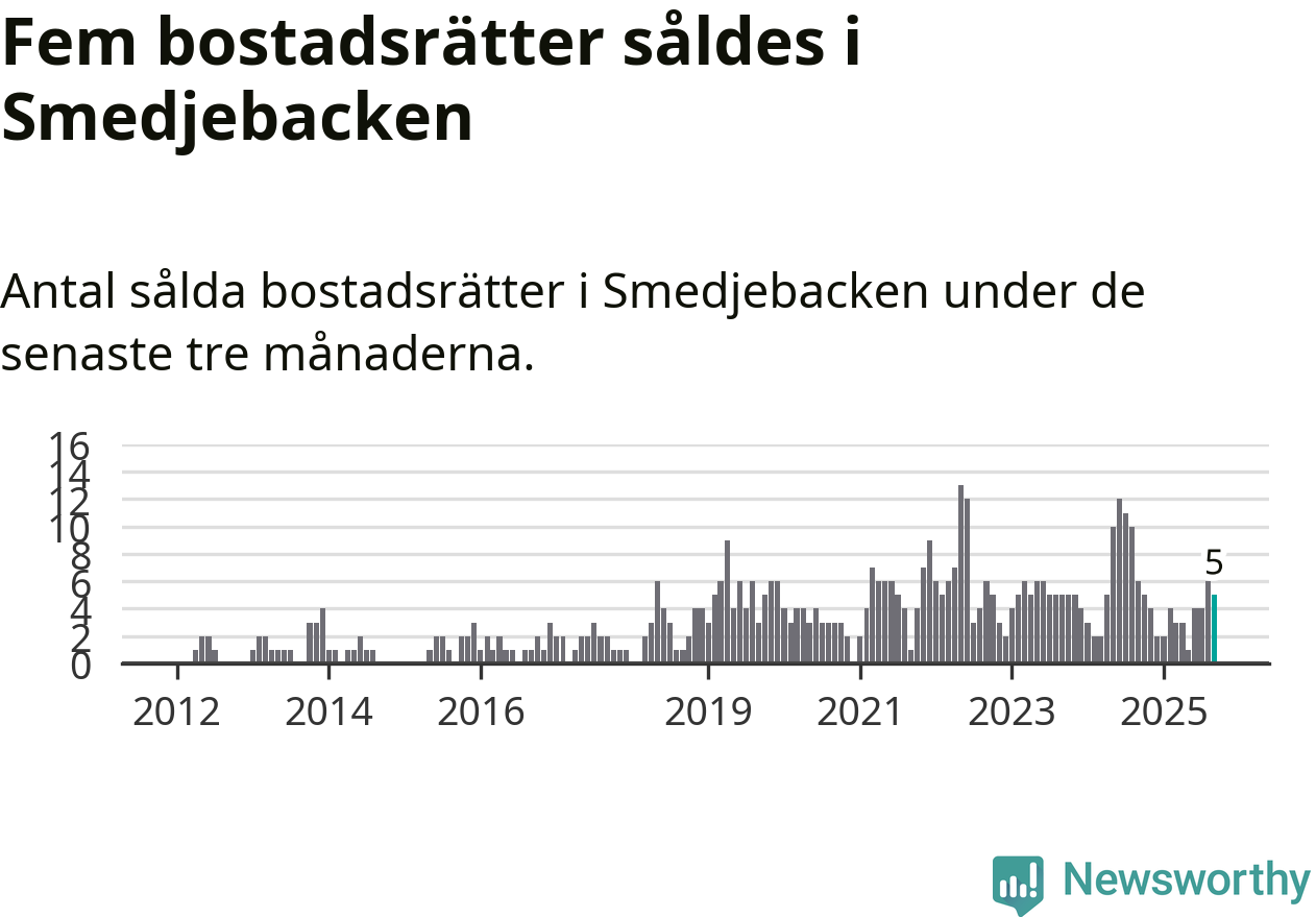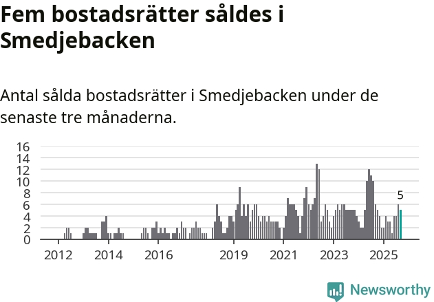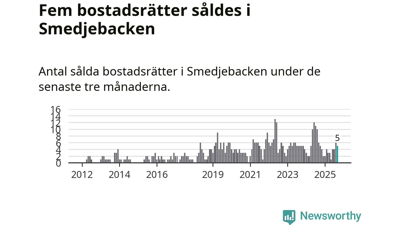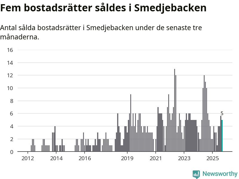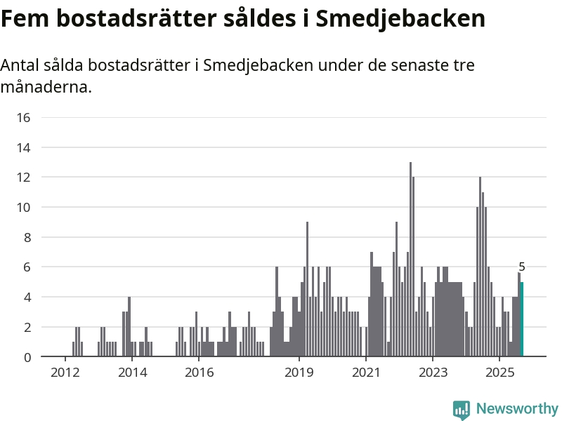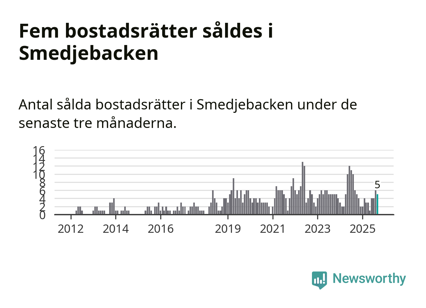 Mellan juli och september gjordes sammanlagt fem affärer med bostadsrätter i Smedjebackens kommun. Det kan jämföras med sex vid motsvarande tid i fjol.