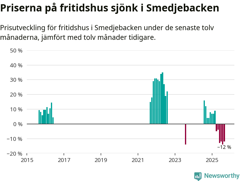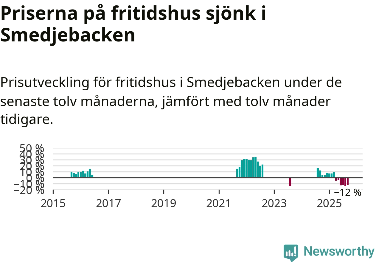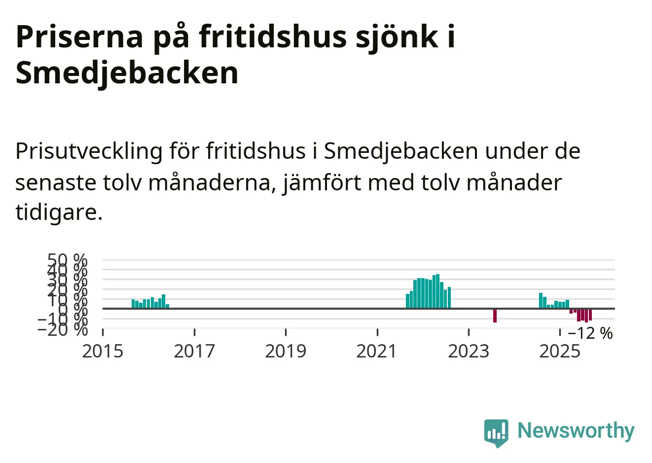 Statistiken visar även på en stor prisnedgång i Smedjebackens kommun. Medelpriset på försäljningarna av fritidshus i kommunen var 12 procent lägre än för ett år sedan. Även i hela Dalarna sjunker priserna på fritidshus. I hela länet noterades en prisnedgång på 1 procent.