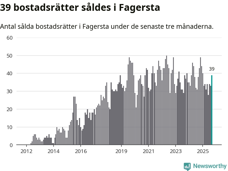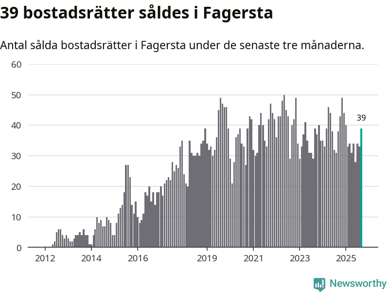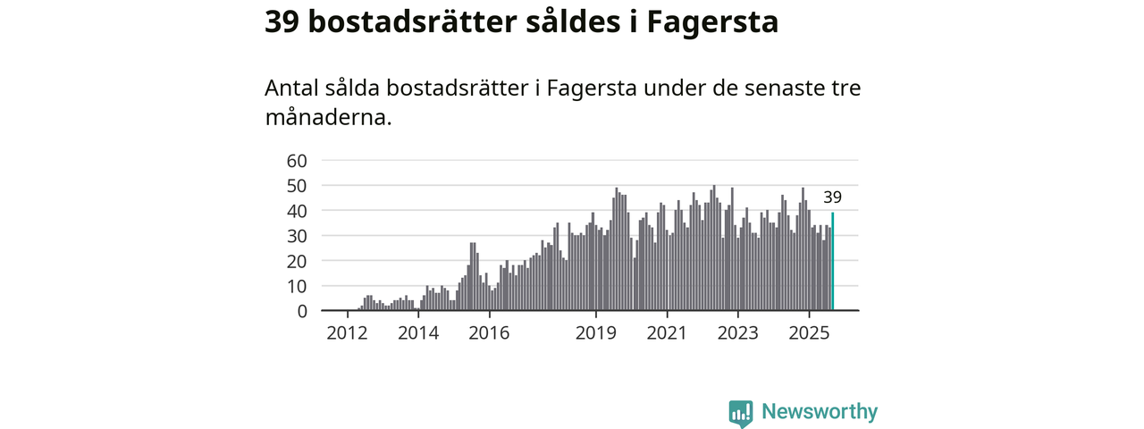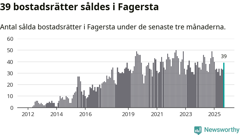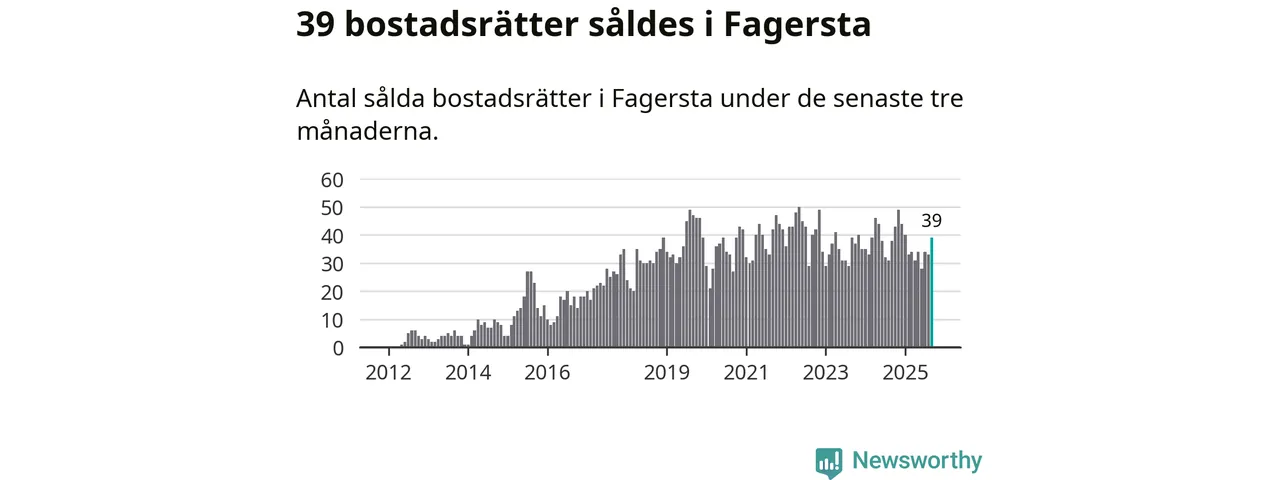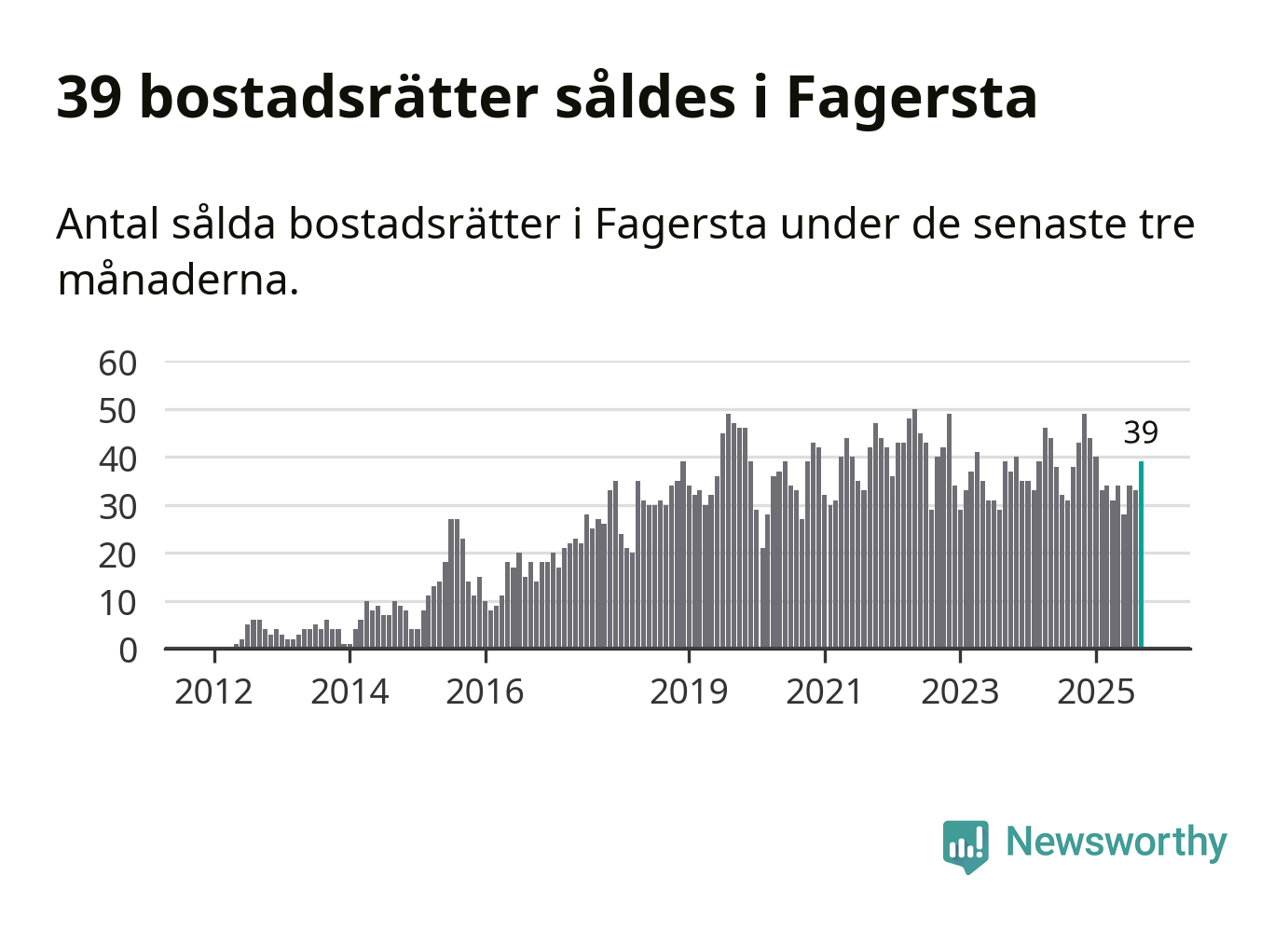Sammanlagt såldes 39 bostadsrätter i Fagersta kommun mellan juli och september till ett genomsnittligt pris på 0,2 miljoner kronor. I fjol gjordes 38 affärer vid den här tiden på året.