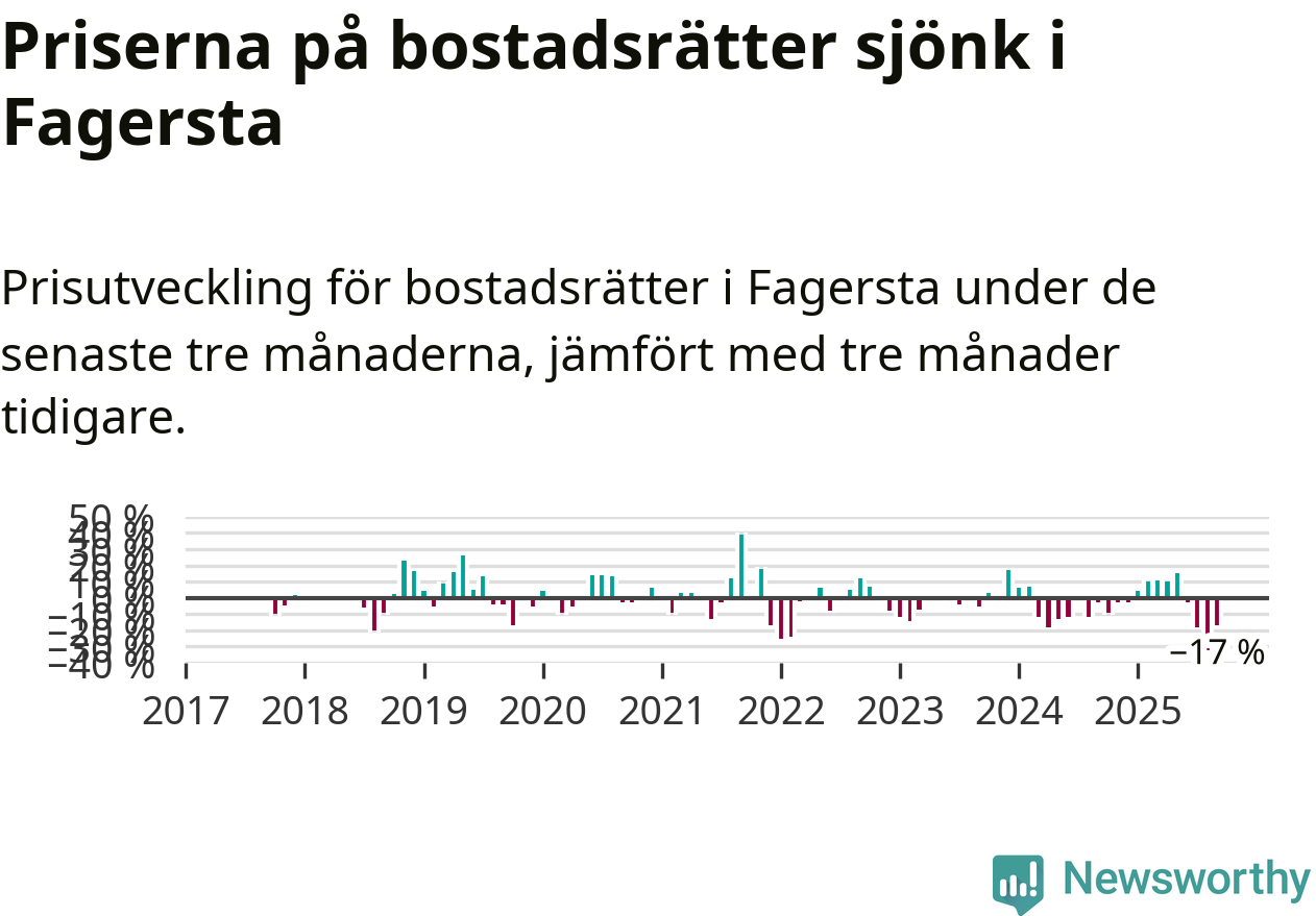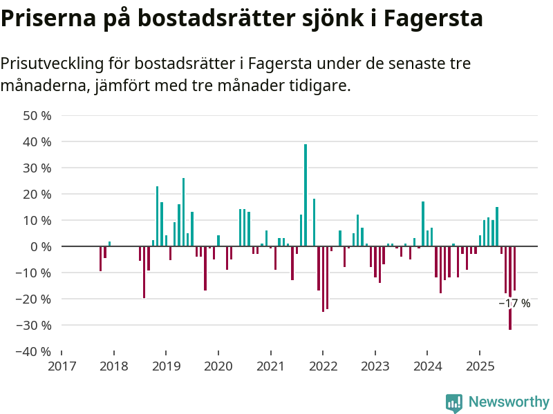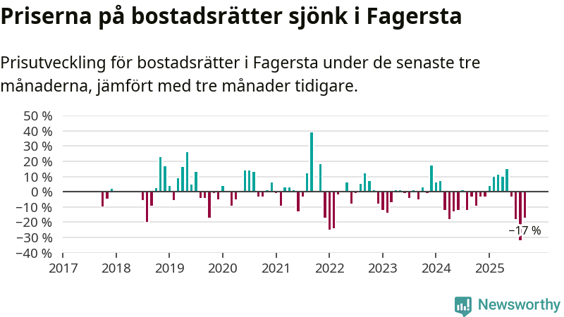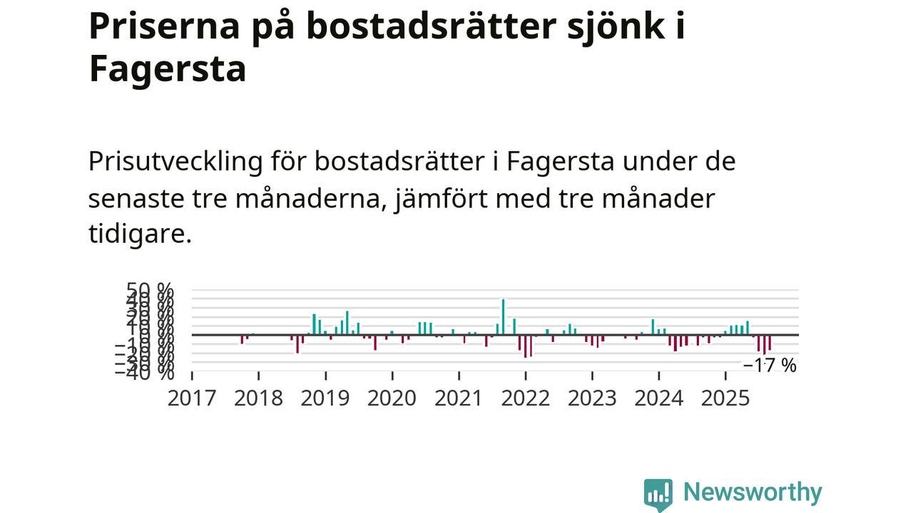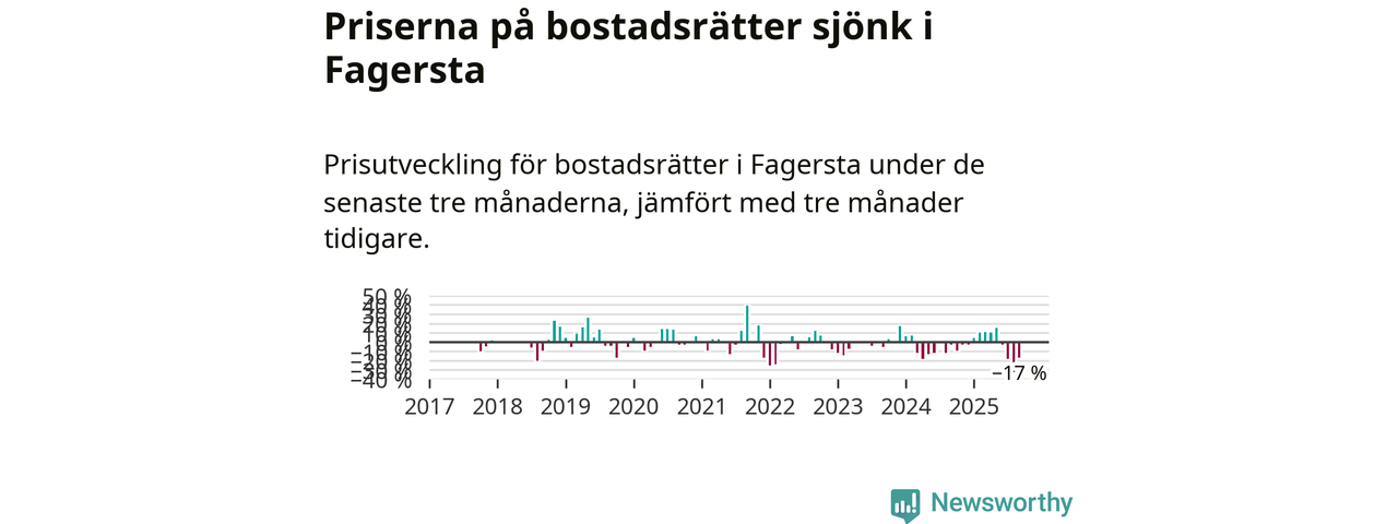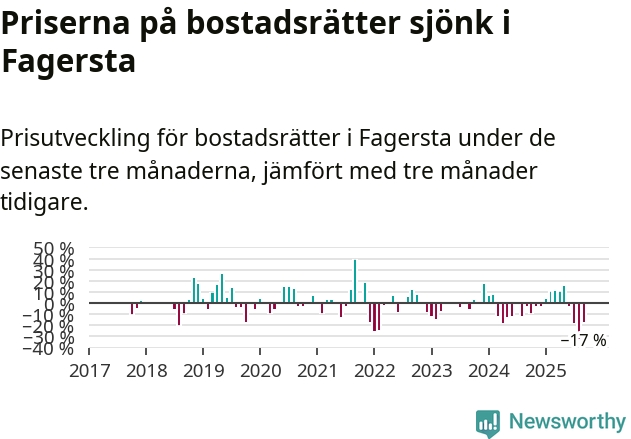Priserna på bostadsrätter har gått ner i Fagersta kommun. Medelpriset på försäljningarna under de senaste tre månaderna visar på en nedgång med 17 procent.