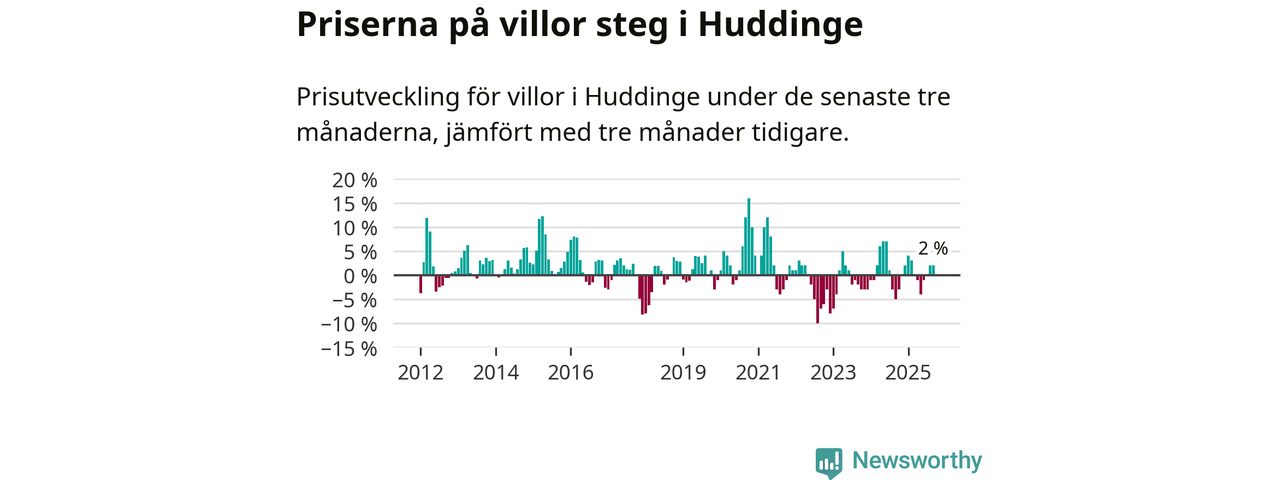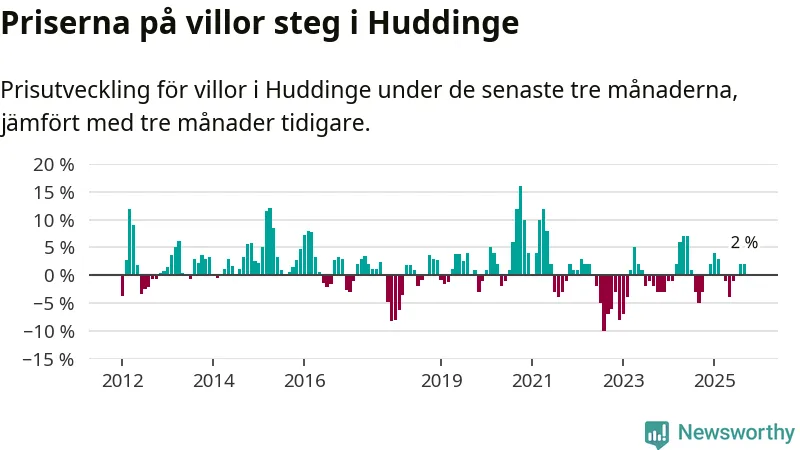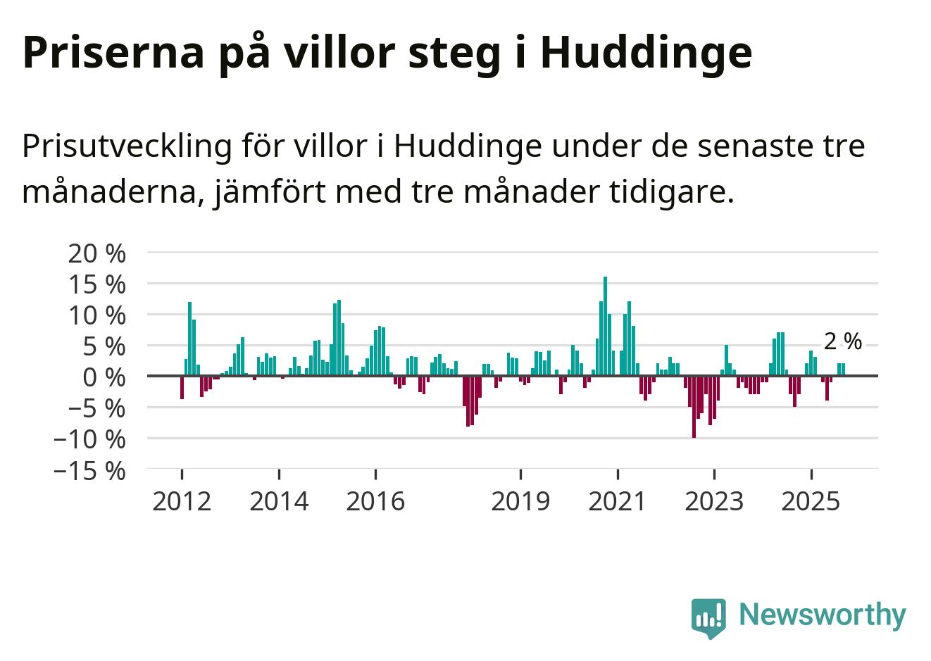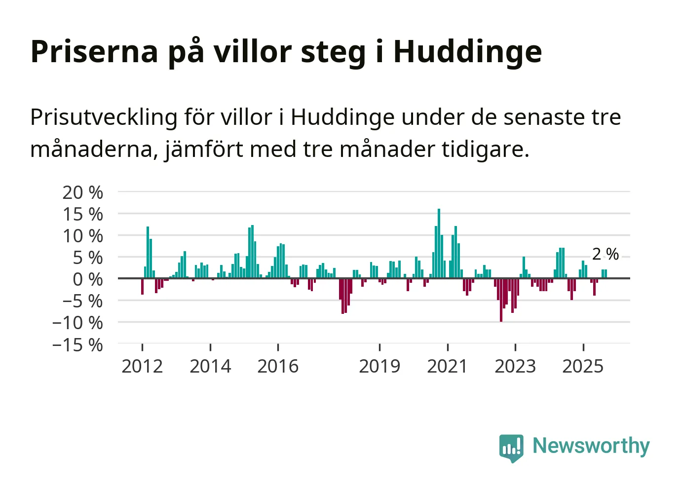 Villapriserna har gått upp i Huddinge kommun. Medelpriset på försäljningarna under de senaste tre månaderna visar på en uppgång med 2 procent.