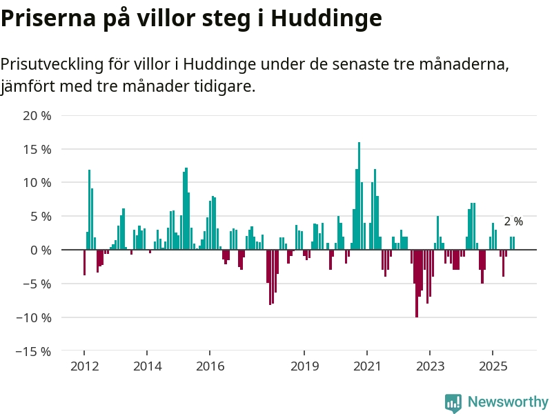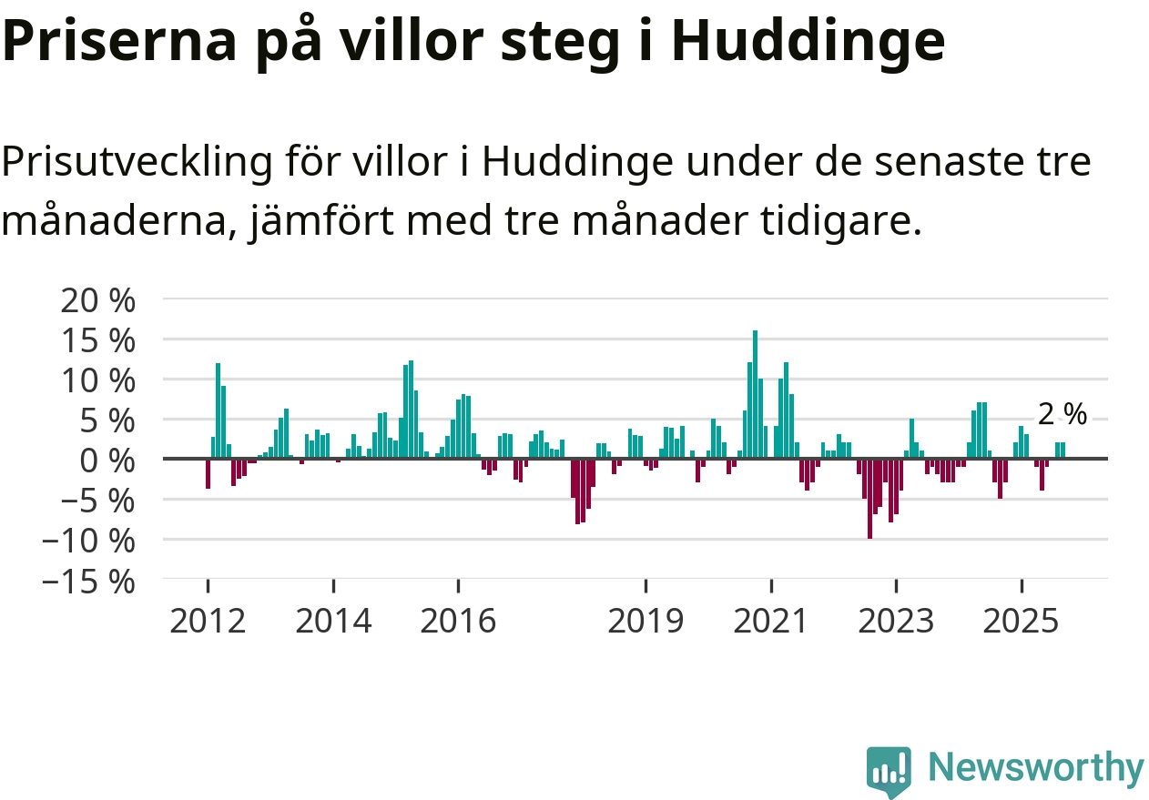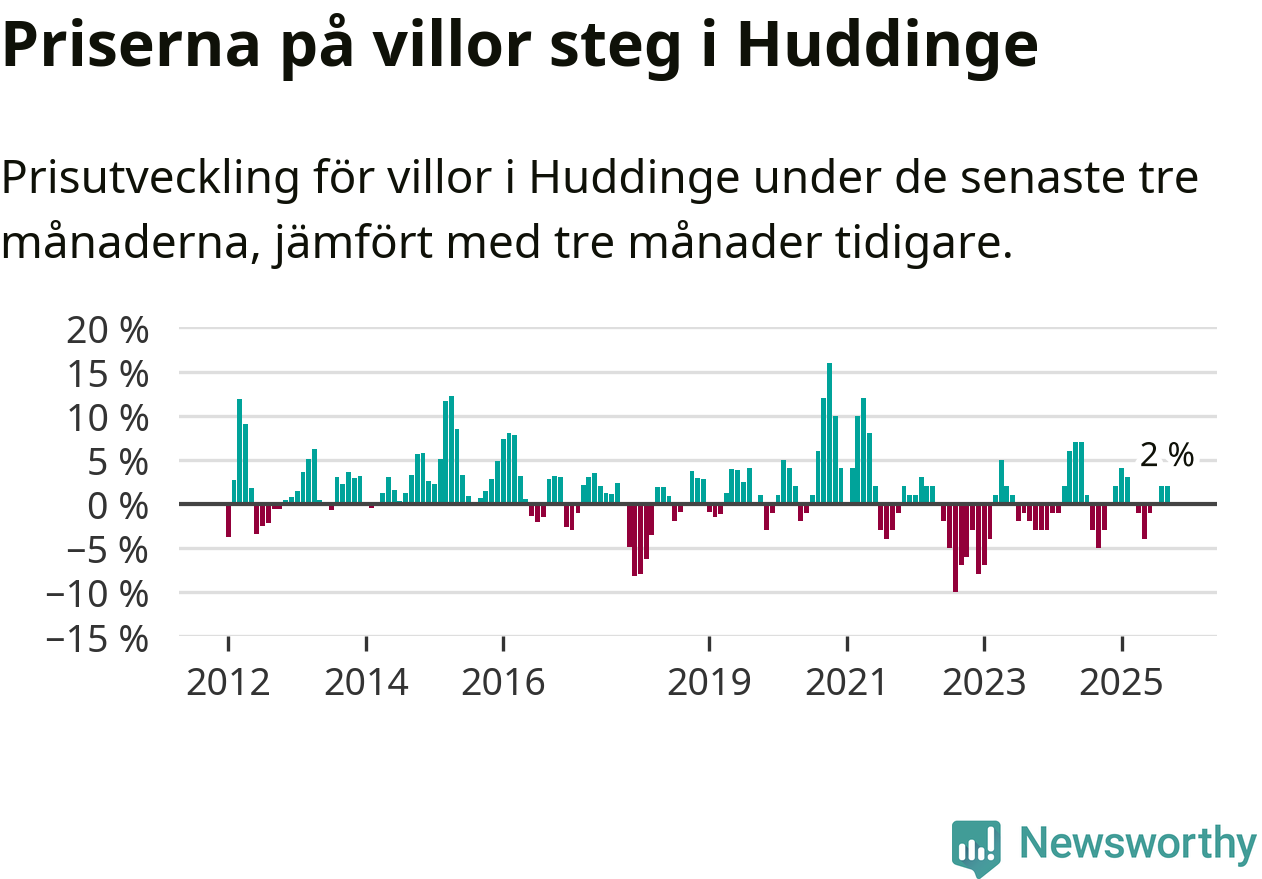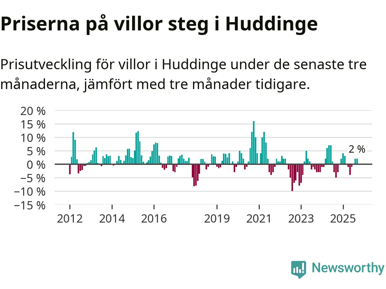 Villapriserna har gått upp i Huddinge kommun. Medelpriset på försäljningarna under de senaste tre månaderna visar på en uppgång med 2 procent.