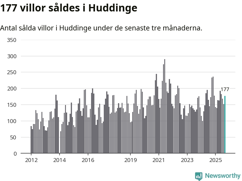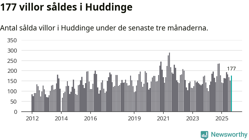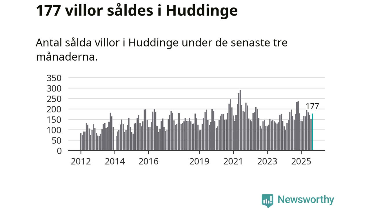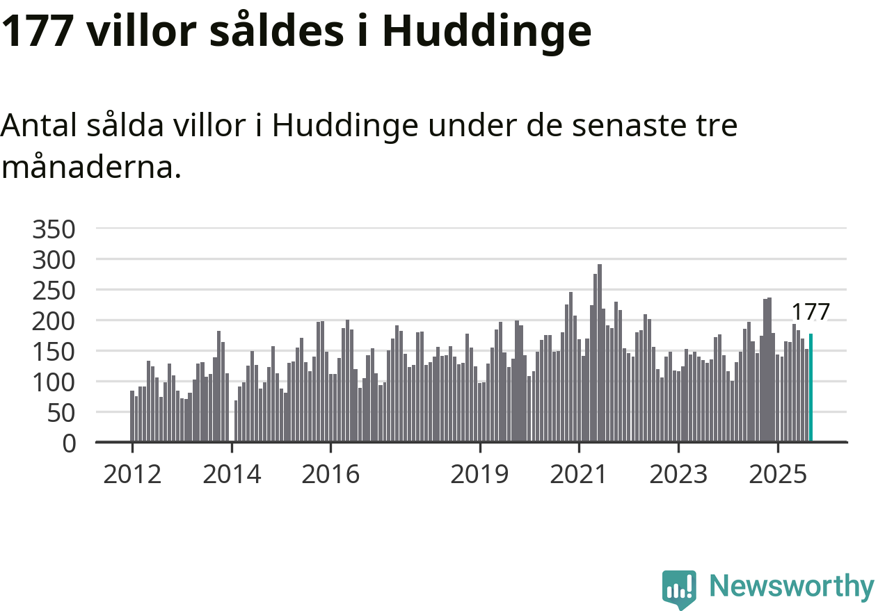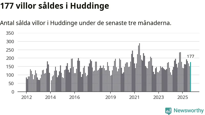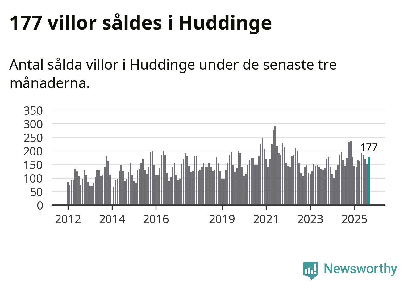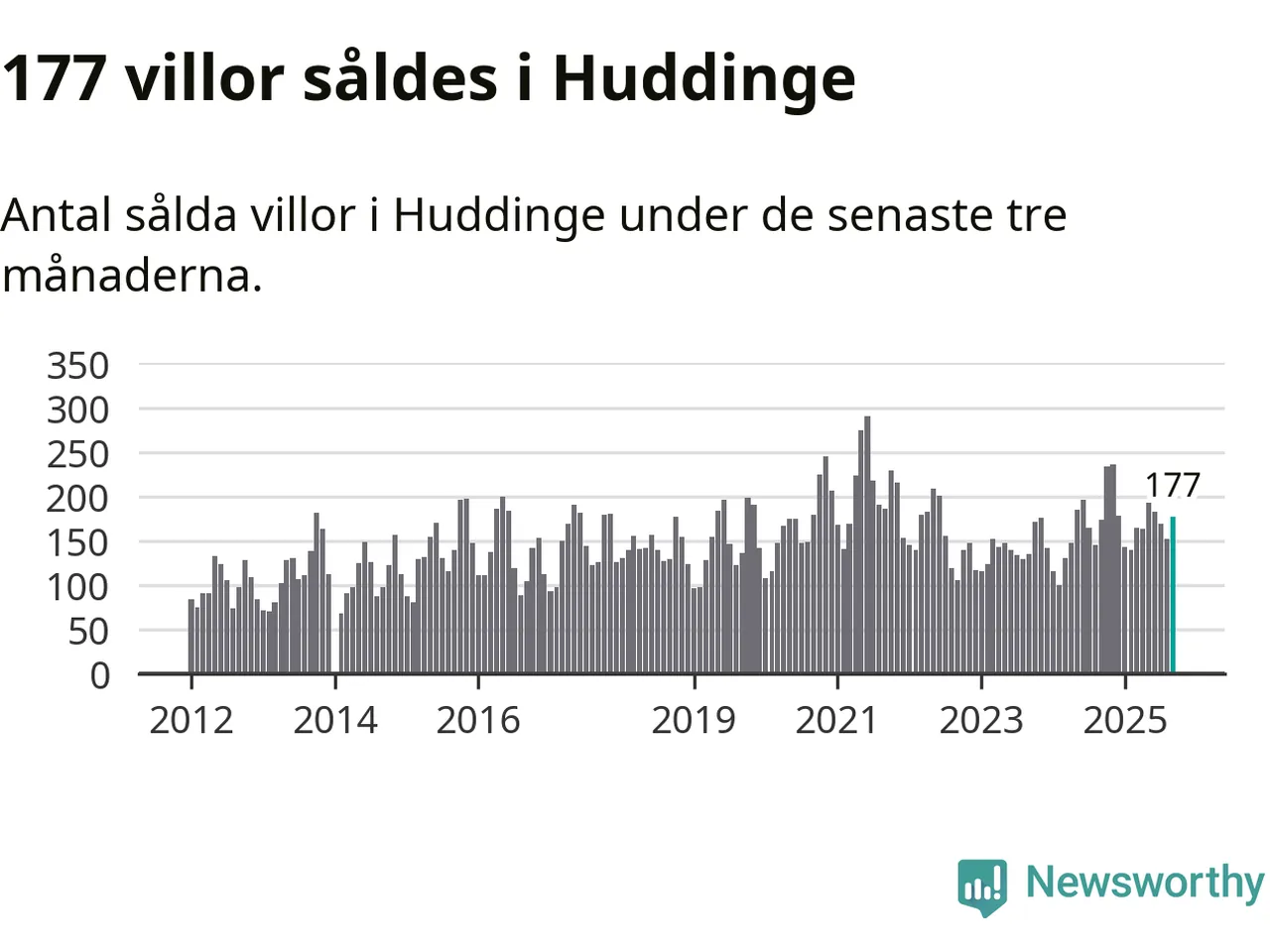 Sammanlagt såldes 177 villor i Huddinge kommun mellan juli och september till ett genomsnittligt pris på 6,4 miljoner kronor. I fjol gjordes 173 affärer vid den här tiden på året.