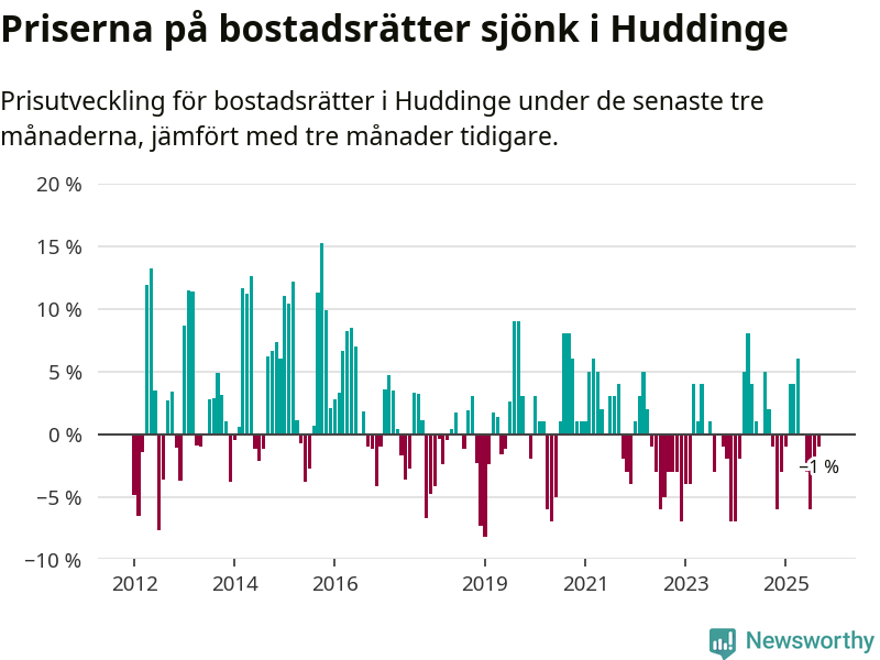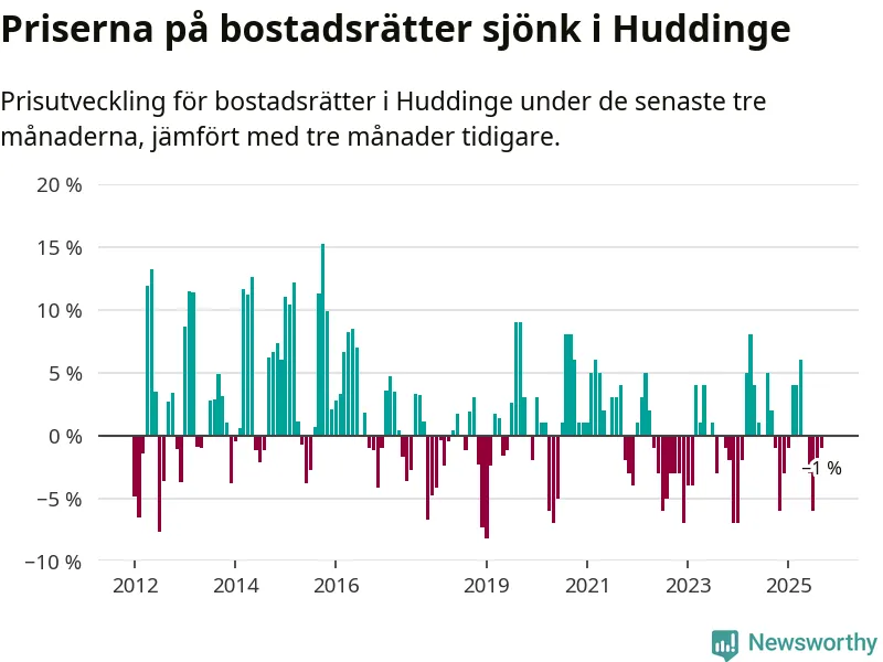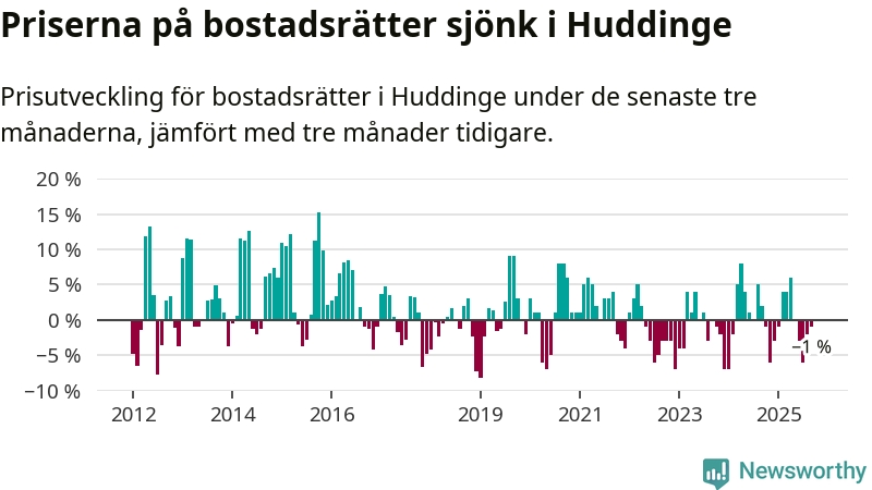 Priserna på bostadsrätter har gått ner i Huddinge kommun. Medelpriset på försäljningarna under de senaste tre månaderna visar på en nedgång med 1 procent.