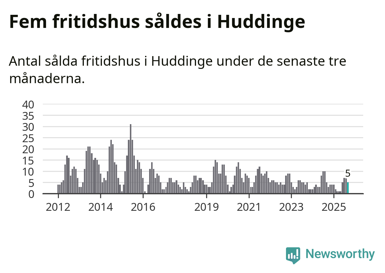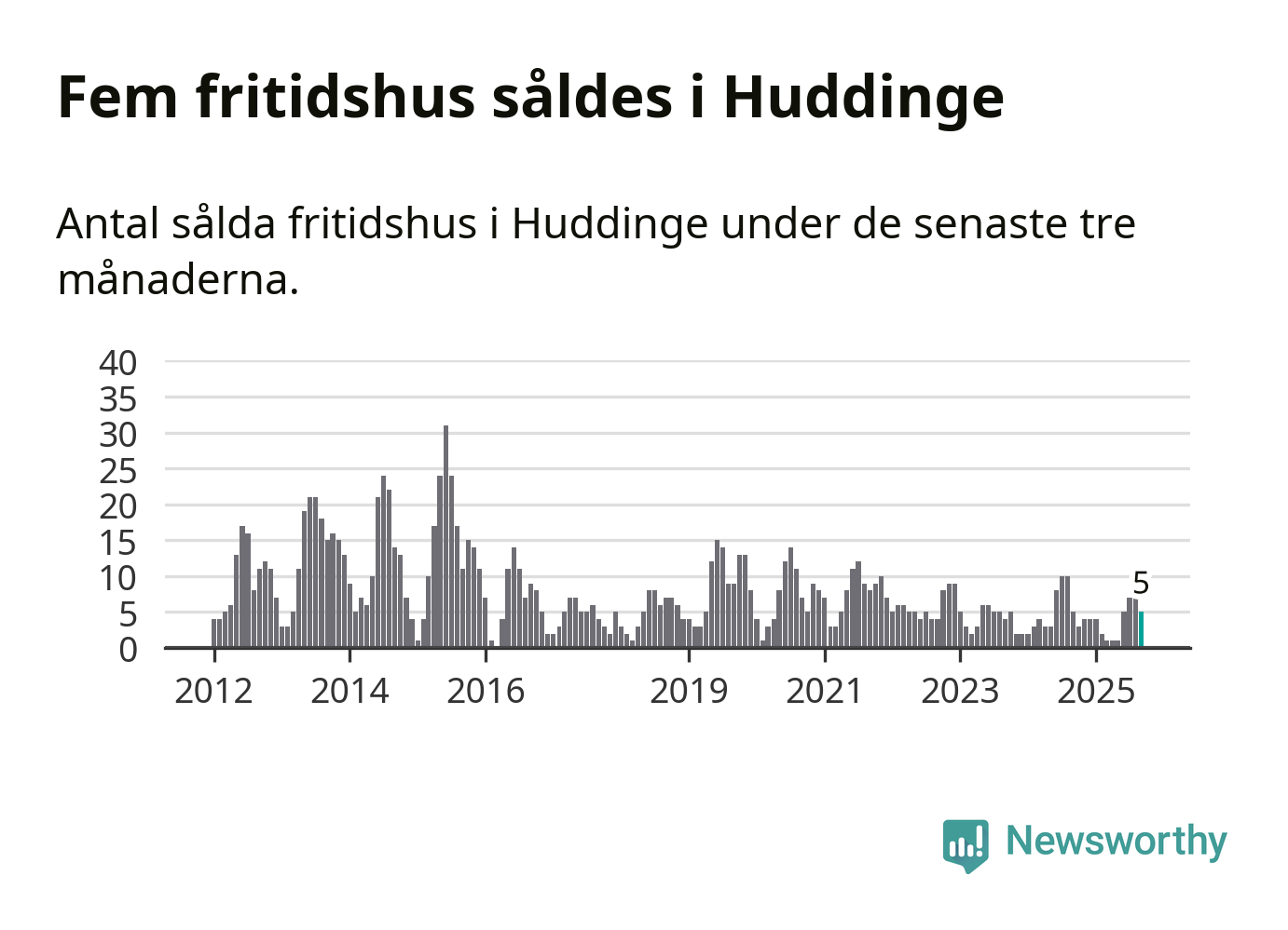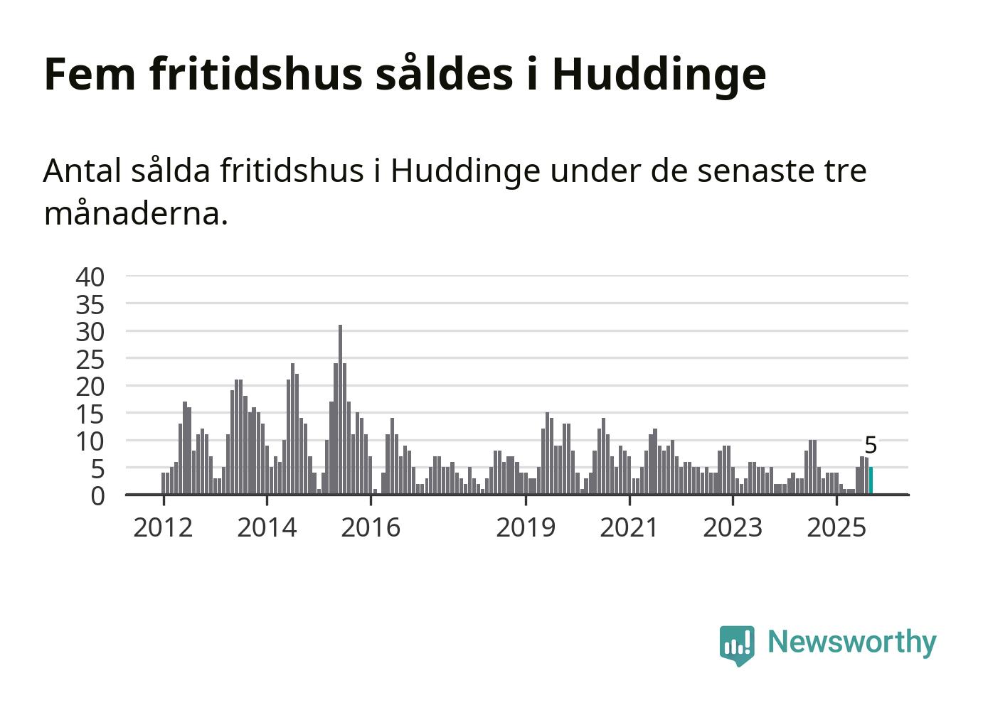Mellan juli och september gjordes sammanlagt fem affärer med fritidshus i Huddinge kommun. Det är lika många affärer som vid motsvarande tid i fjol.