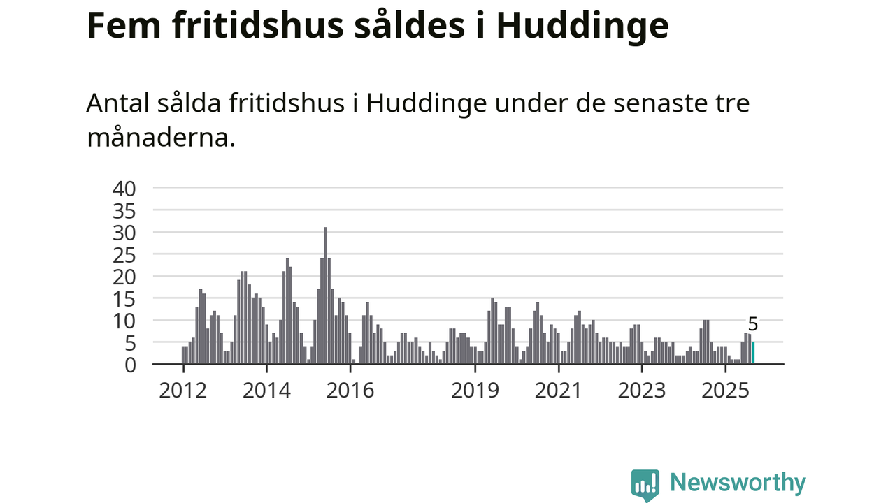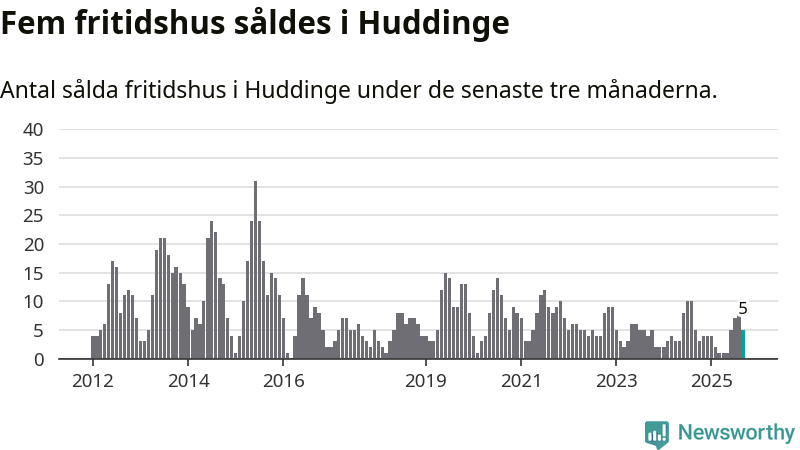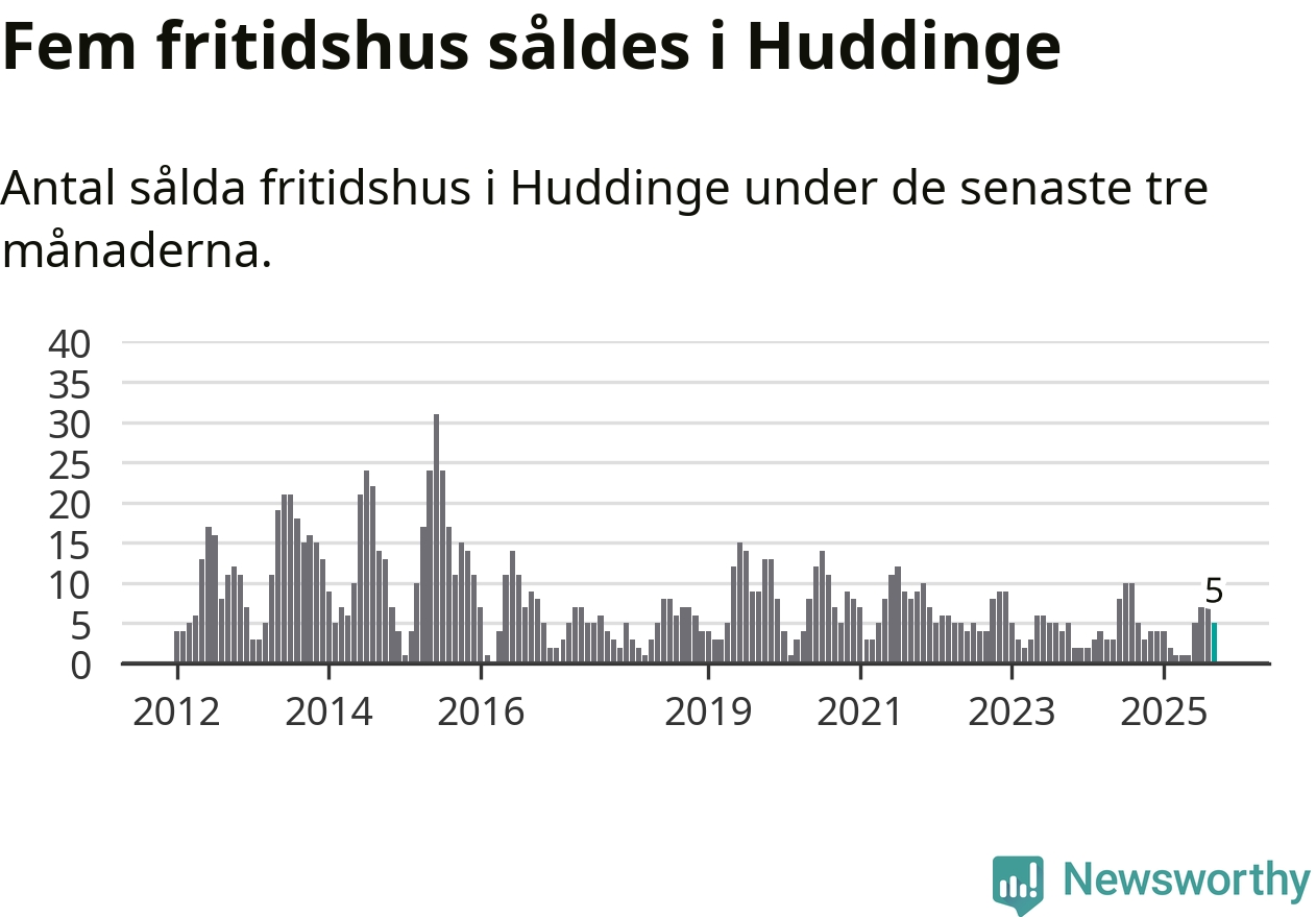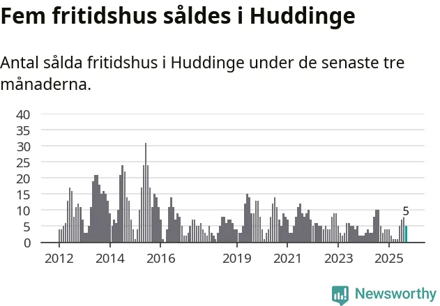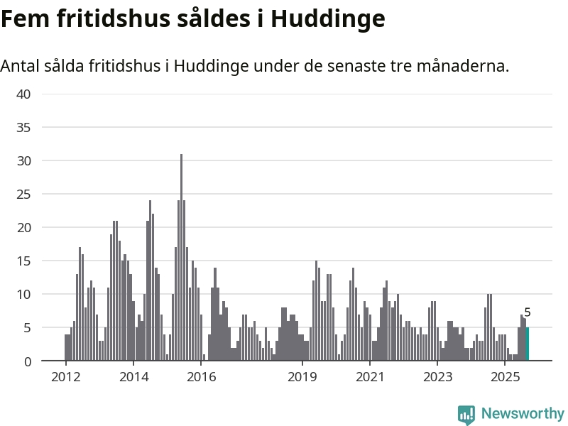 Mellan juli och september gjordes sammanlagt fem affärer med fritidshus i Huddinge kommun. Det är lika många affärer som vid motsvarande tid i fjol.