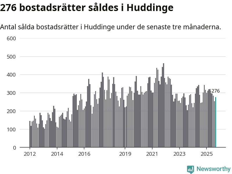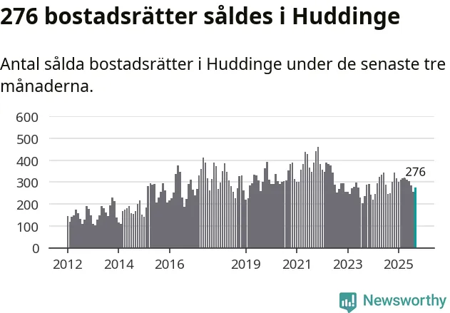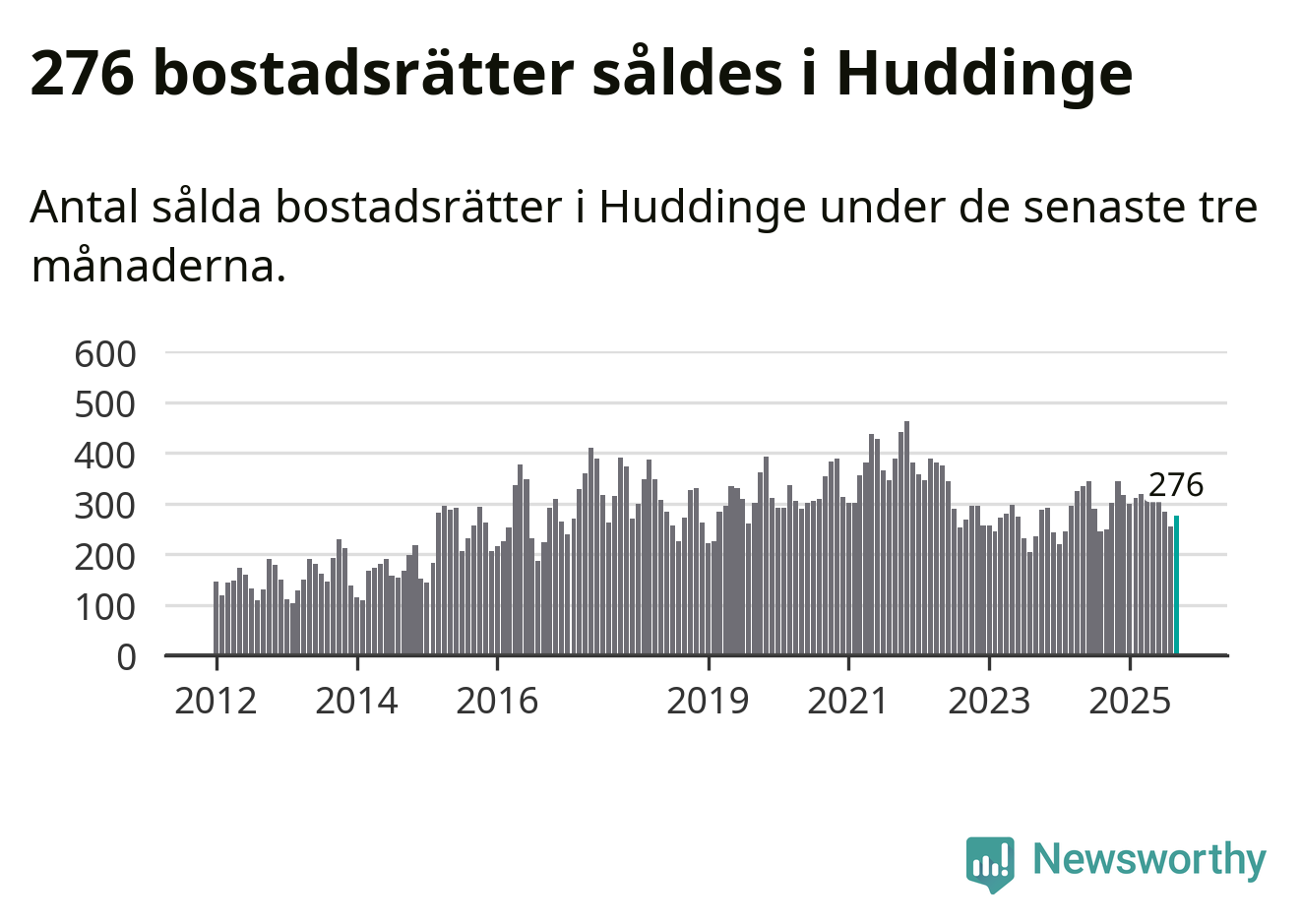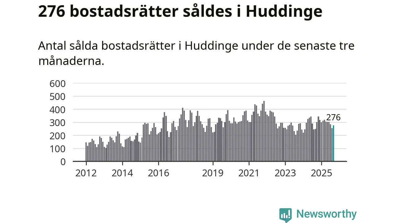Sammanlagt såldes 276 bostadsrätter i Huddinge kommun mellan juli och september till ett genomsnittligt pris på 2,7 miljoner kronor. I fjol gjordes 248 affärer vid den här tiden på året.