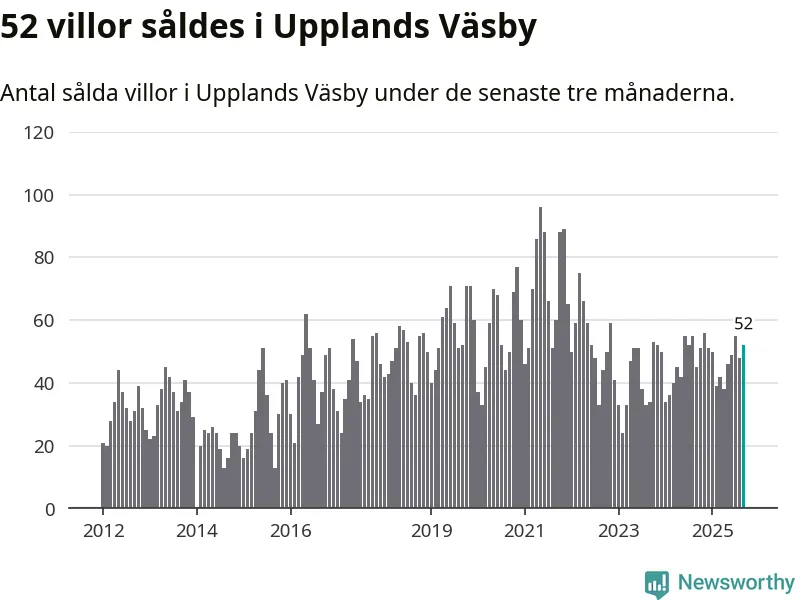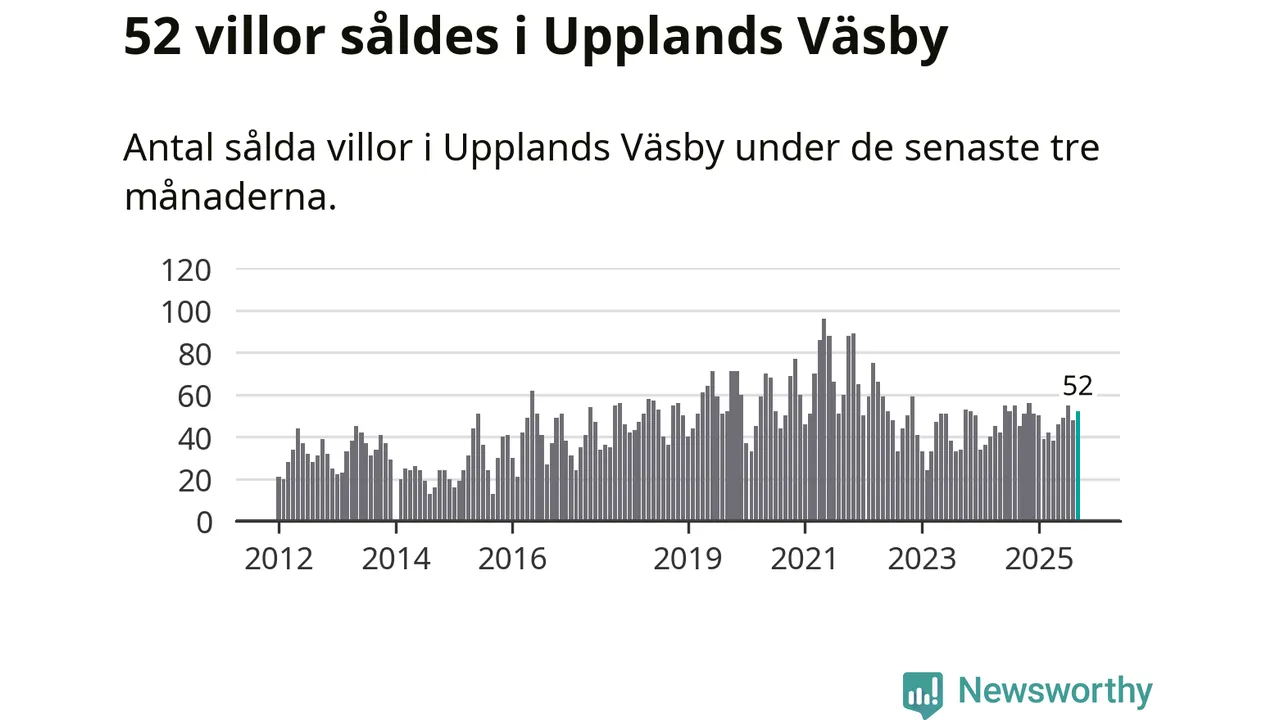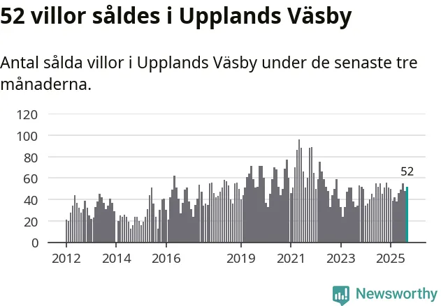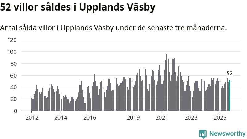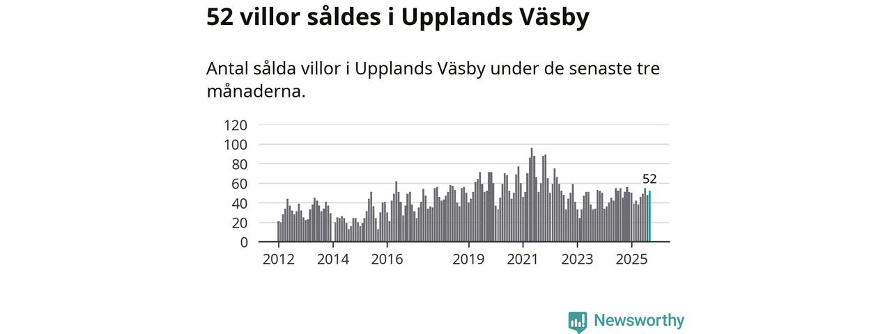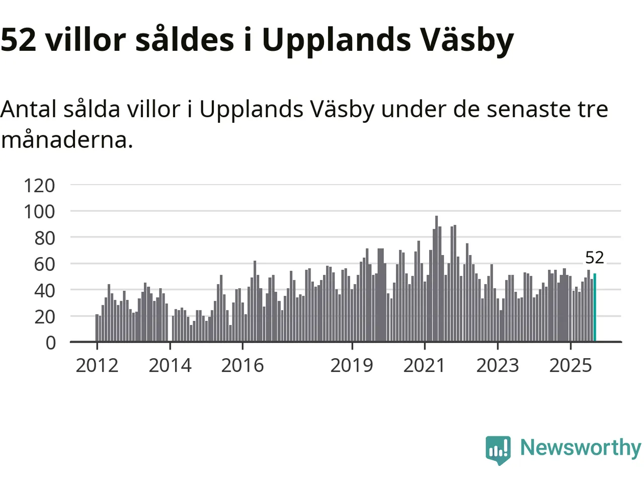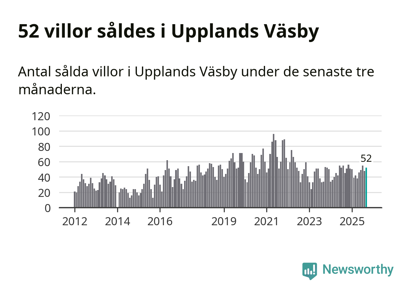 Sammanlagt såldes 52 villor i Upplands Väsby kommun mellan juli och september till ett genomsnittligt pris på 5,5 miljoner kronor. I fjol gjordes 45 affärer vid den här tiden på året.