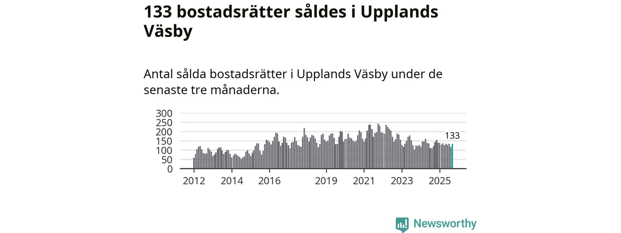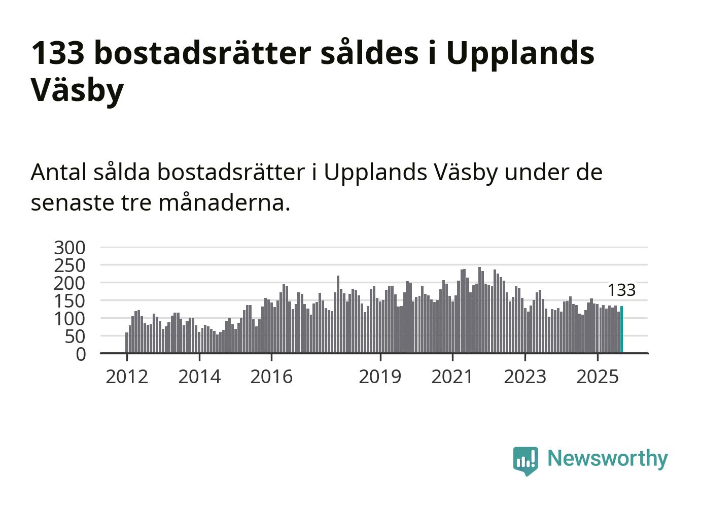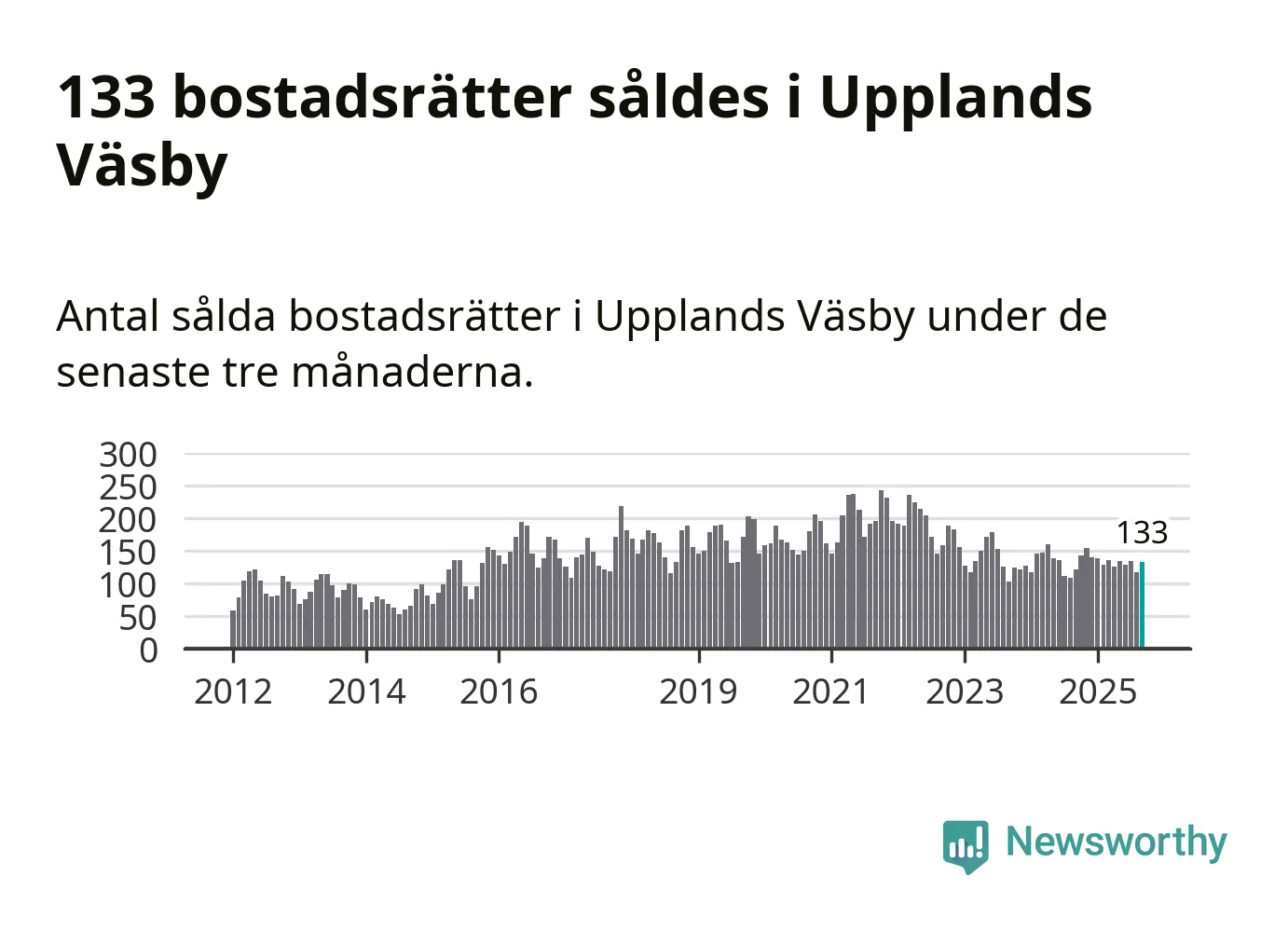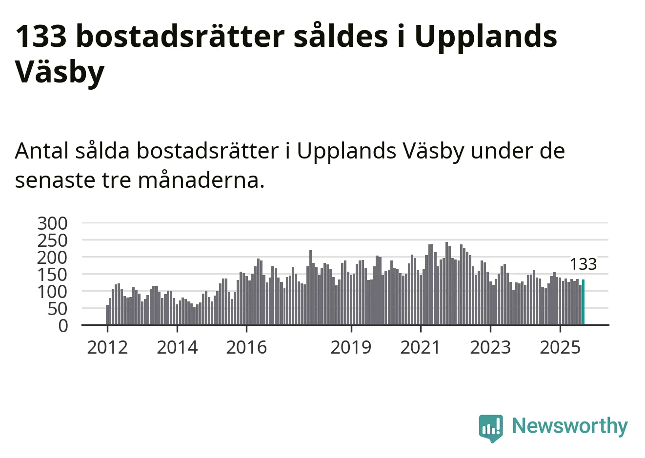 Sammanlagt såldes 133 bostadsrätter i Upplands Väsby kommun mellan juli och september till ett genomsnittligt pris på 2,2 miljoner kronor. I fjol gjordes 122 affärer vid den här tiden på året.