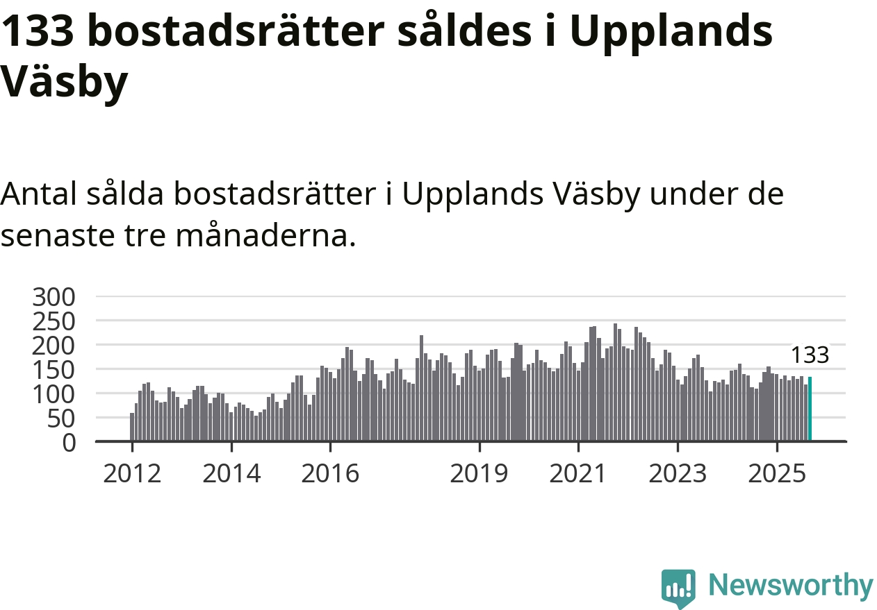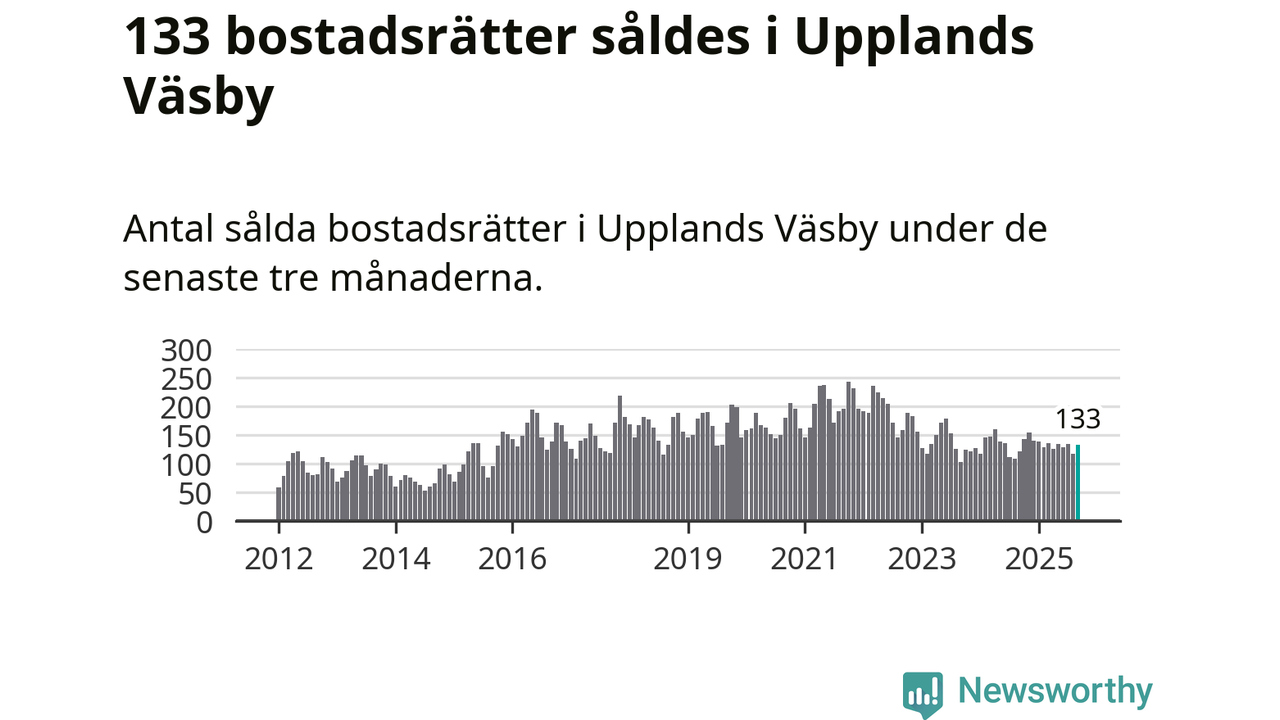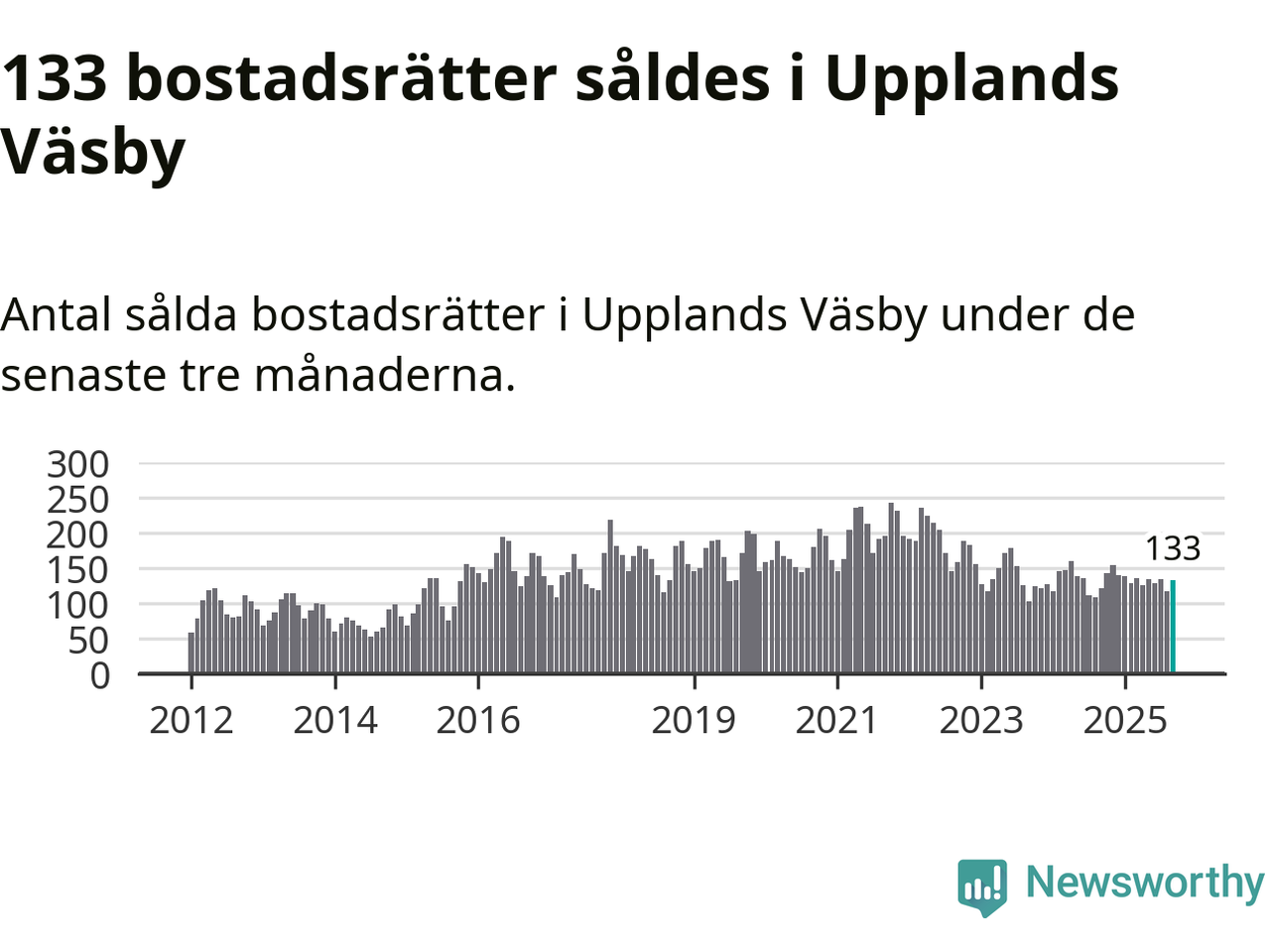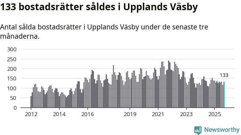 Sammanlagt såldes 133 bostadsrätter i Upplands Väsby kommun mellan juli och september till ett genomsnittligt pris på 2,2 miljoner kronor. I fjol gjordes 122 affärer vid den här tiden på året.