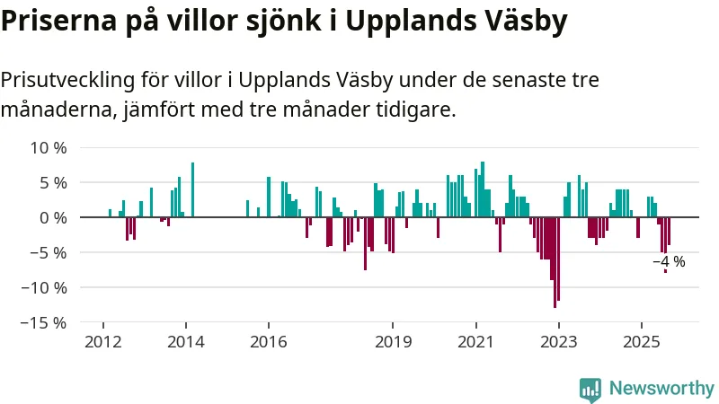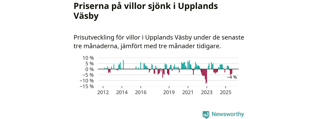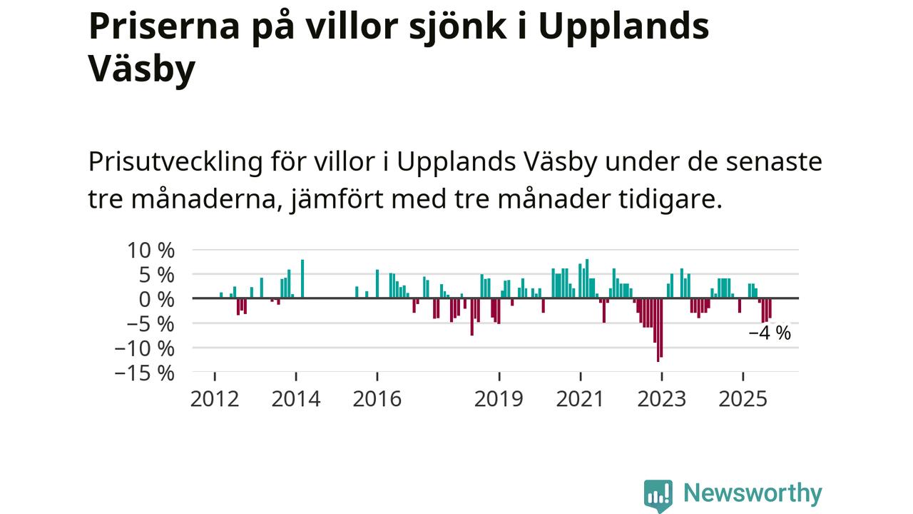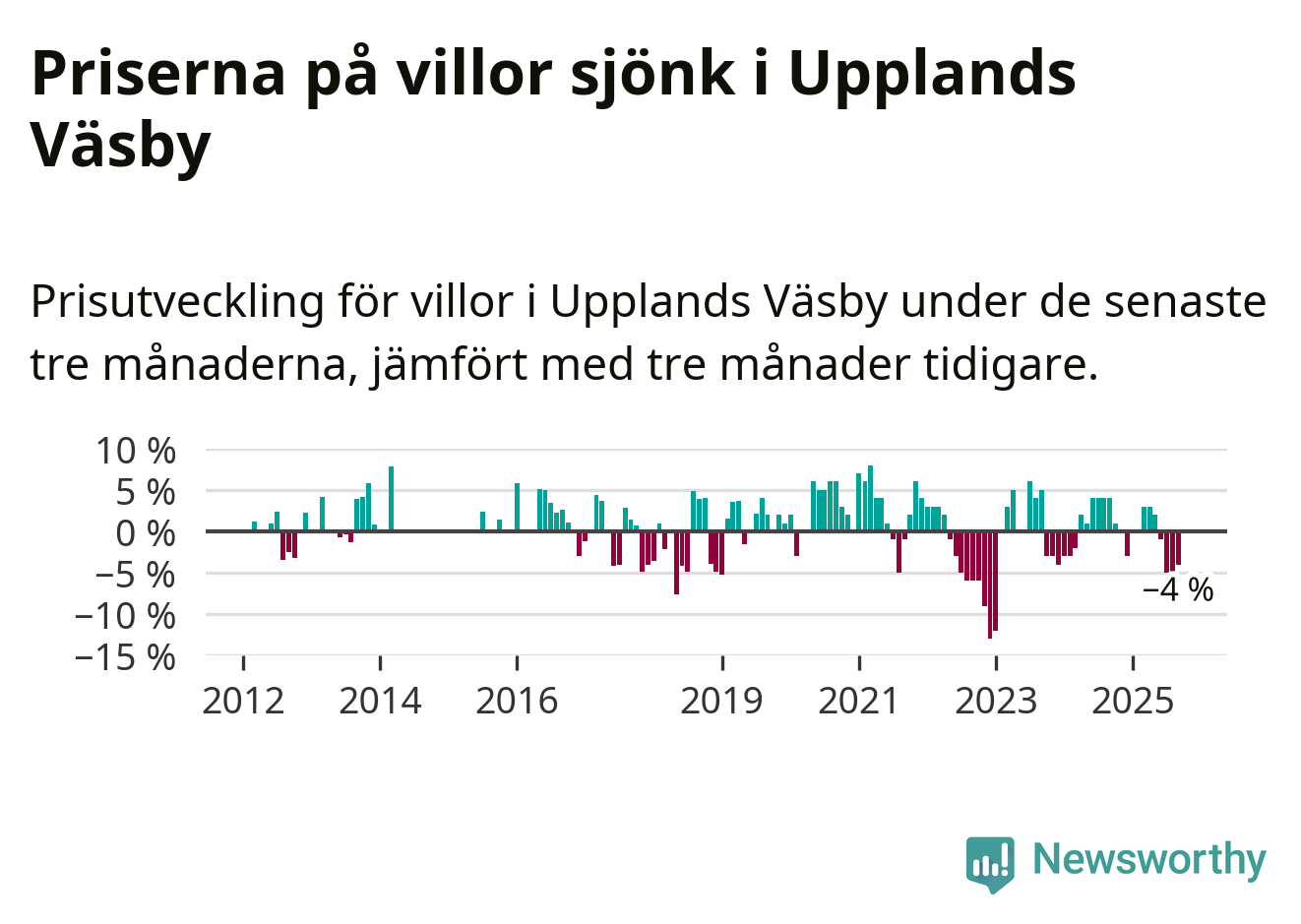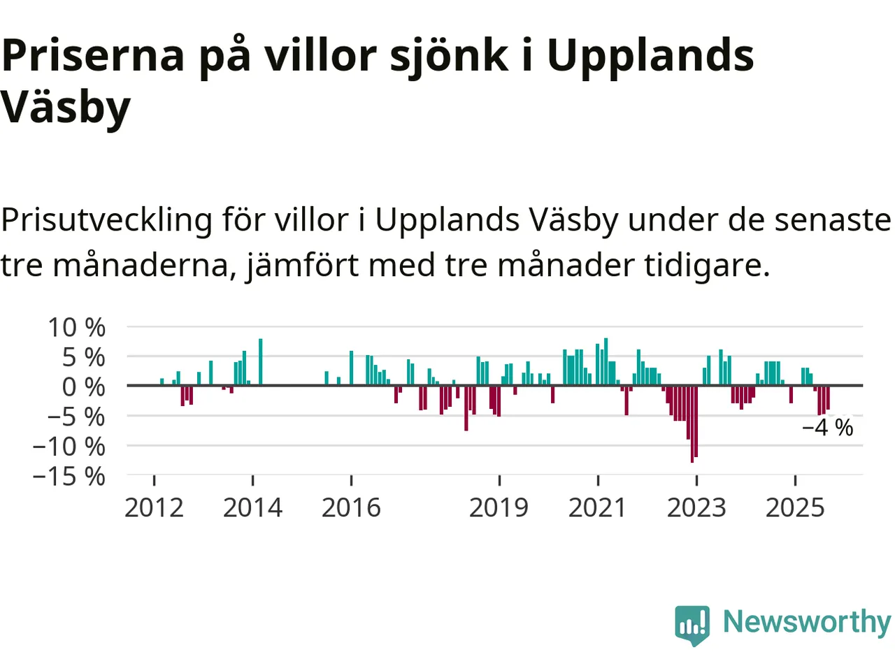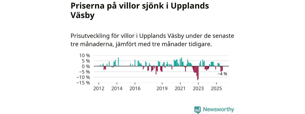 Villapriserna har gått ner i Upplands Väsby kommun. Medelpriset på försäljningarna under de senaste tre månaderna visar på en nedgång med 4 procent.