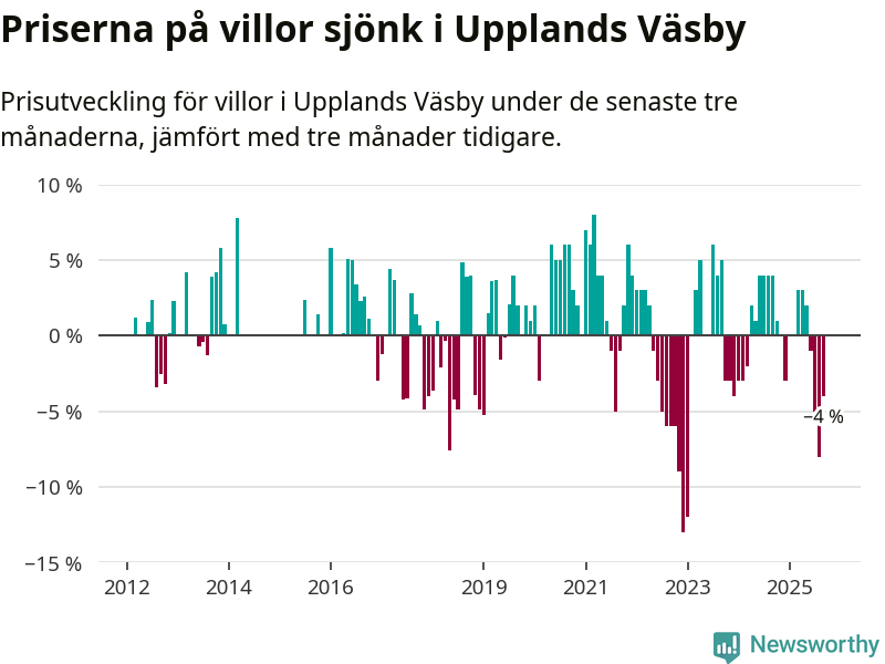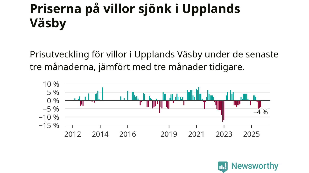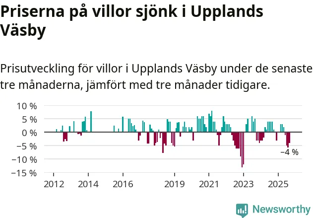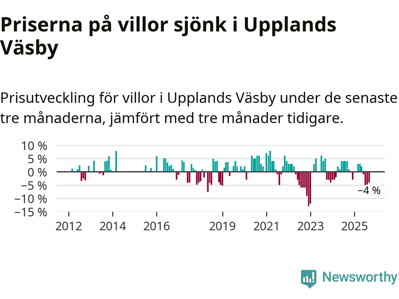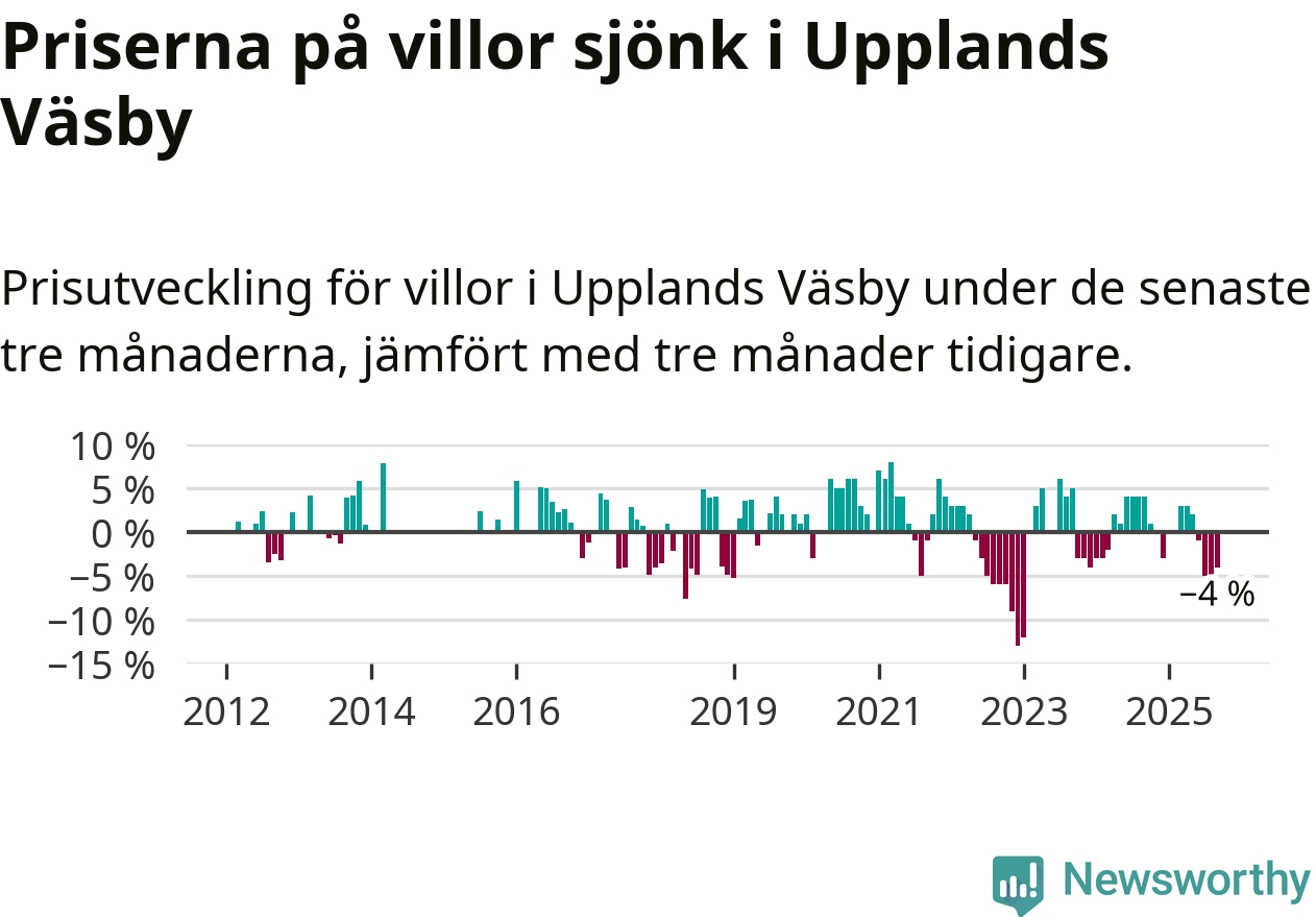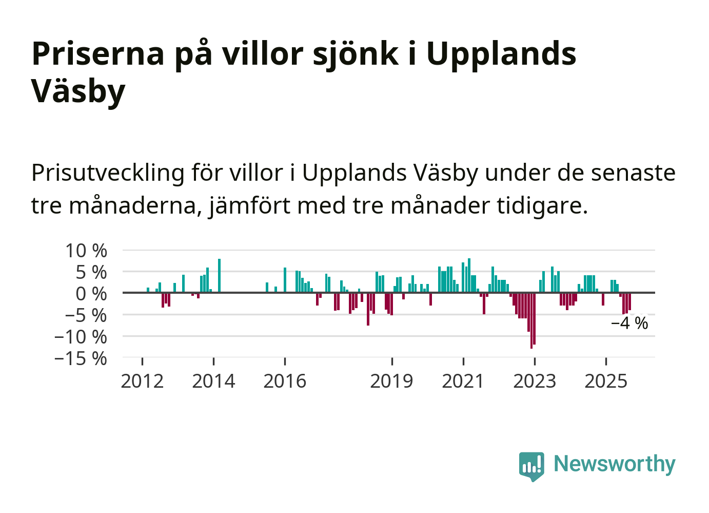 Villapriserna har gått ner i Upplands Väsby kommun. Medelpriset på försäljningarna under de senaste tre månaderna visar på en nedgång med 4 procent.