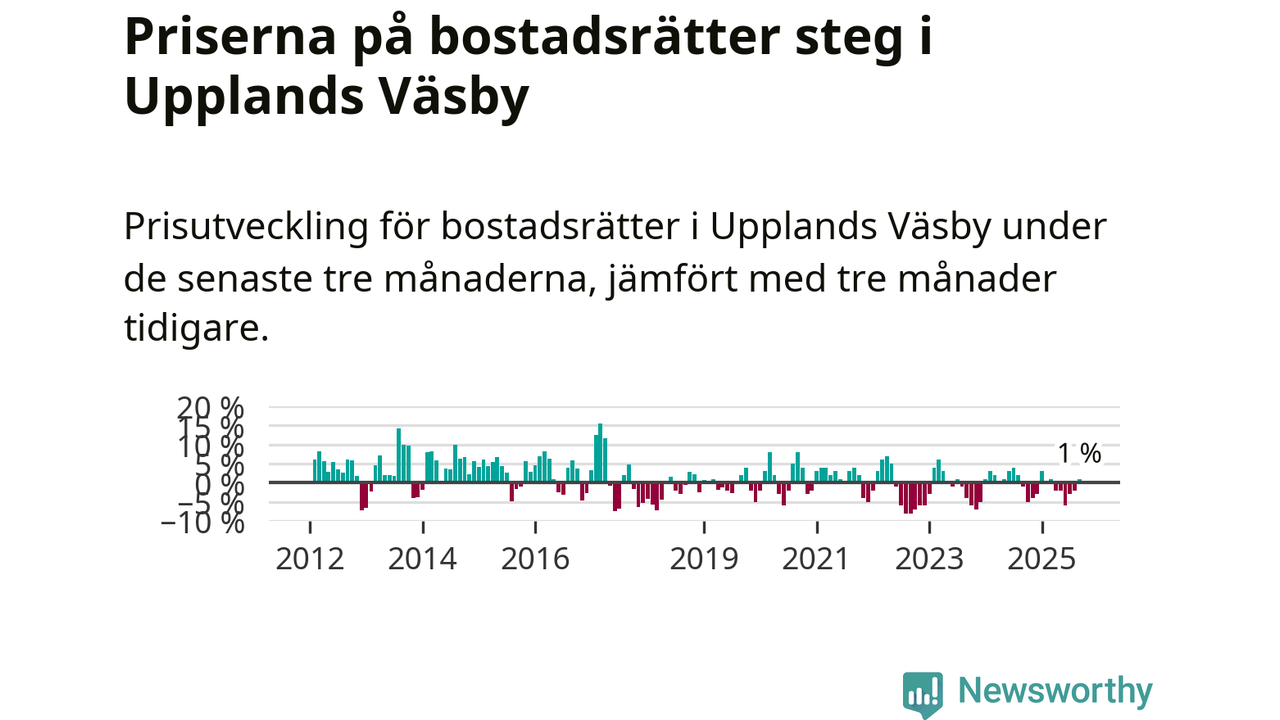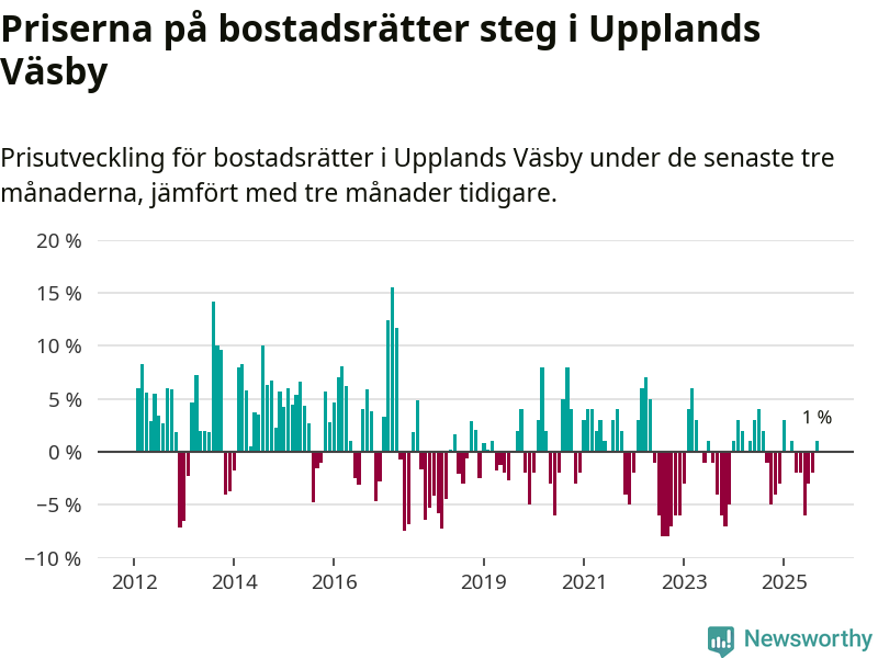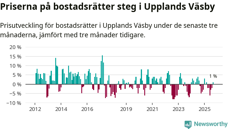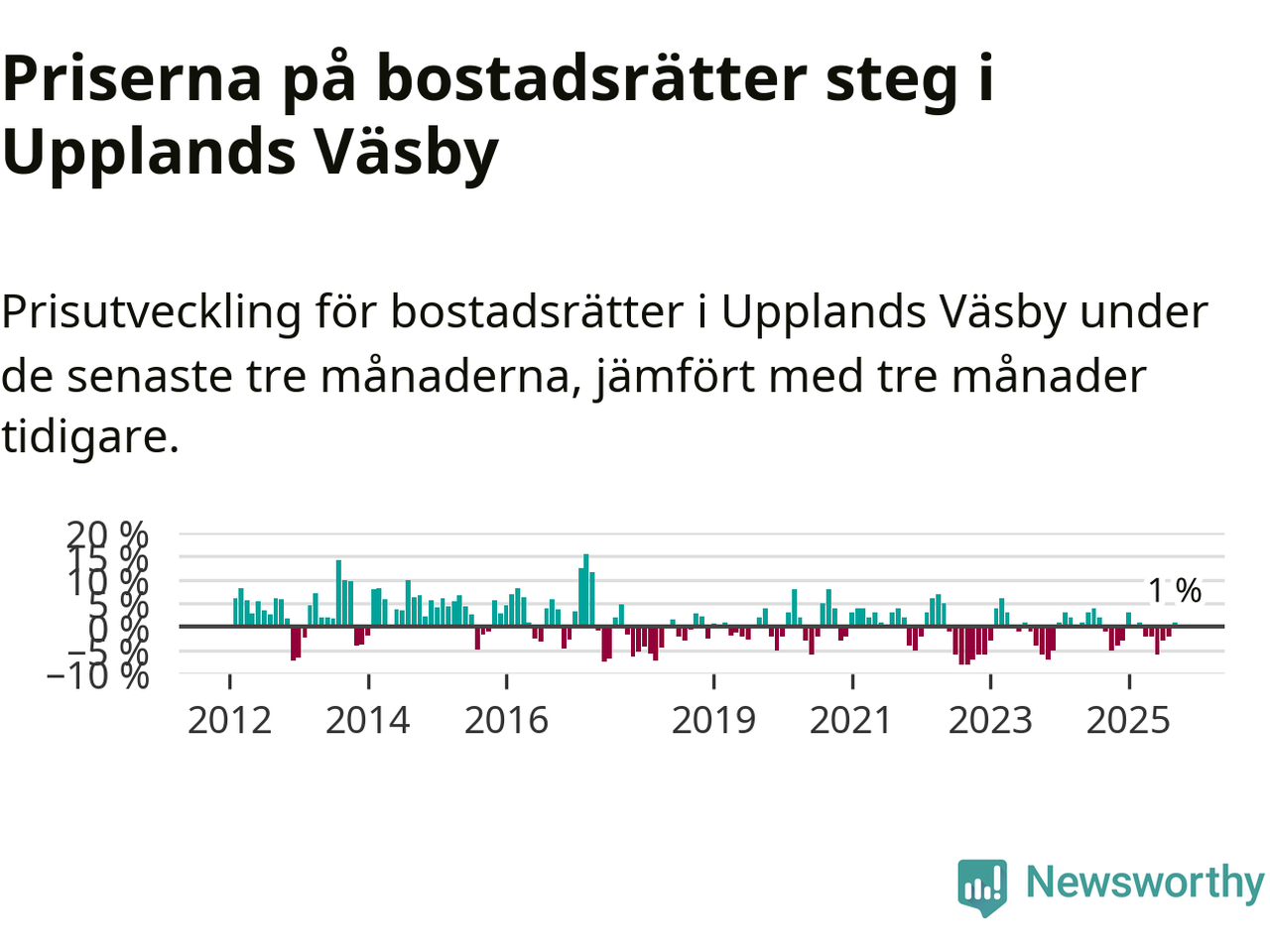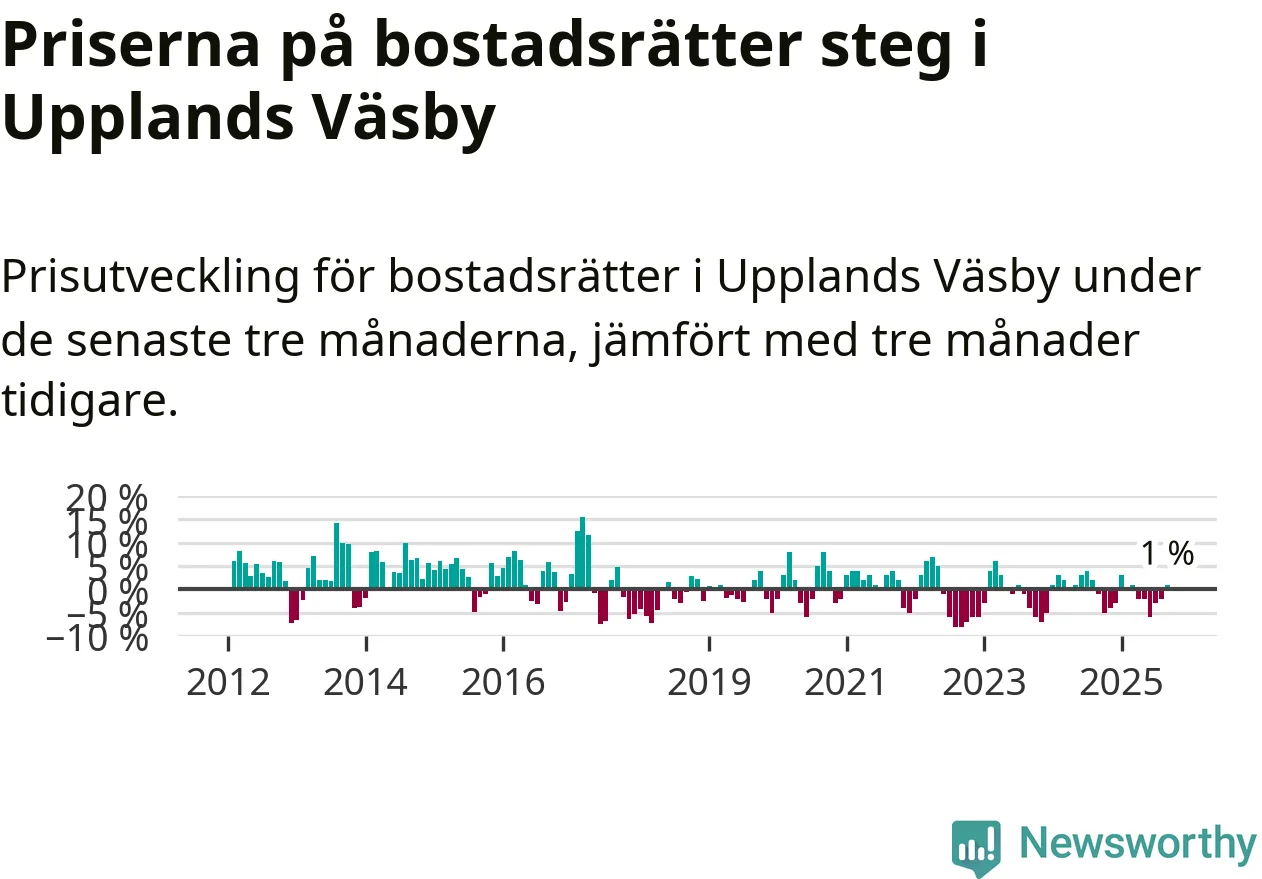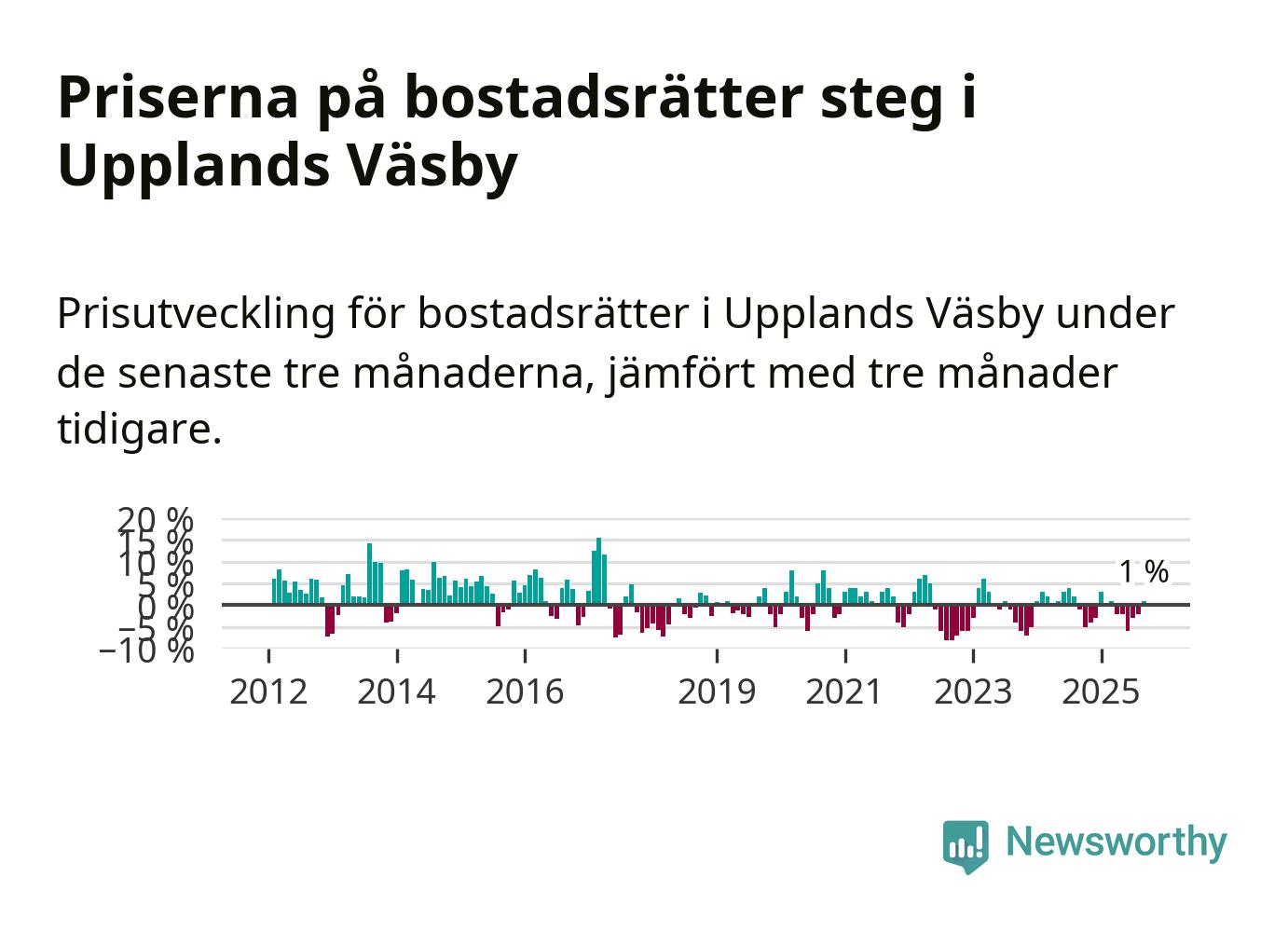 Priserna på bostadsrätter har gått upp i Upplands Väsby kommun. Medelpriset på försäljningarna under de senaste tre månaderna visar på en uppgång med 1 procent.
