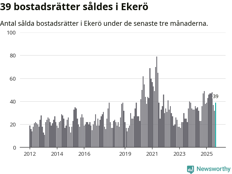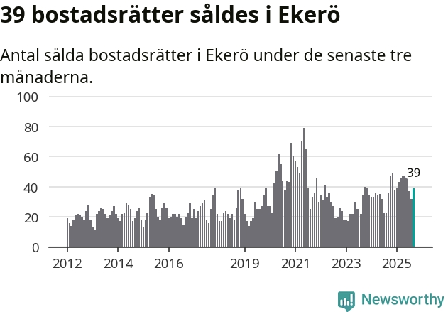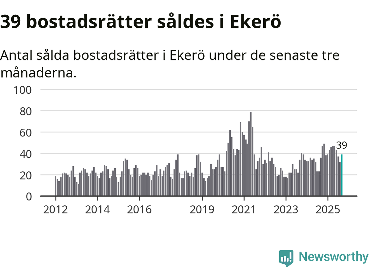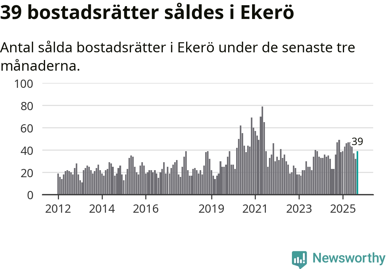 Mellan juli och september gjordes sammanlagt 39 affärer med bostadsrätter i Ekerö kommun. Det kan jämföras med 36 vid motsvarande tid i fjol.