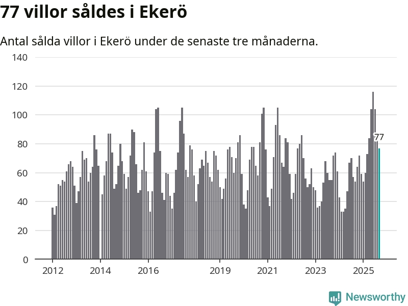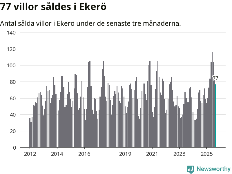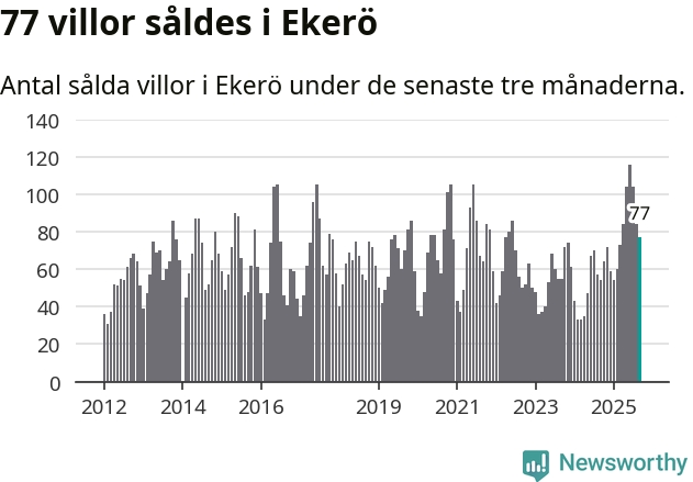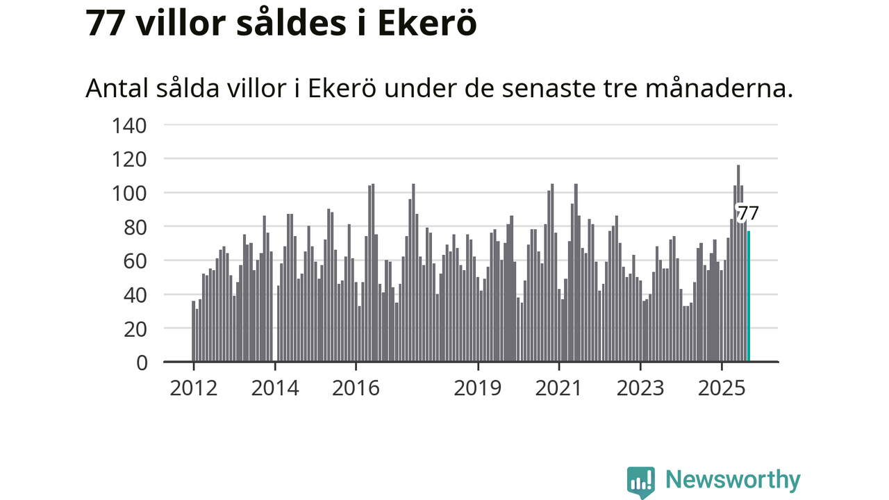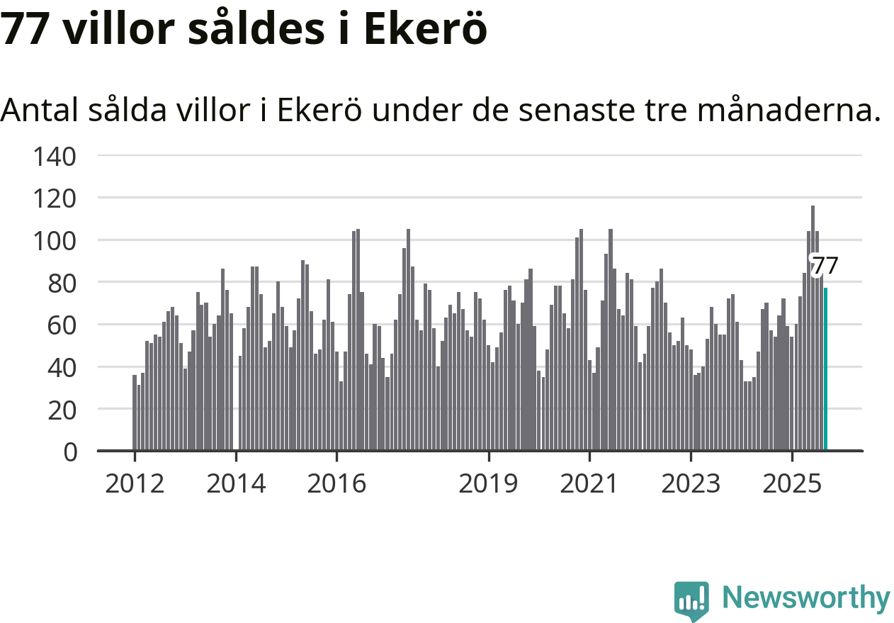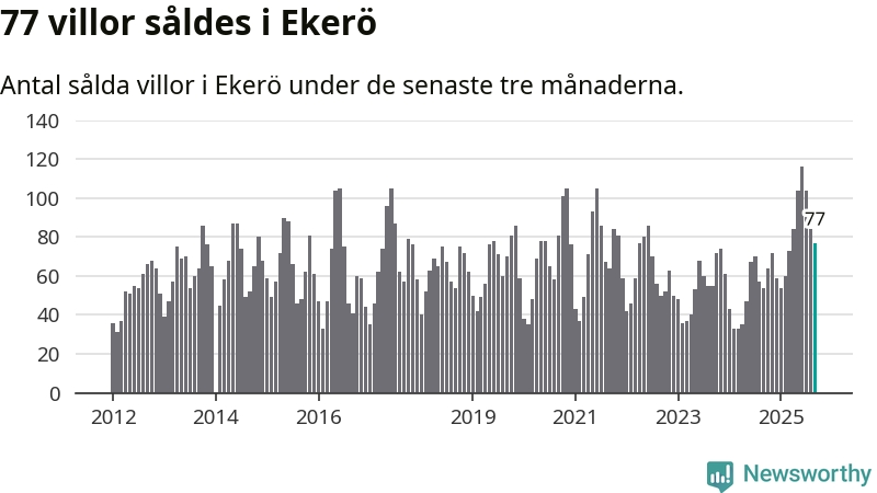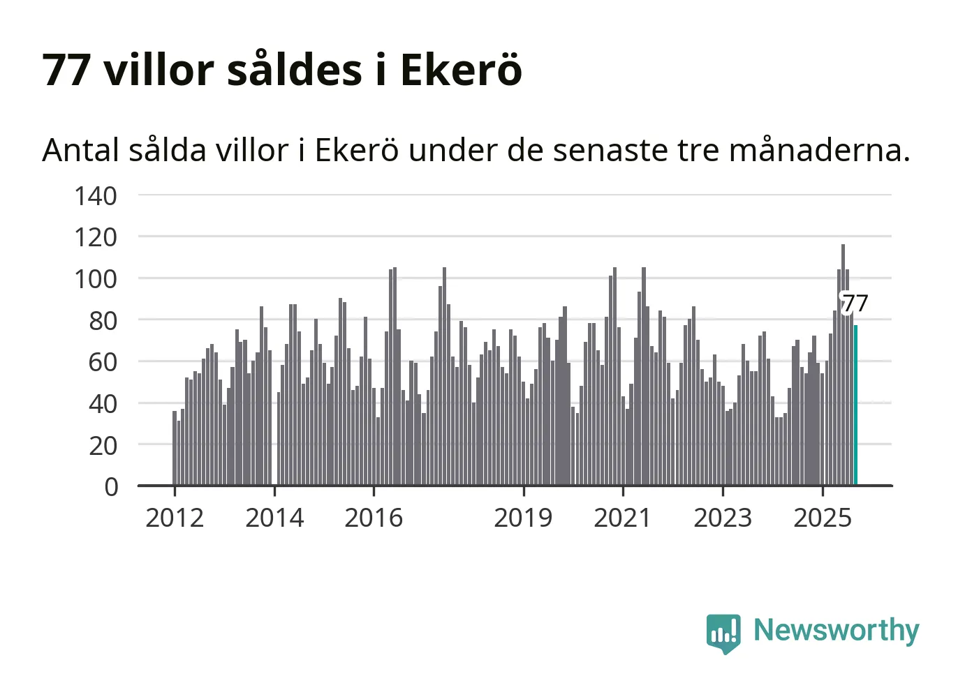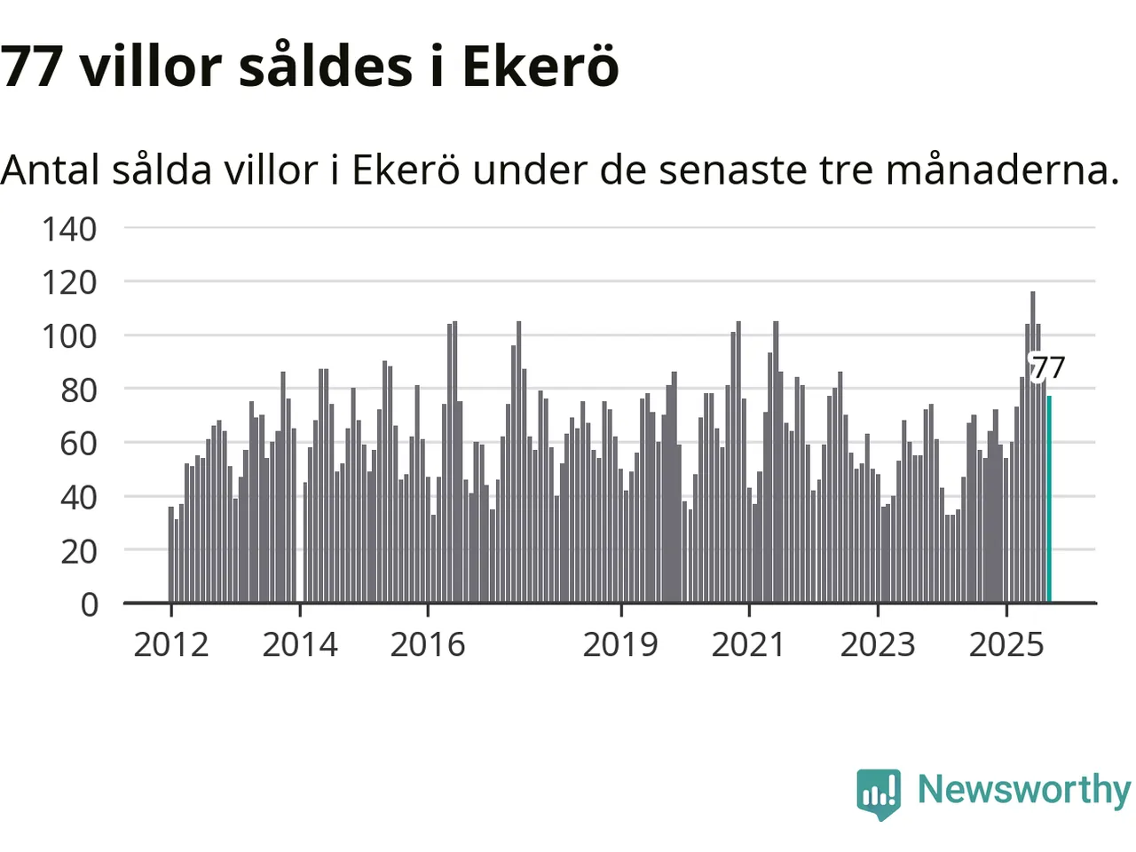 Sammanlagt såldes 77 villor i Ekerö kommun mellan juli och september till ett genomsnittligt pris på 7,0 miljoner kronor. I fjol gjordes 54 affärer vid den här tiden på året.