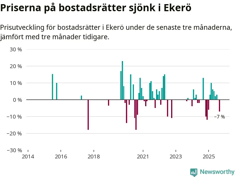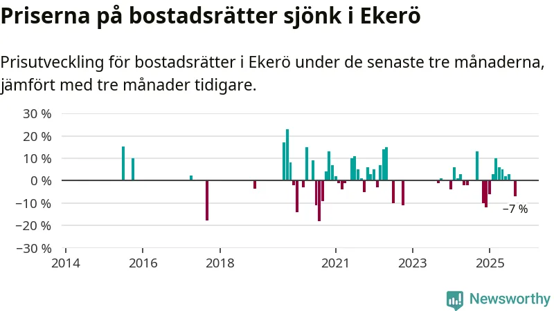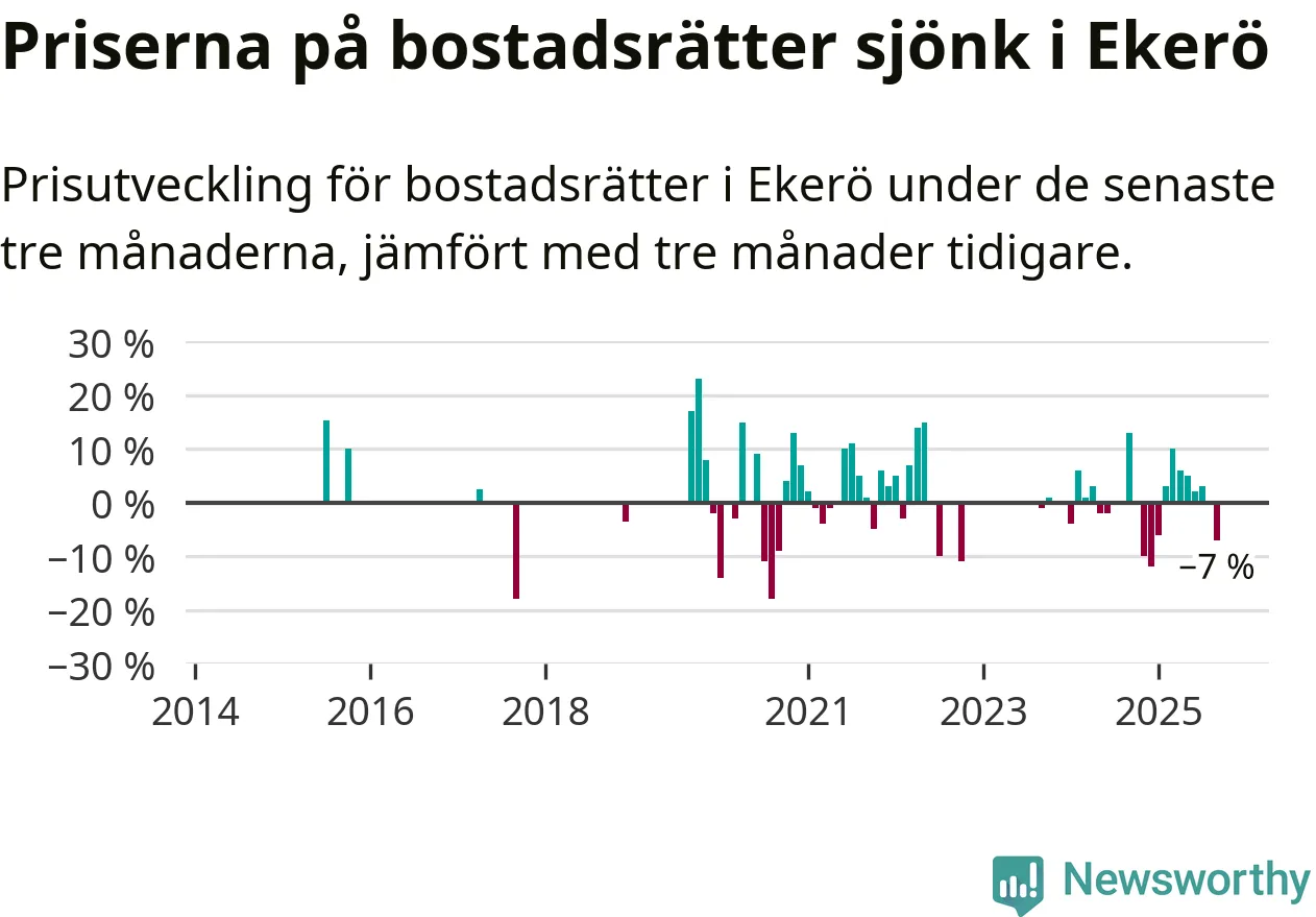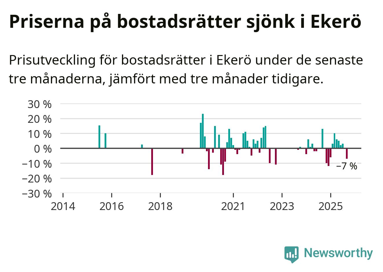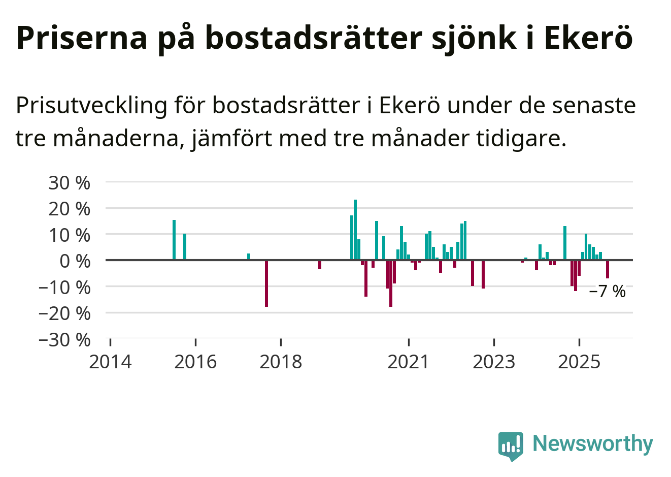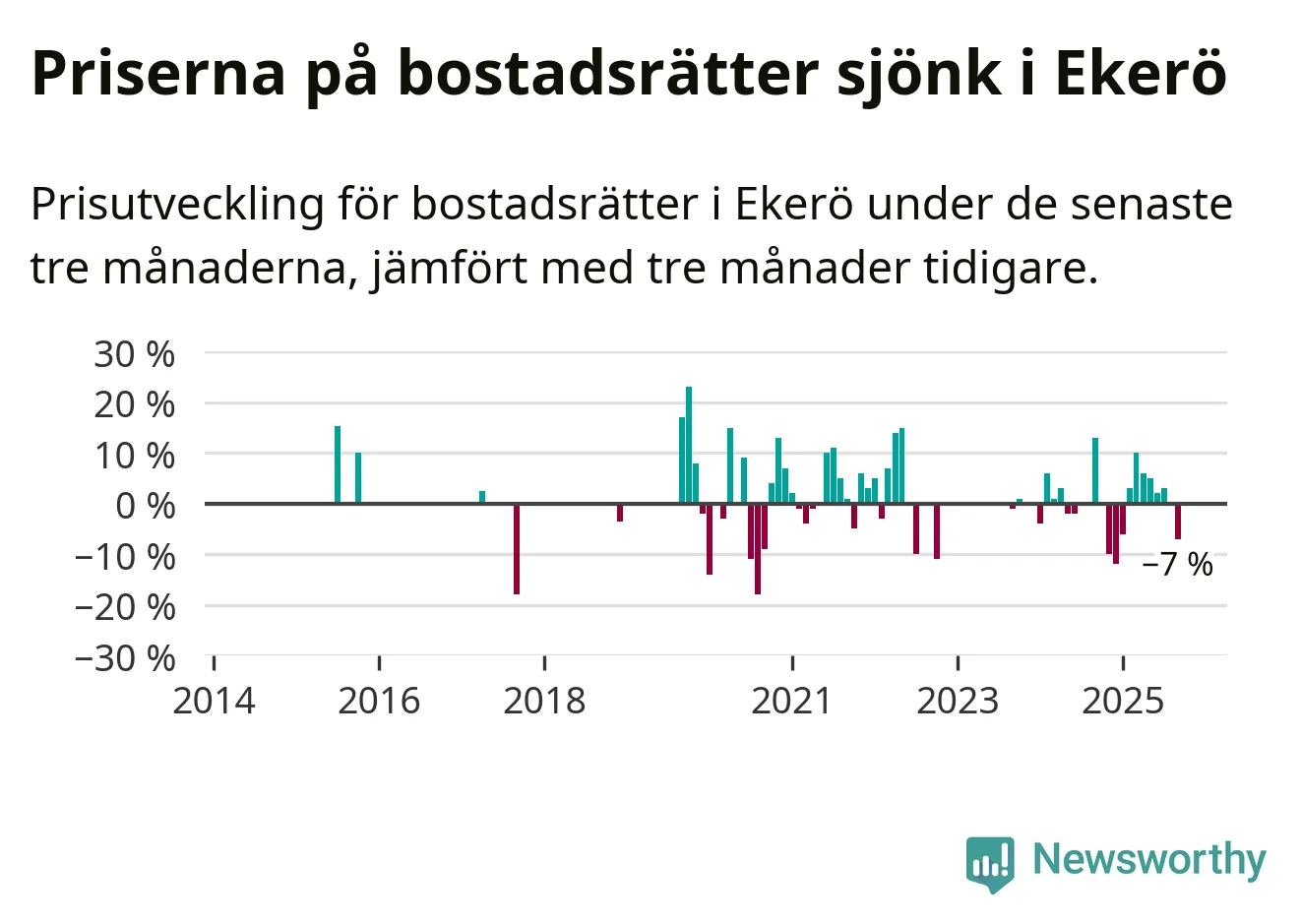 Statistiken visar även på en kännbar prisnedgång i Ekerö kommun. Medelpriset på försäljningarna av bostadsrätter i kommunen var 7 procent lägre än för tre månader sedan. Även i hela Stockholms län sjunker priserna på bostadsrätter. I hela länet noterades en prisnedgång på 2 procent.
