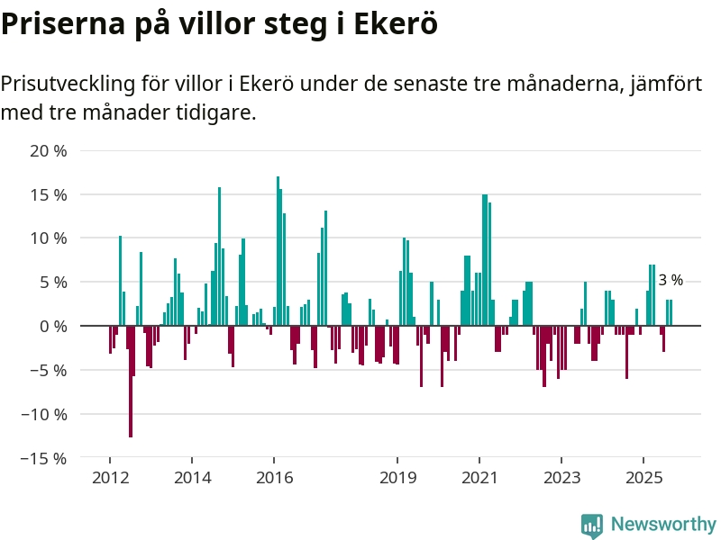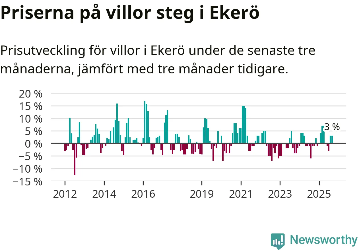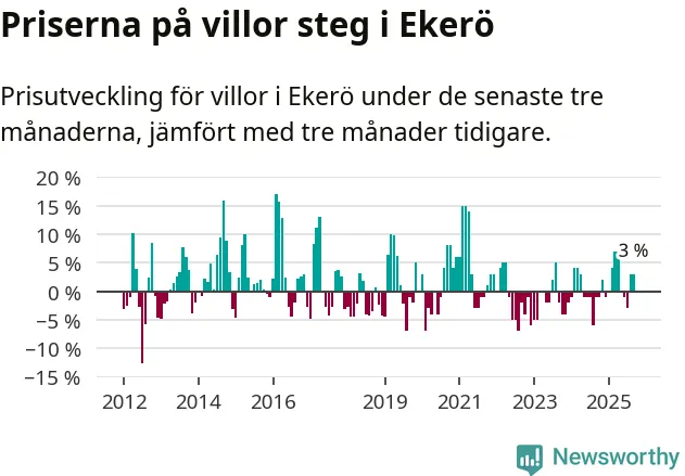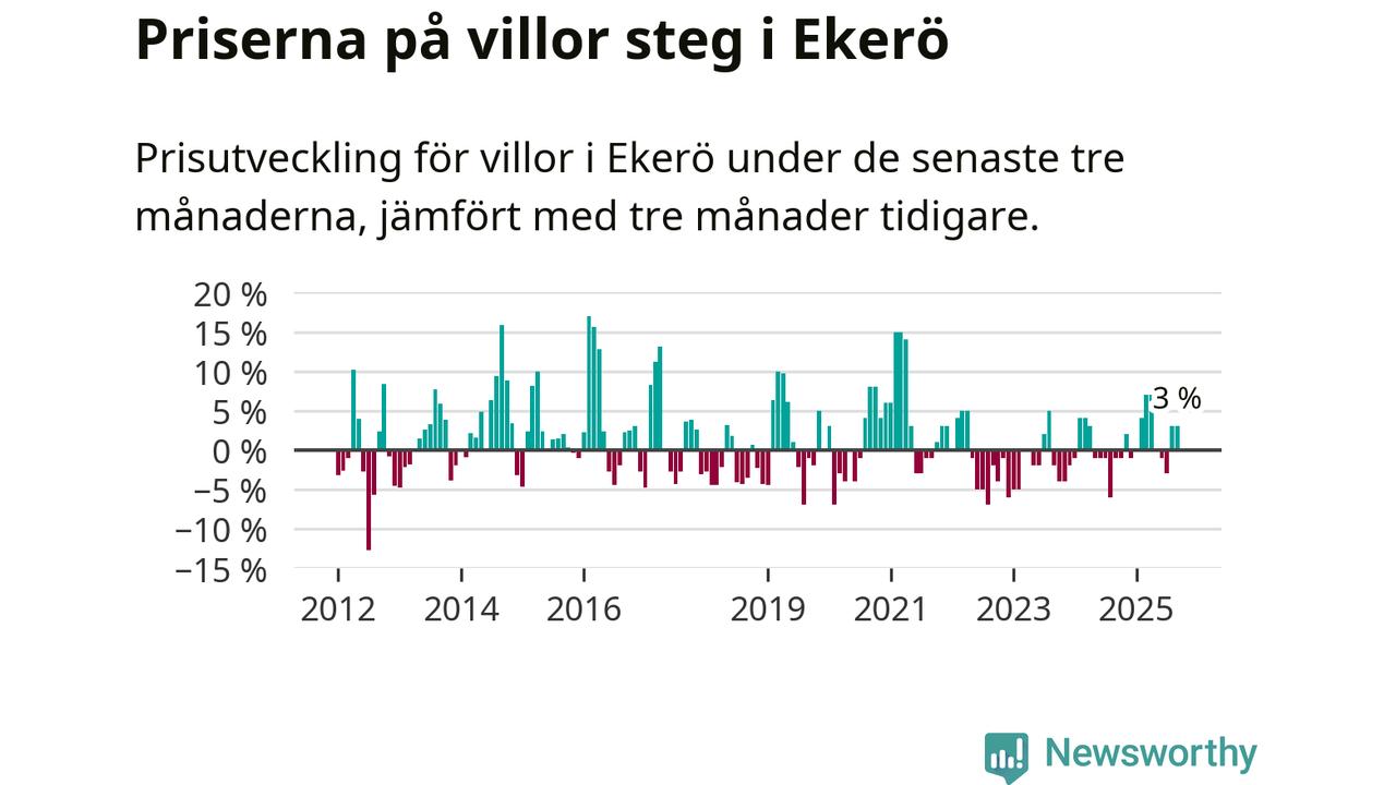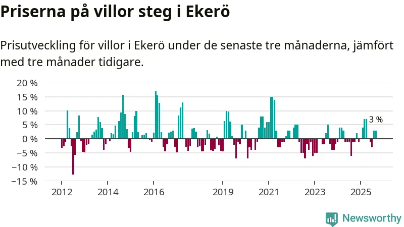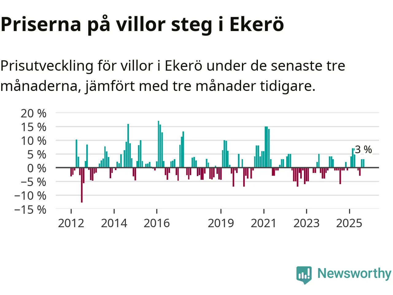 Villapriserna har gått upp i Ekerö kommun. Medelpriset på försäljningarna under de senaste tre månaderna visar på en uppgång med 3 procent.