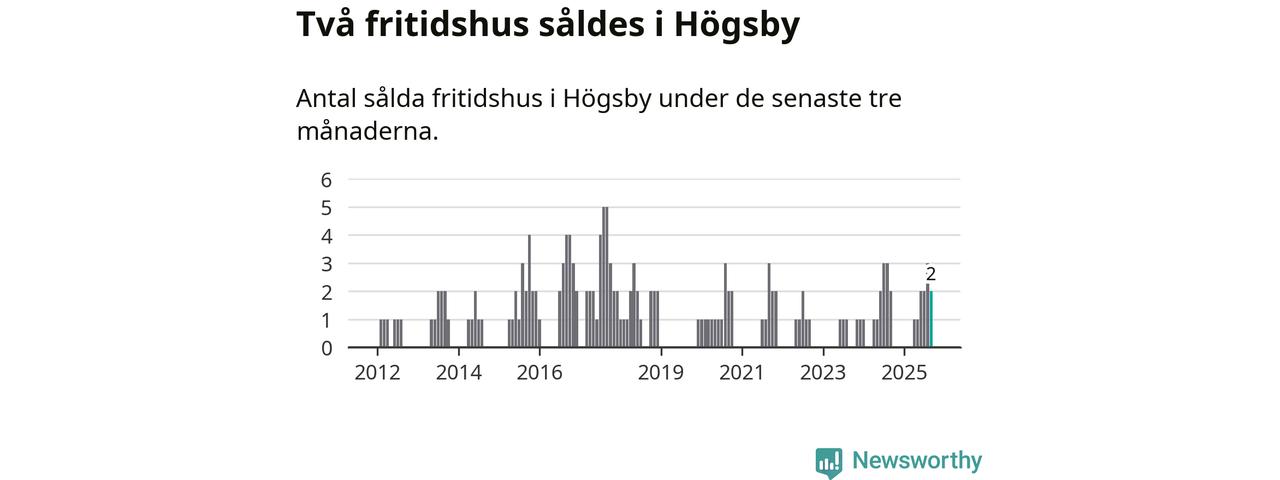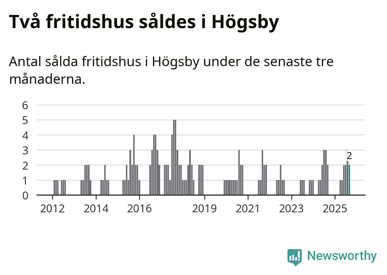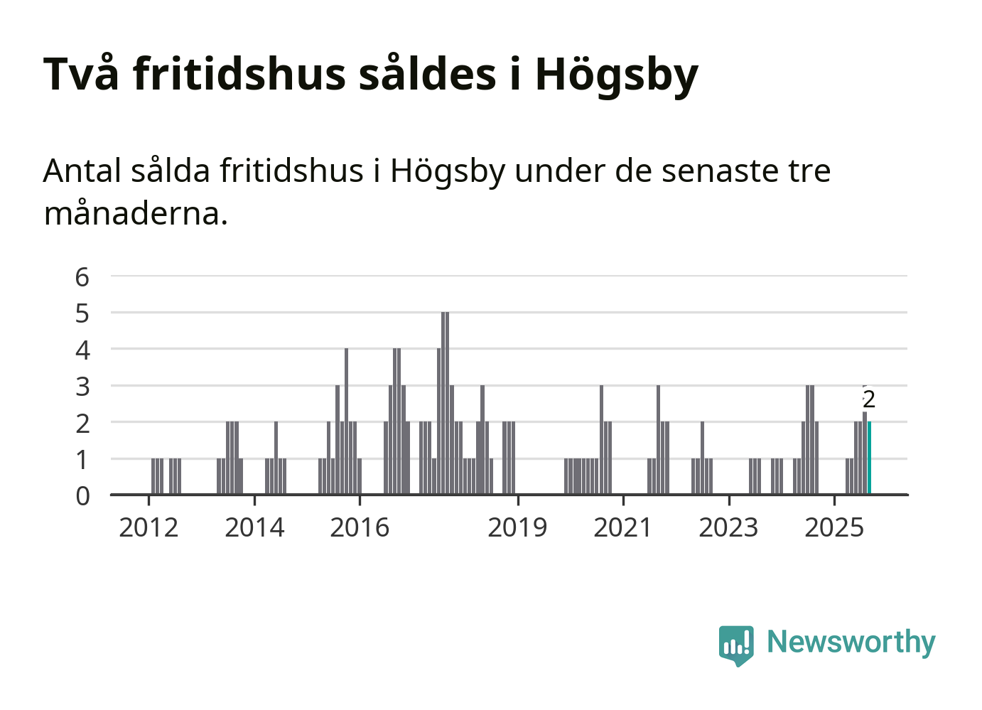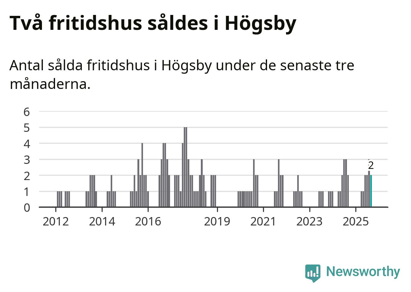 Mellan juli och september gjordes sammanlagt två affärer med fritidshus i Högsby kommun. Det är lika många affärer som vid motsvarande tid i fjol.