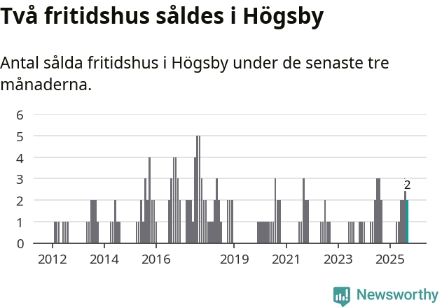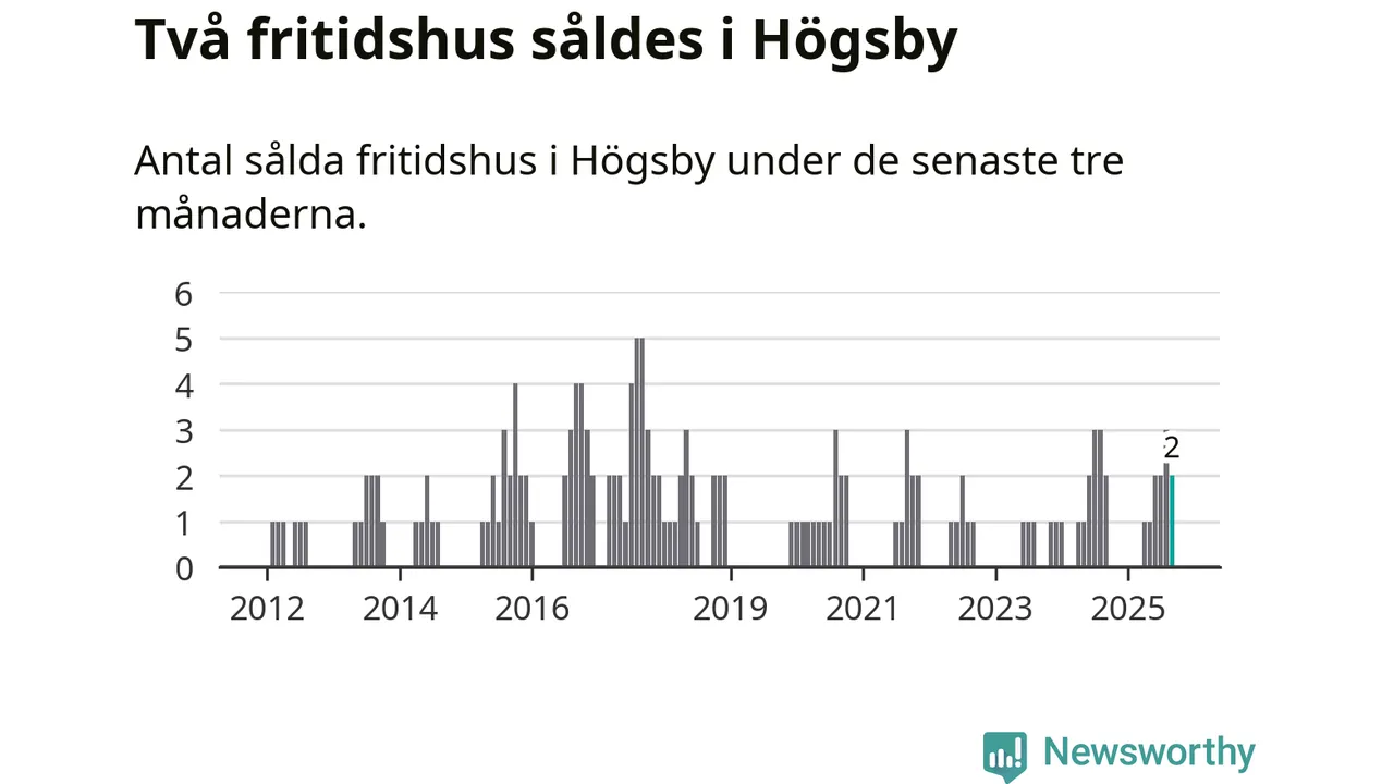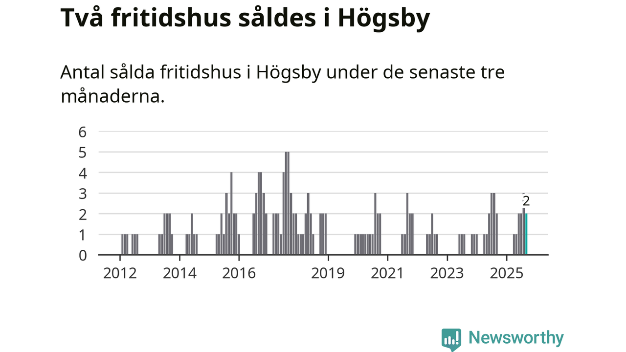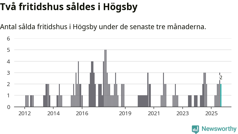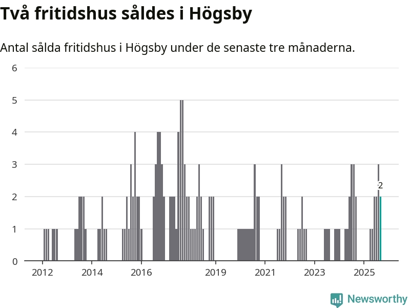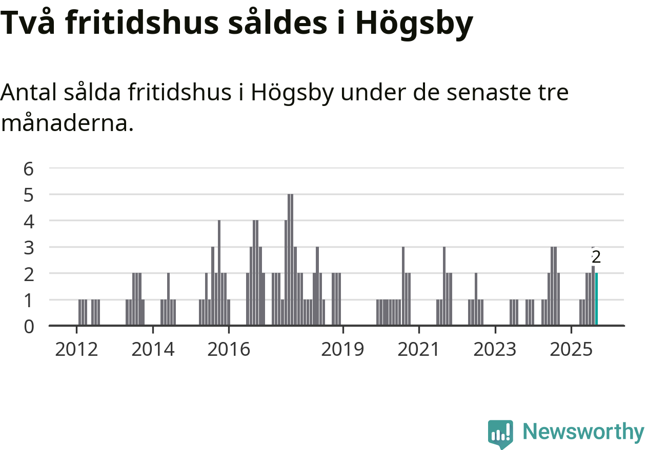 Mellan juli och september gjordes sammanlagt två affärer med fritidshus i Högsby kommun. Det är lika många affärer som vid motsvarande tid i fjol.