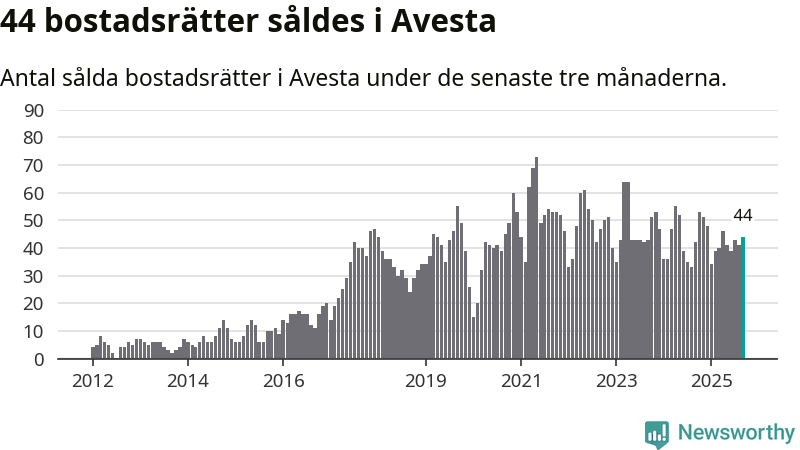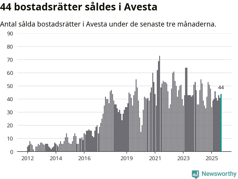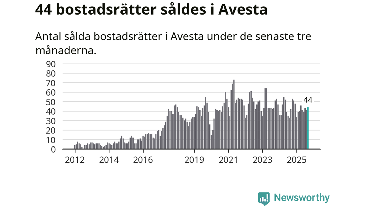 Sammanlagt såldes 44 bostadsrätter i Avesta kommun mellan juli och september till ett genomsnittligt pris på 0,5 miljoner kronor. I fjol gjordes 42 affärer vid den här tiden på året.